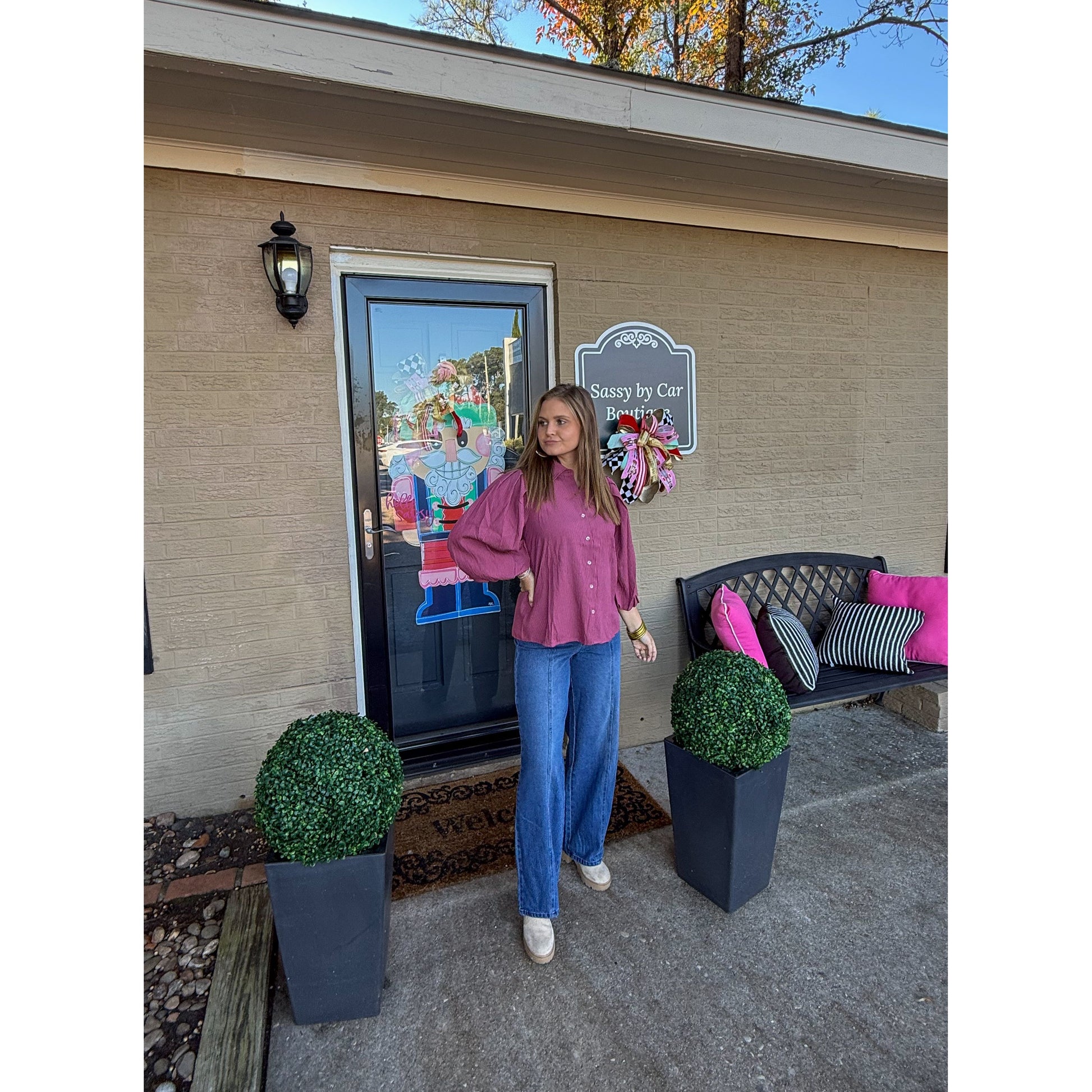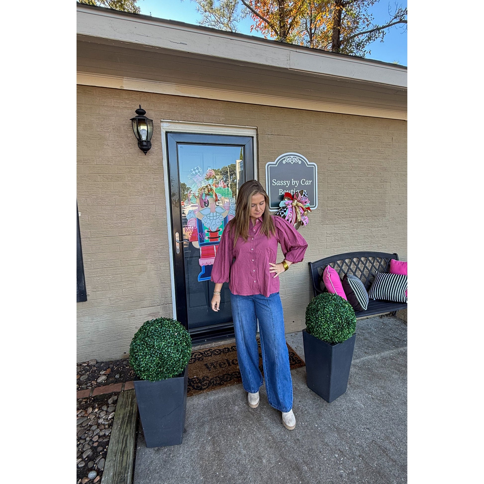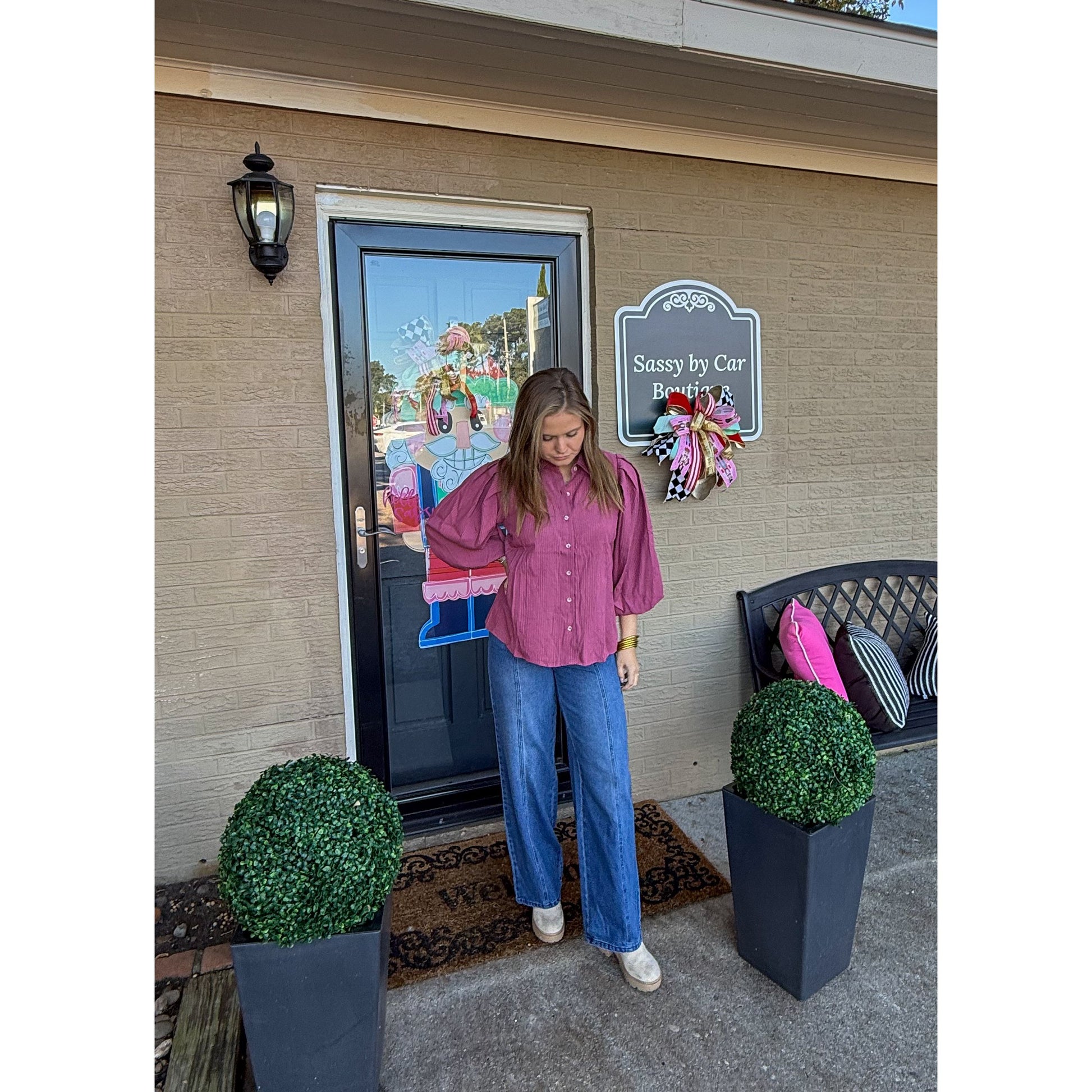 Pink stripe detail blouse. 3/4 sleeve with balloon detail. Collar and button down detail. Loose fitting blouse.