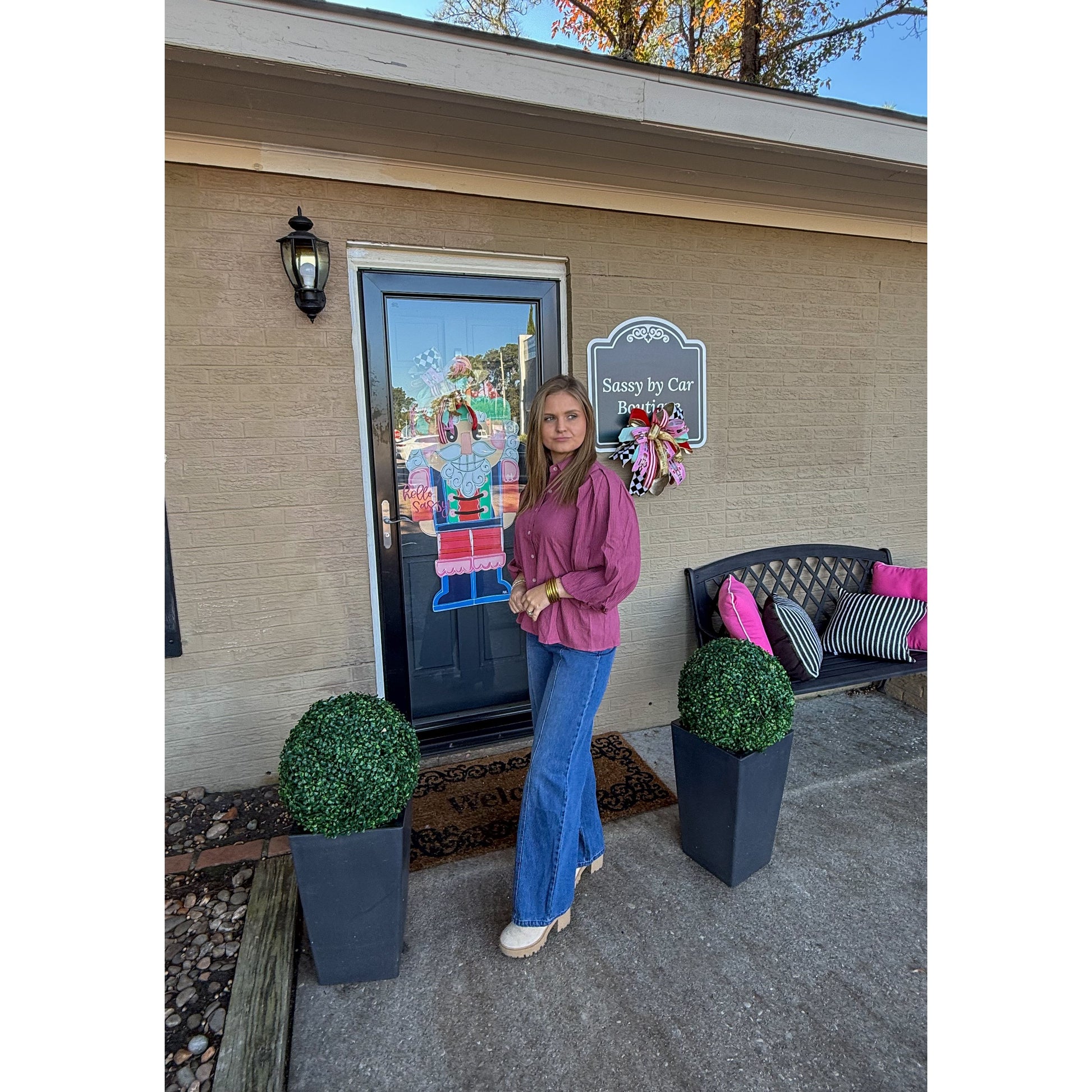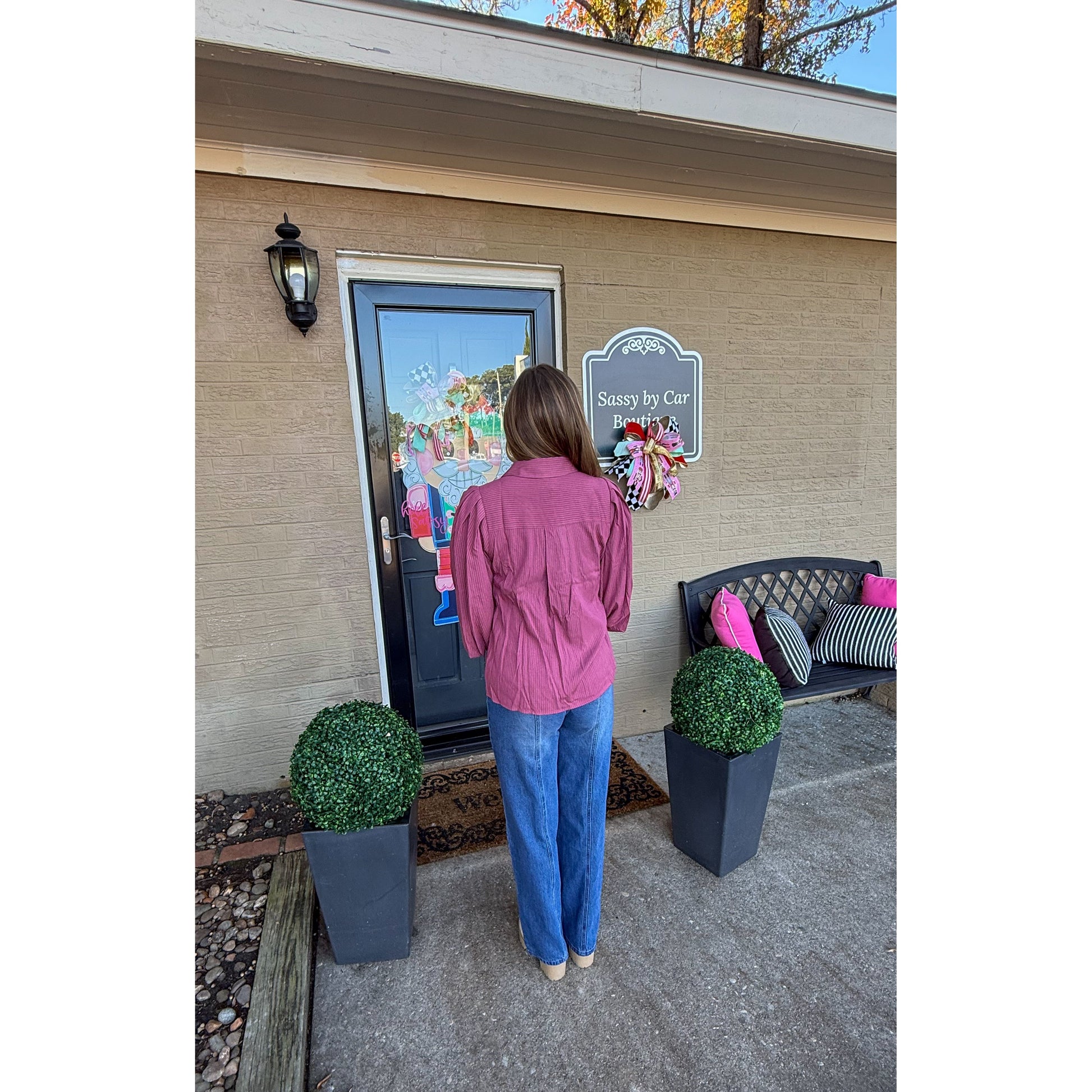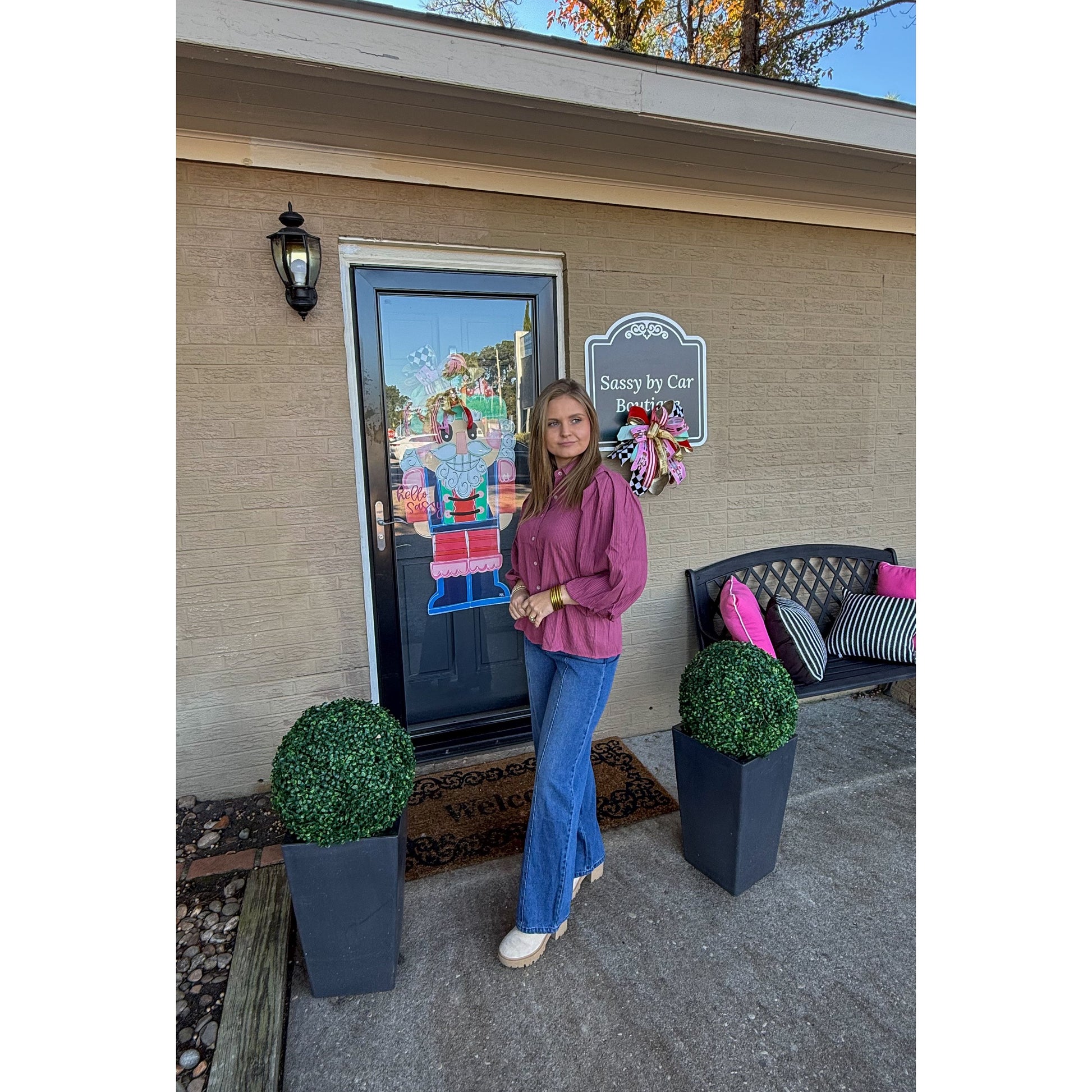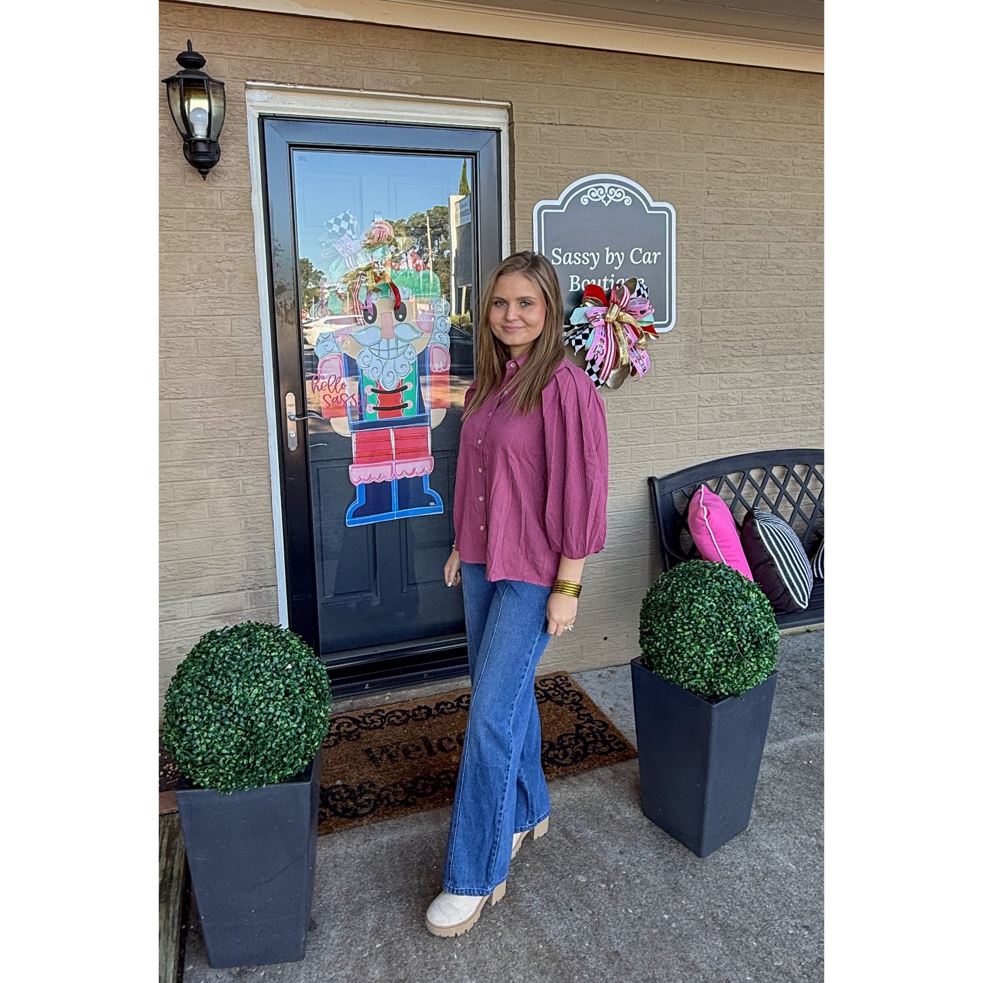 Pink stripe detail blouse. 3/4 sleeve with balloon detail. Collar and button down detail. Loose fitting blouse.