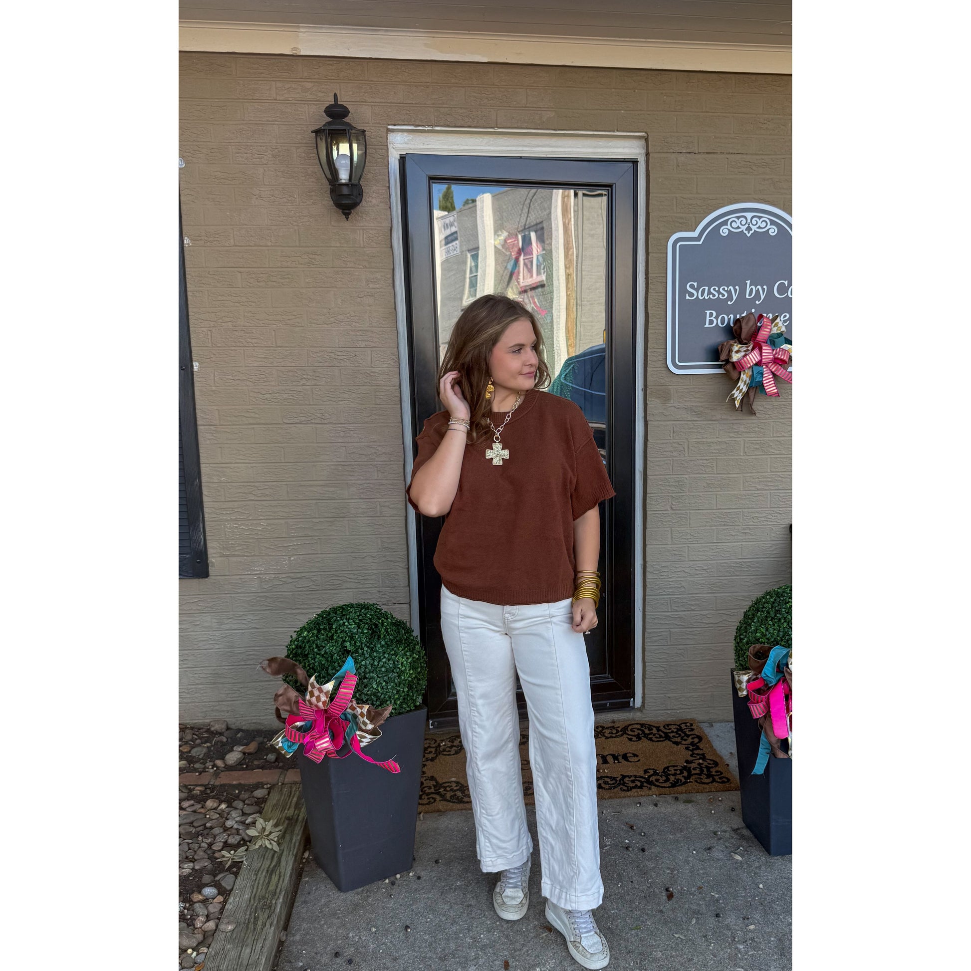 Lightweight short sleeve knit top in coco.