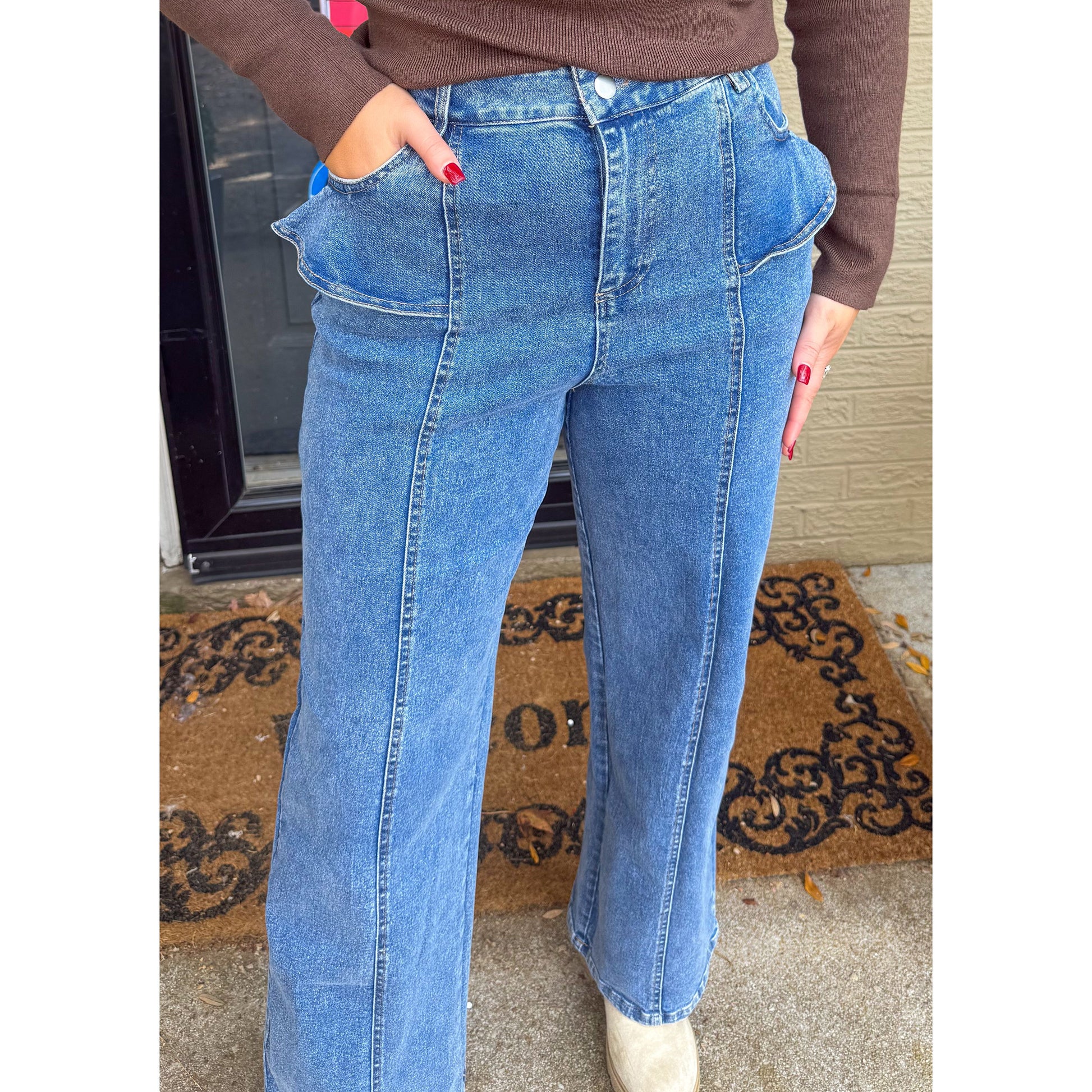 Medium wash wide leg jeans. Ruffle detail on the trim of pockets.