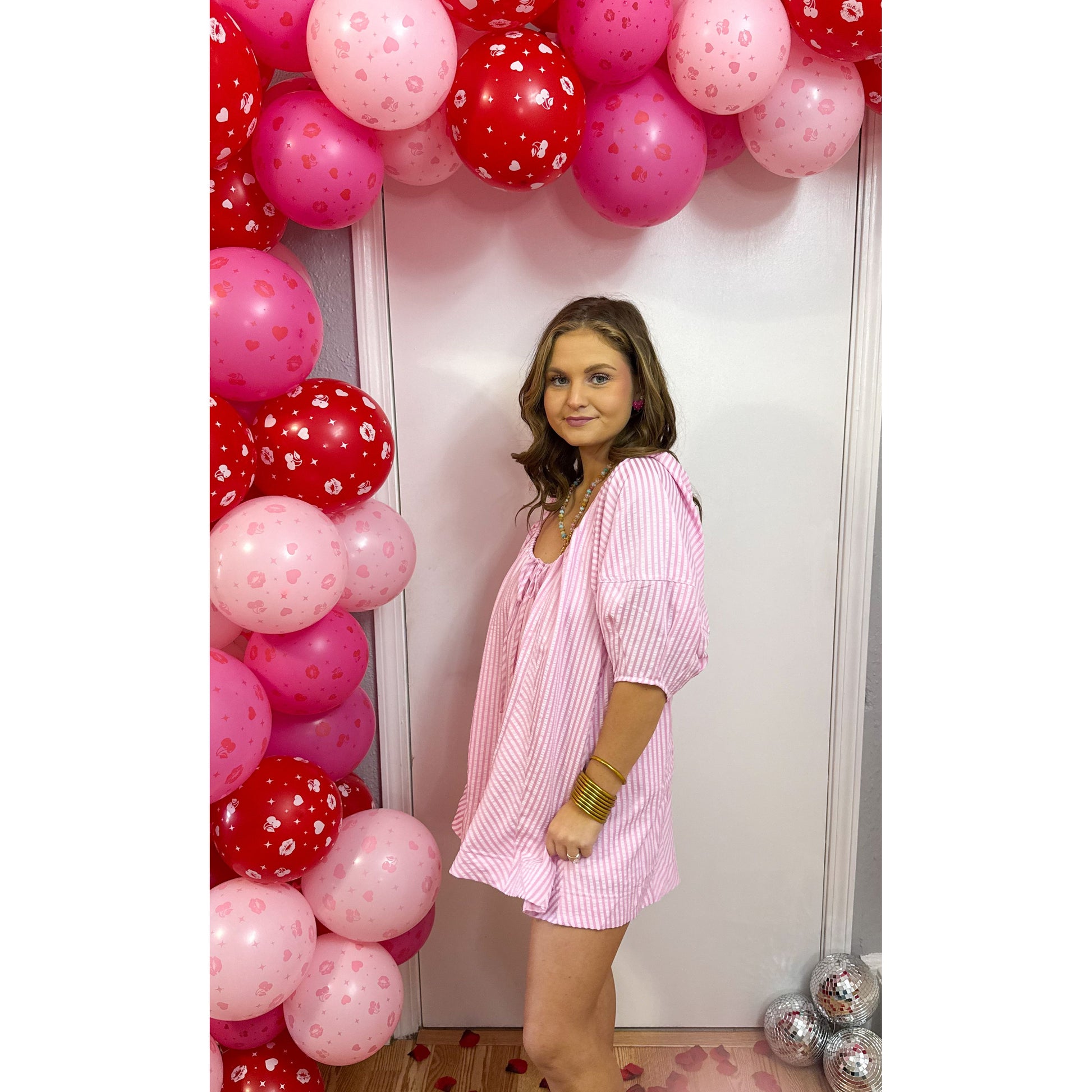 An everyday beauty! Light pink/dark pink stripe detail romper. Great to throw on & go. Loose fitting. Scoop neckline with keyhole detail on the front, puff sleeves, keyhole closure on the back, & pockets.