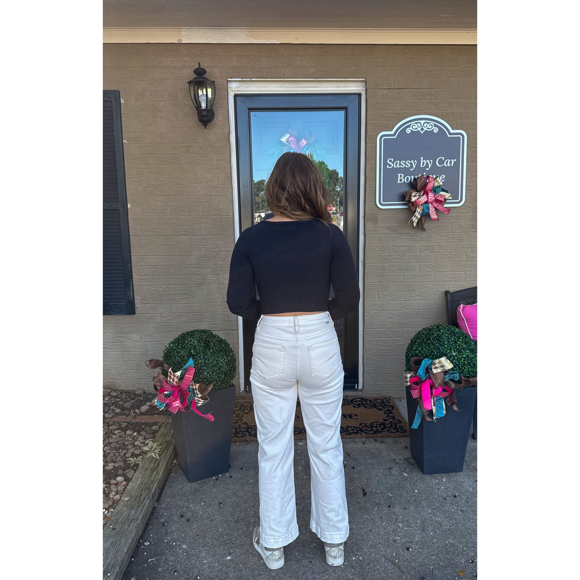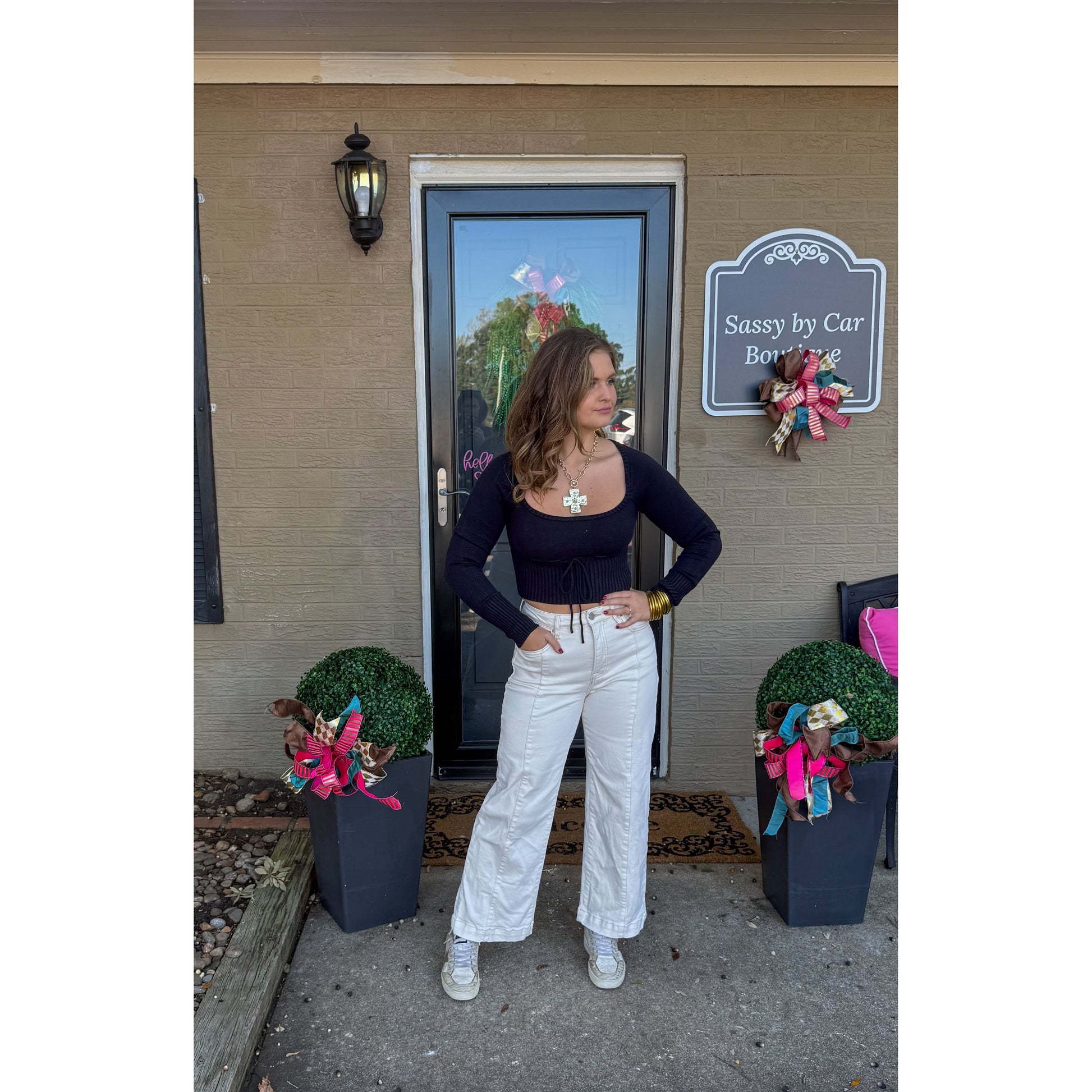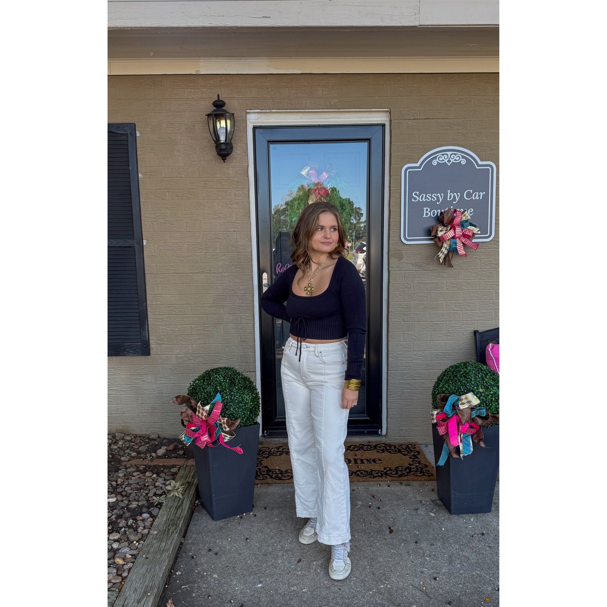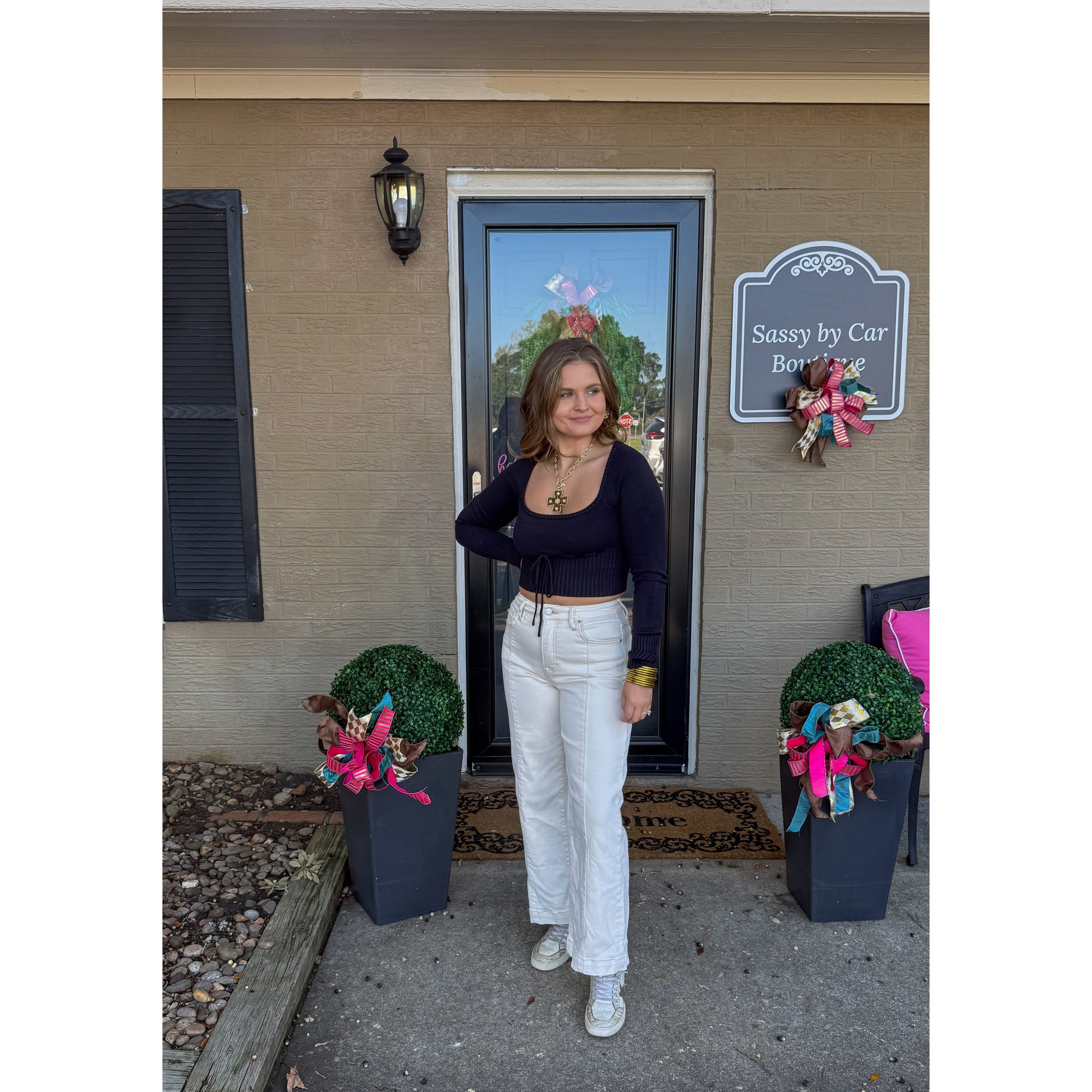 Midnight navy crop top. Square neckline, long sleeve, sweater knit material, and has tie detail along the seam of top.