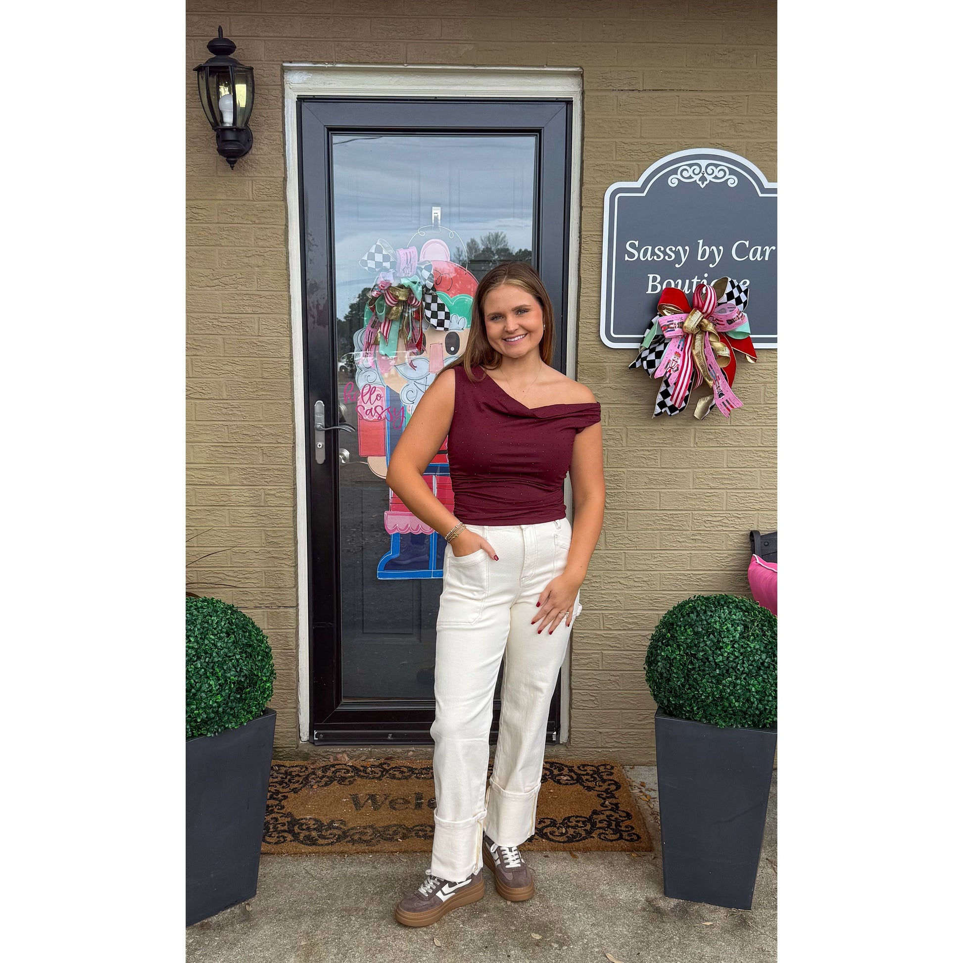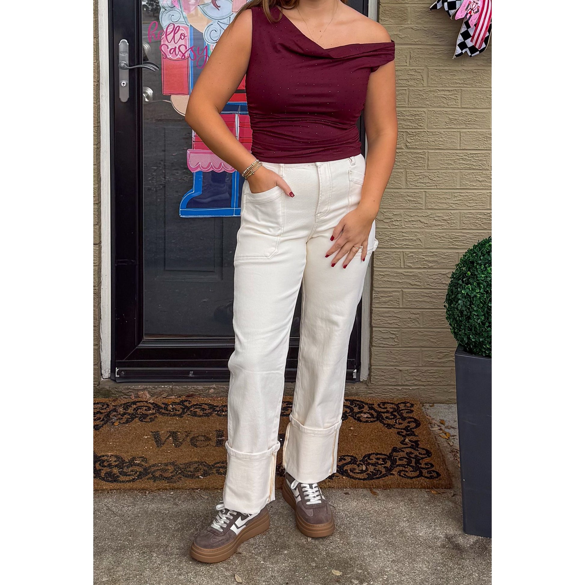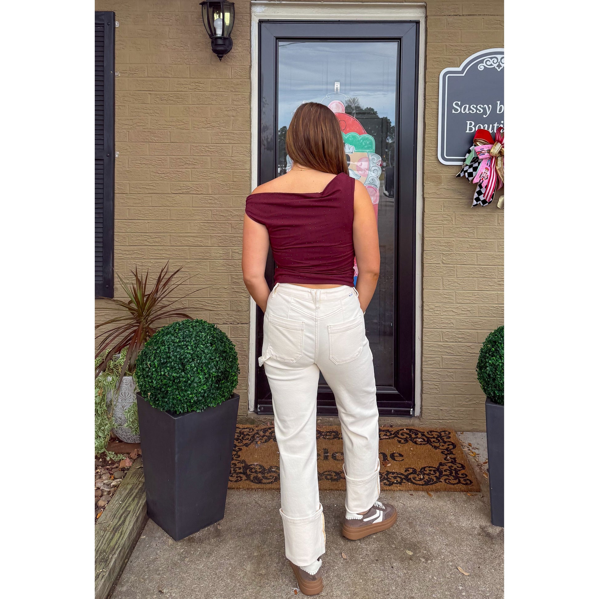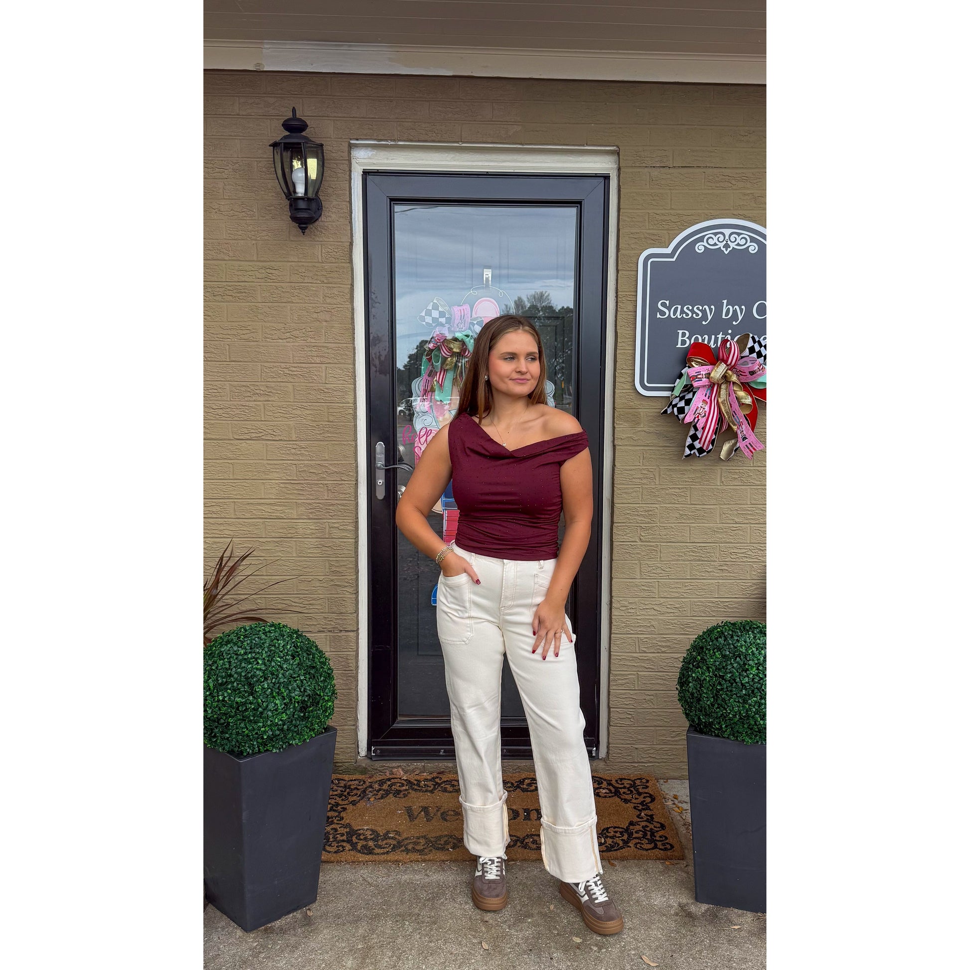 Burgundy asymmetrical neckline top with rhinestone stud detail. Ruched detailing, super flattering.