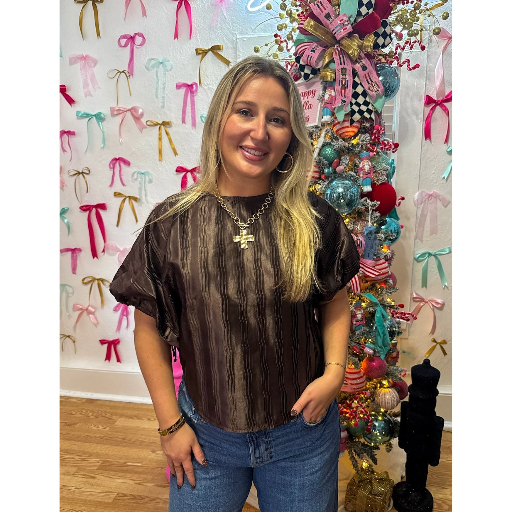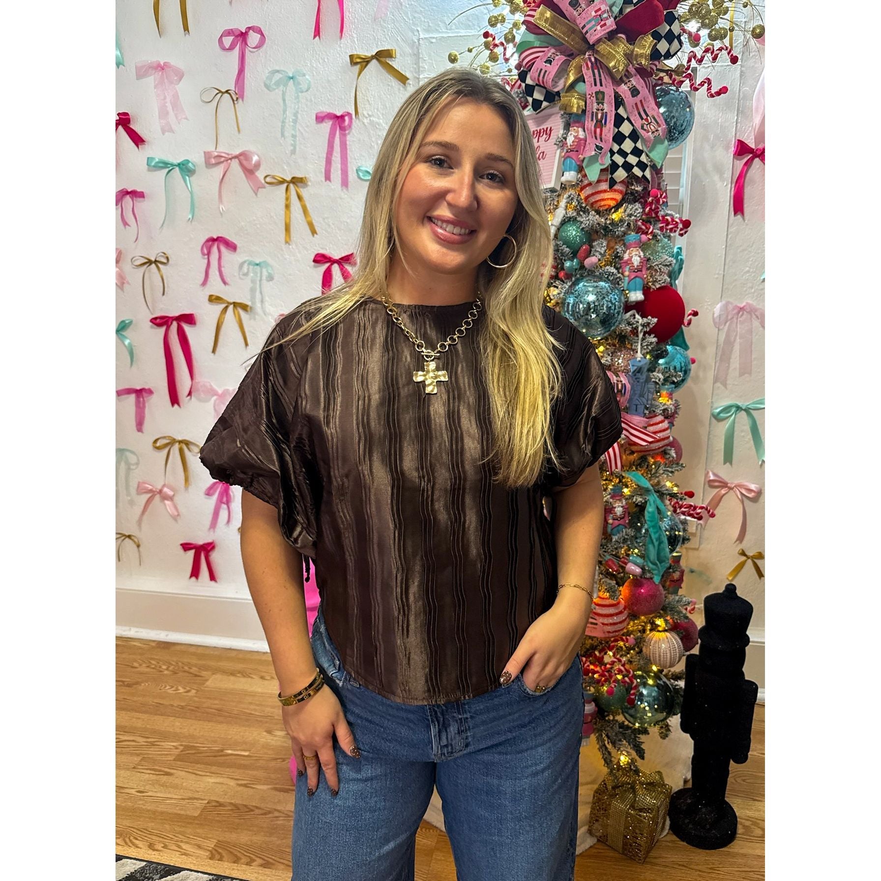 Chocolate brown short sleeve top. Metallic detail. Sleeves can be tightened. Keyhole closure in the back.