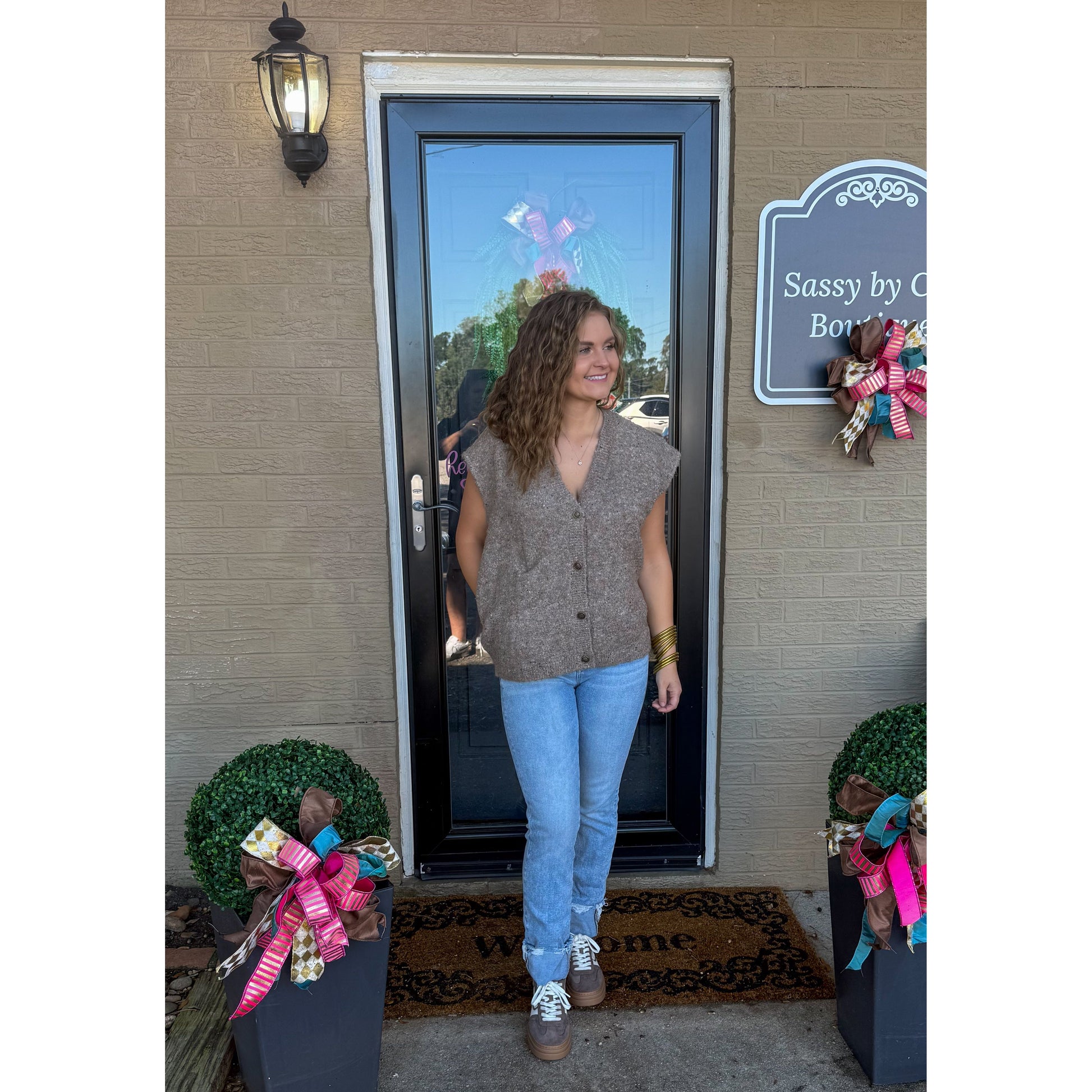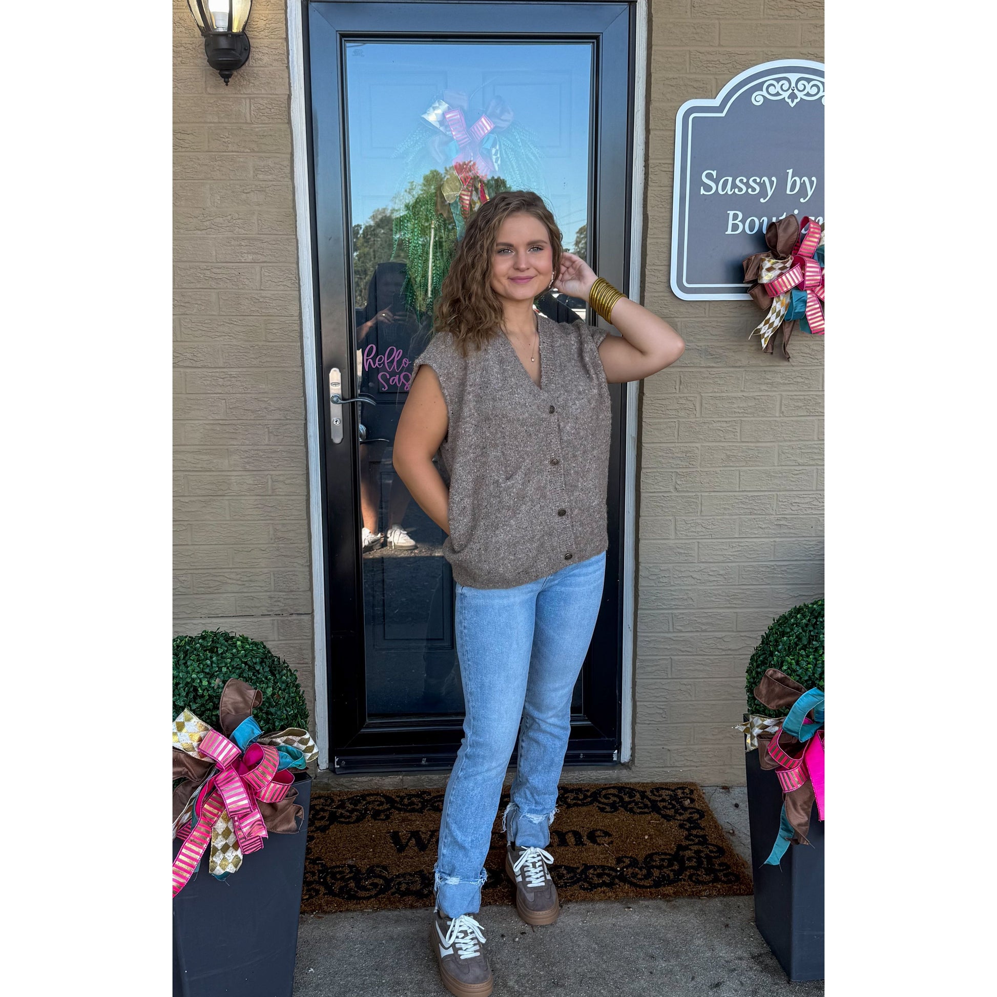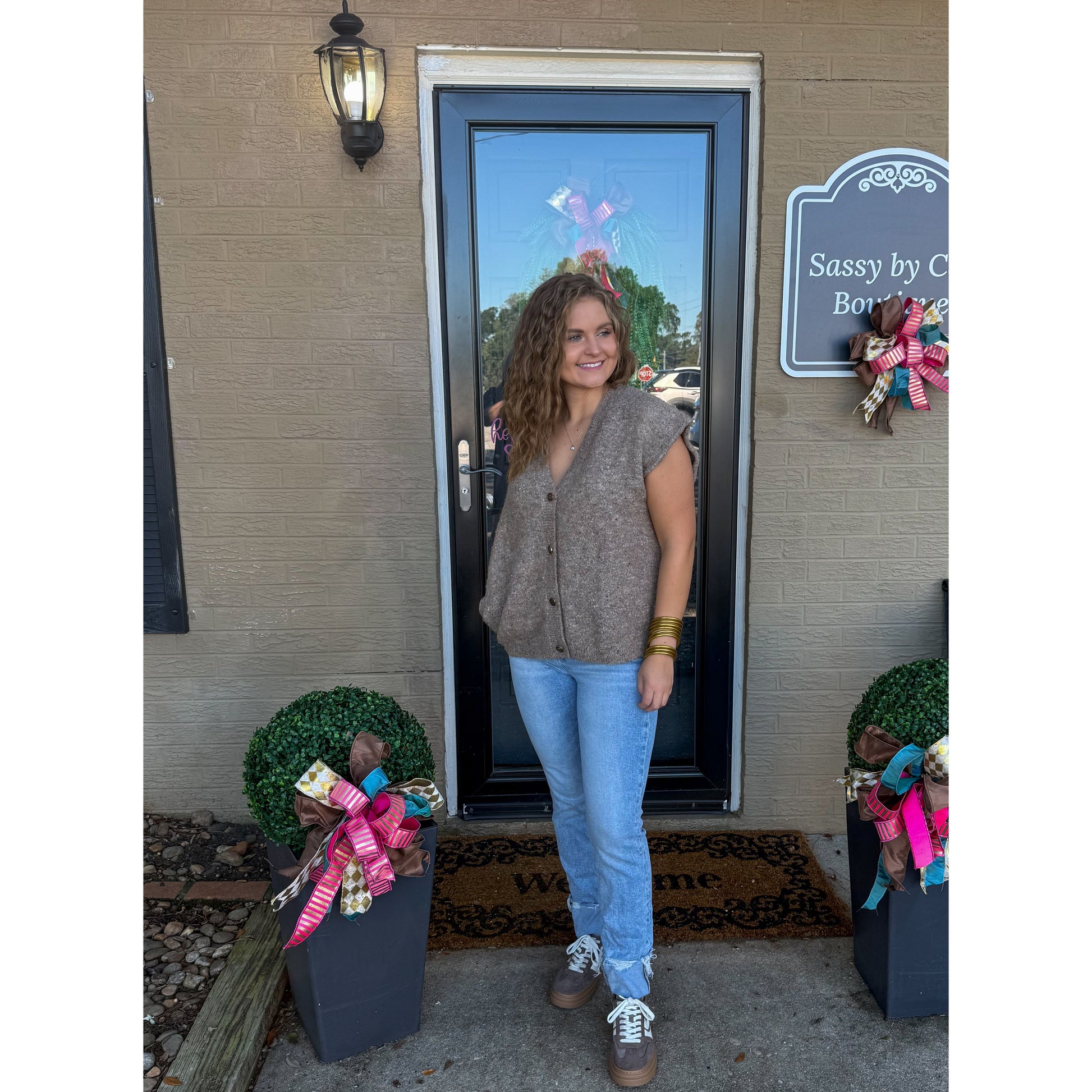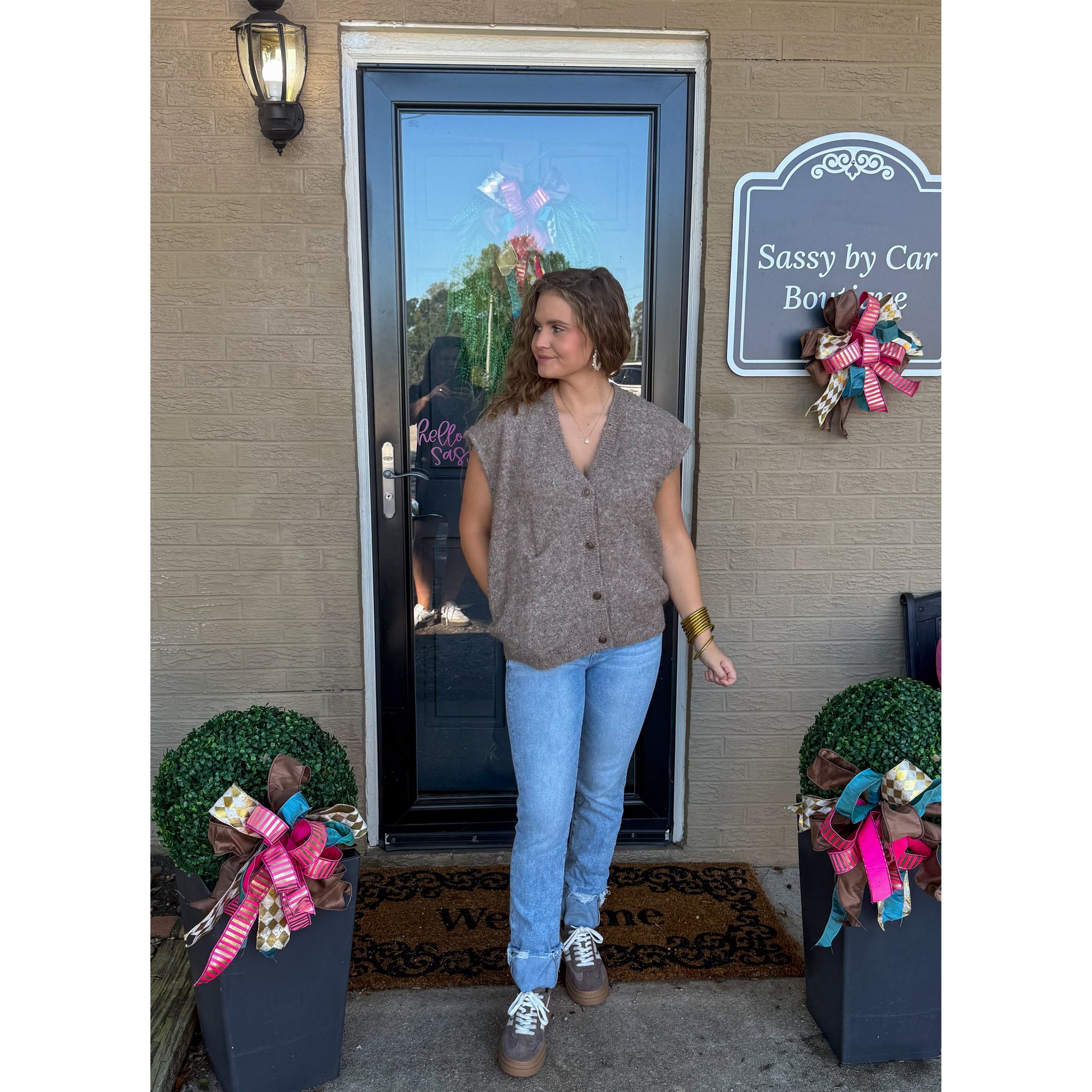 Sweater knit vest in mocha. Button down closure along the front. V-neckline detail.
