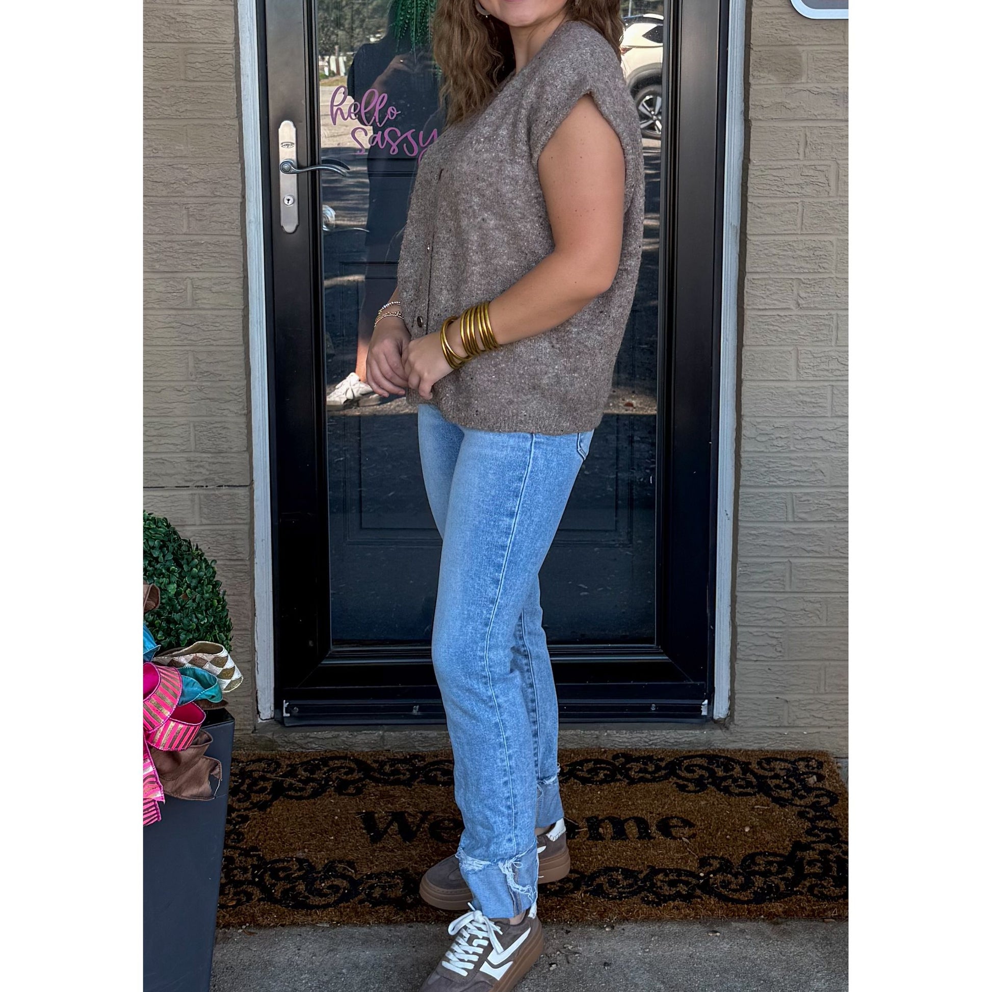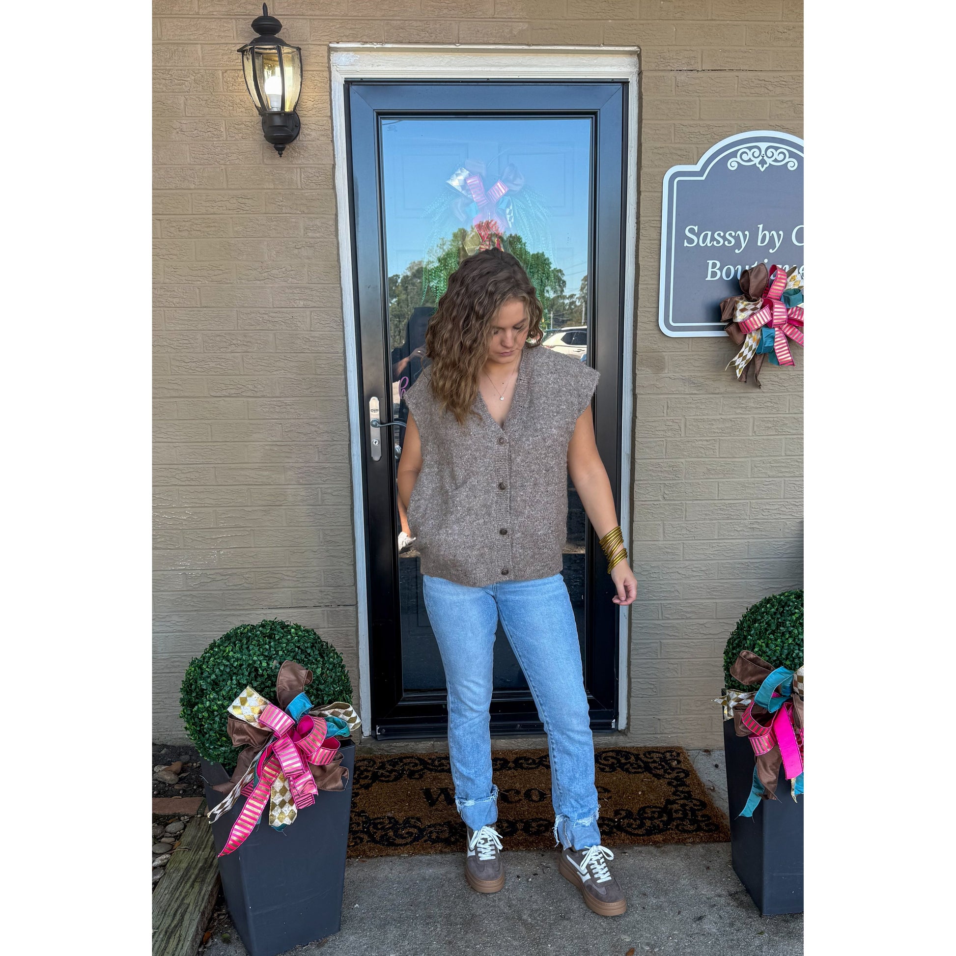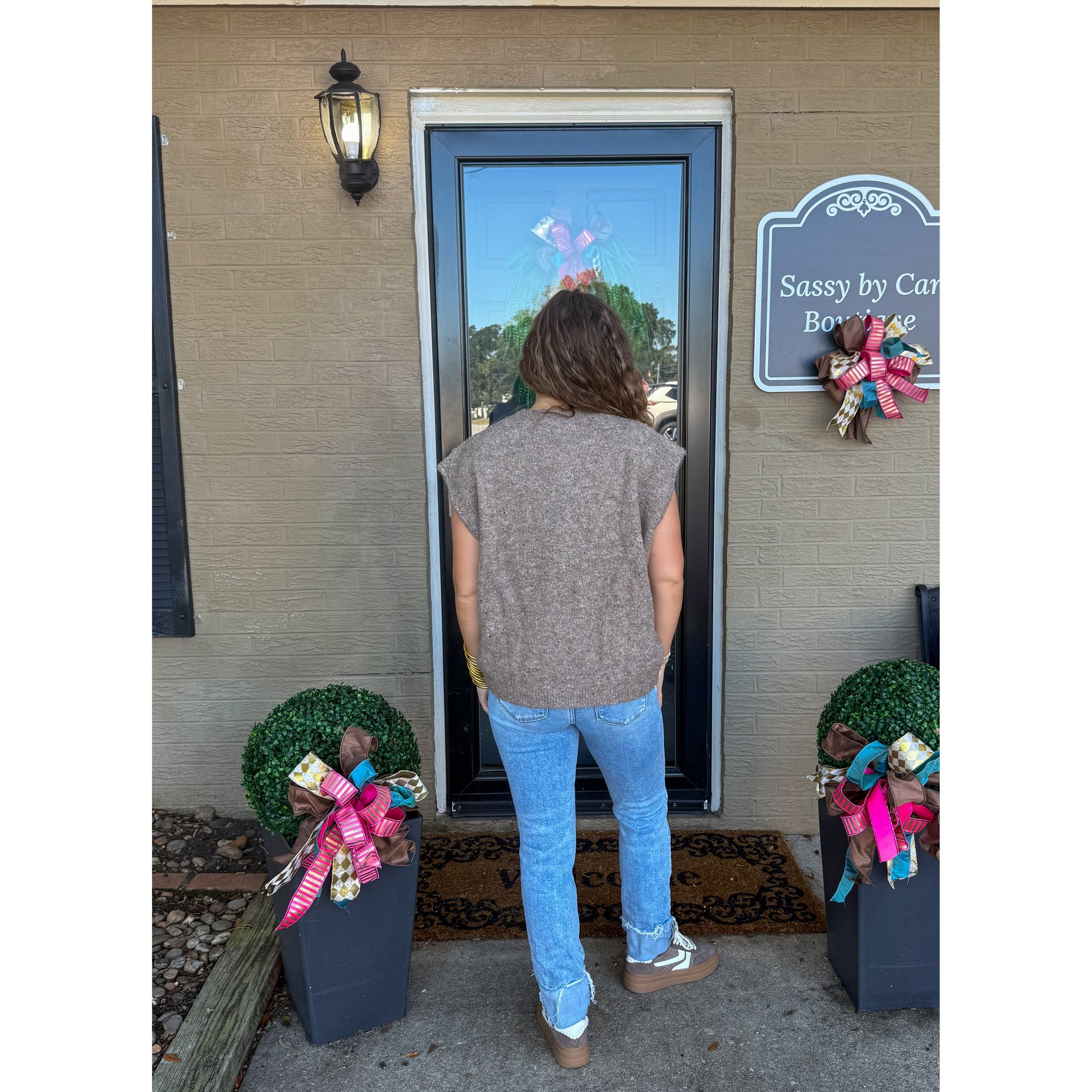 Sweater knit vest in mocha. Button down closure along the front. V-neckline detail.