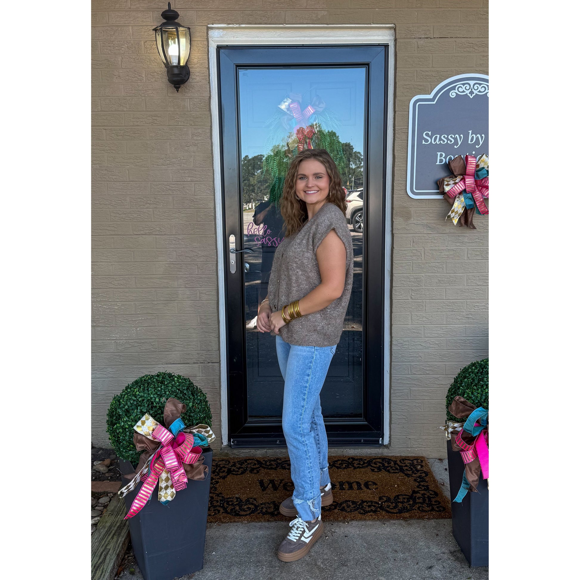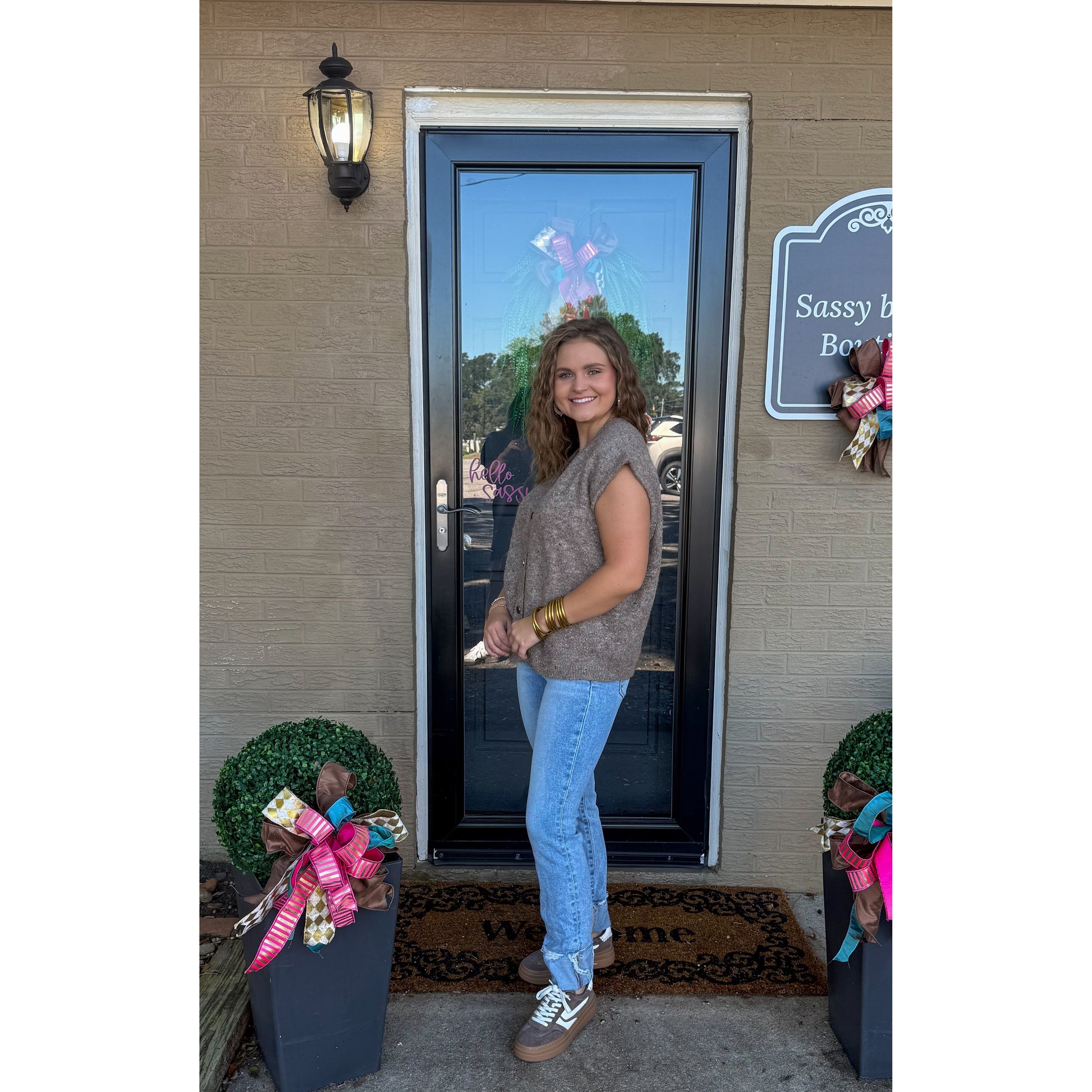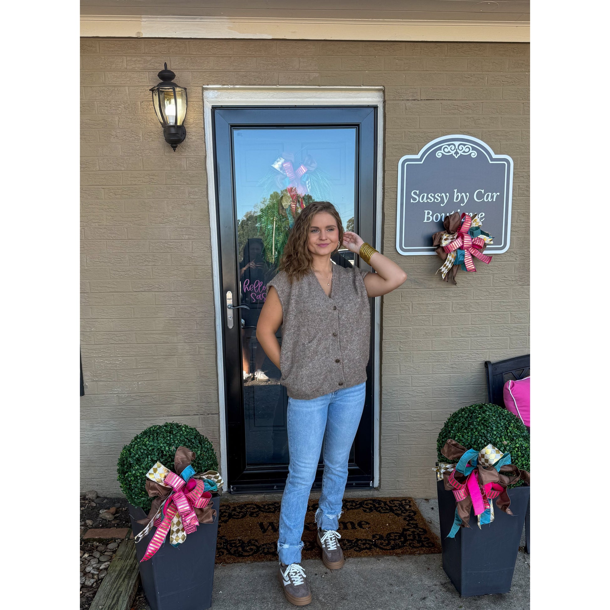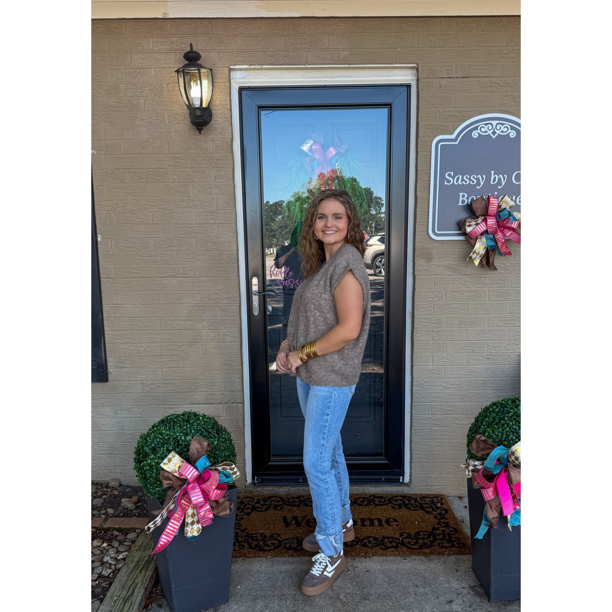 Sweater knit vest in mocha. Button down closure along the front. V-neckline detail.