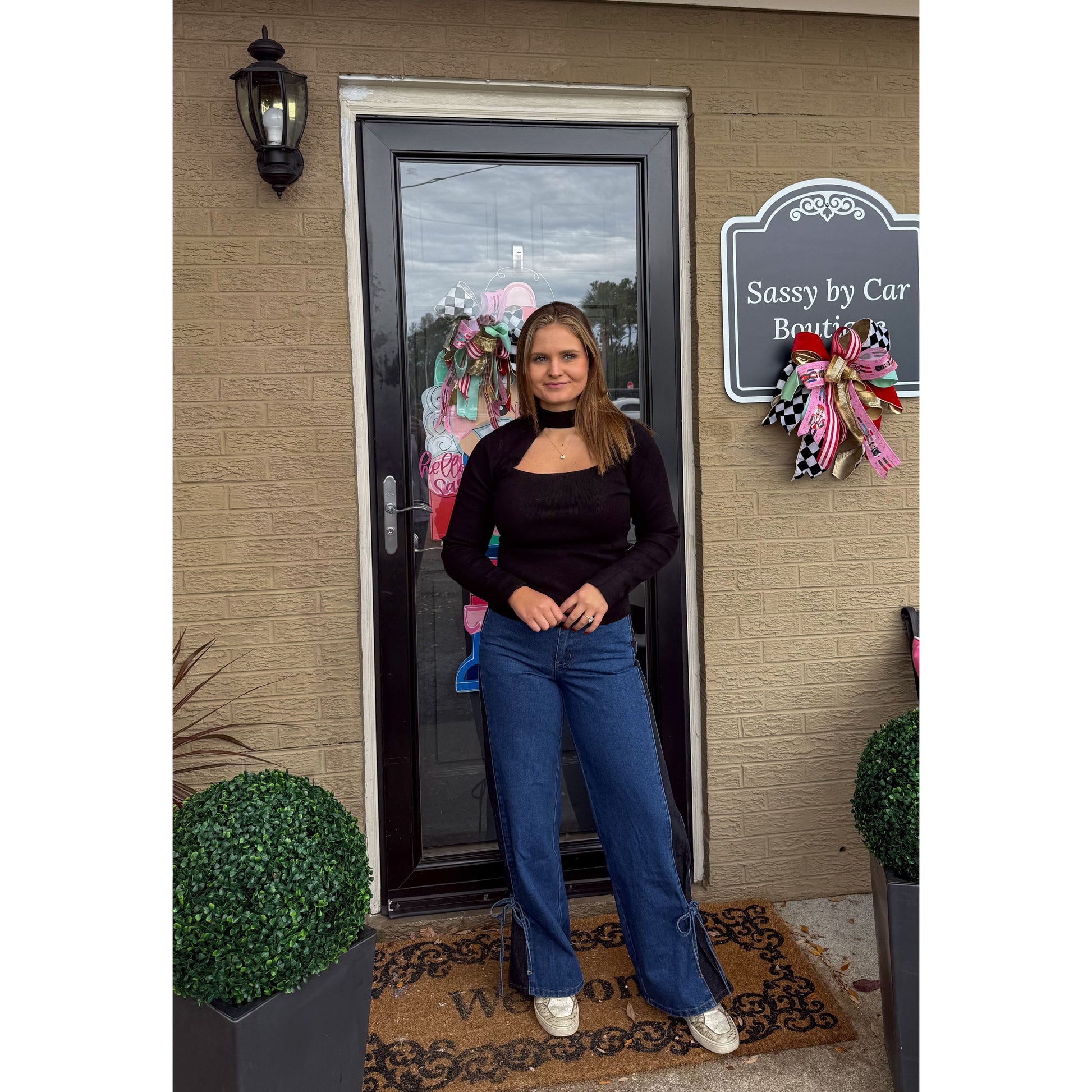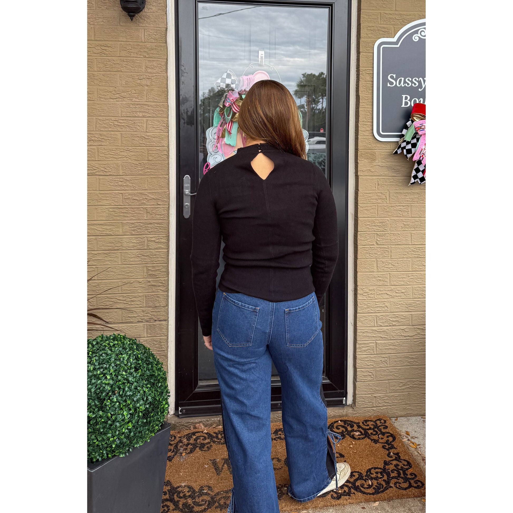 Black mock neck cutout top with two button closure in the back of top. Top is knit with good stretch and it is fitted.