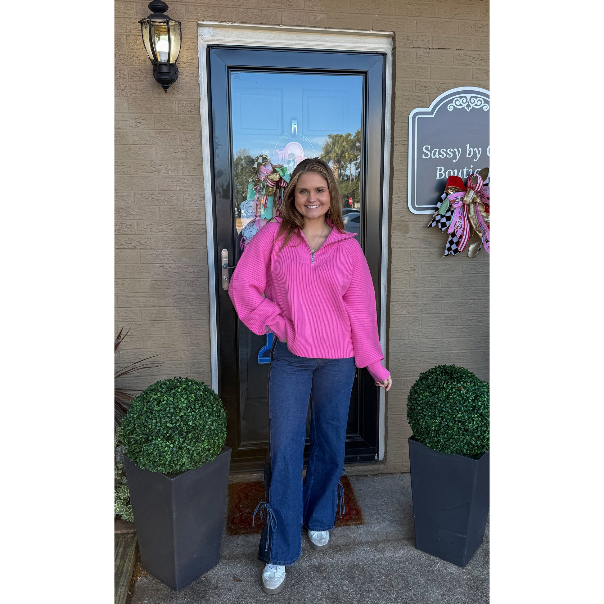 Pink sweater top. Easy to dress up or dress down. Quarter zip closure, balloon detail sleeves, and collar detail.