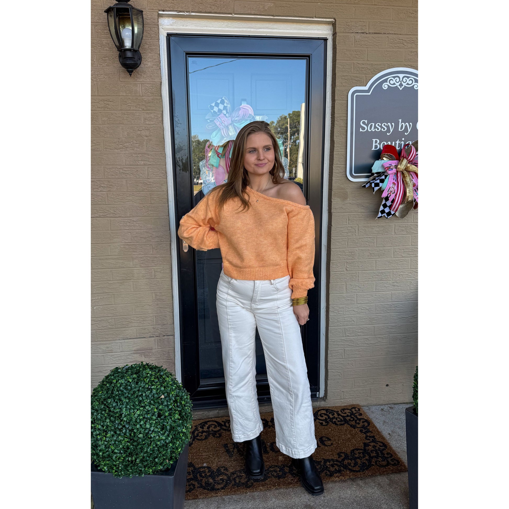 How adorable is this?! Light orange sweater top with asymmetrical neckline and balloon sleeve detail.