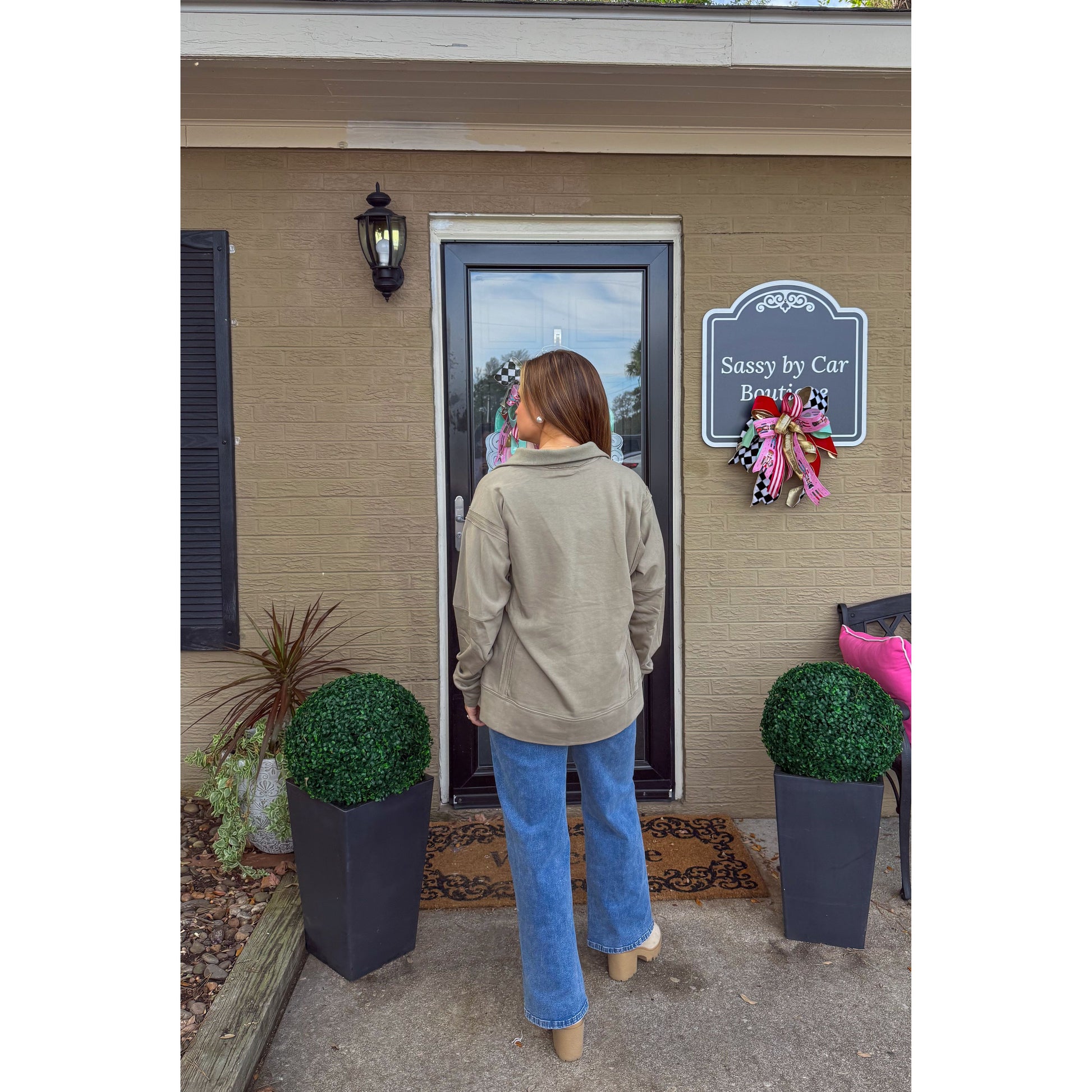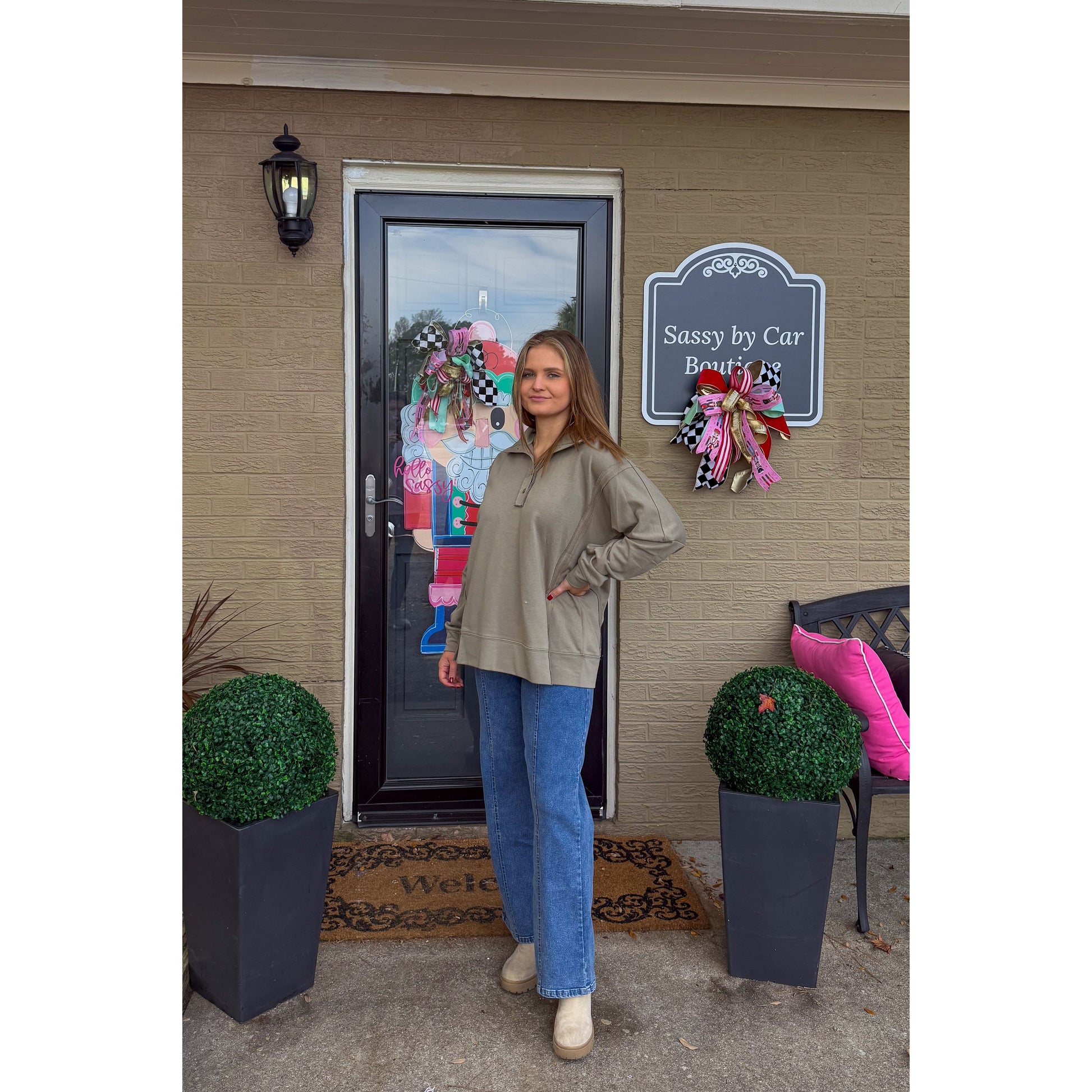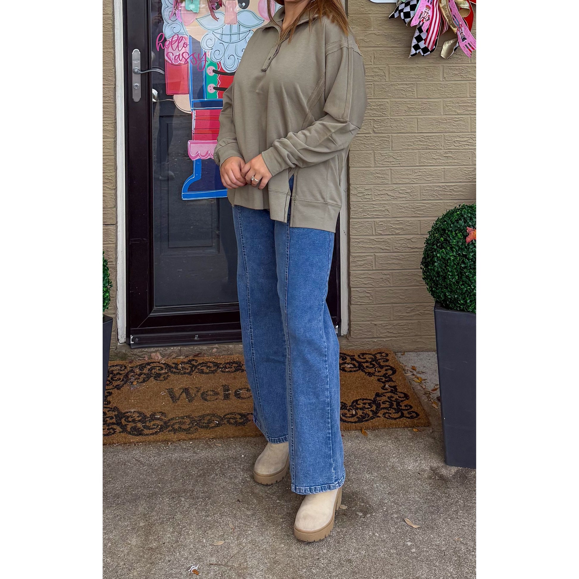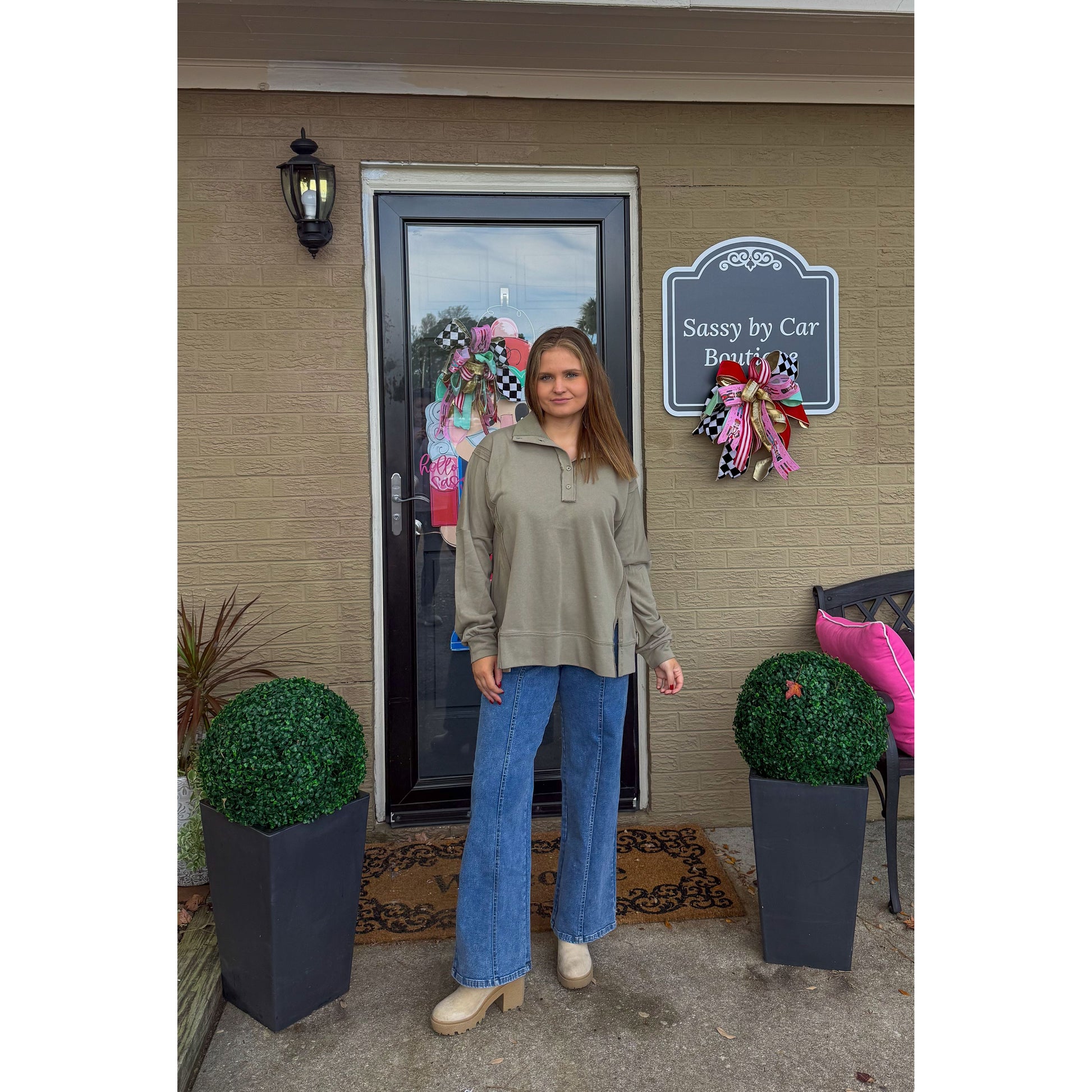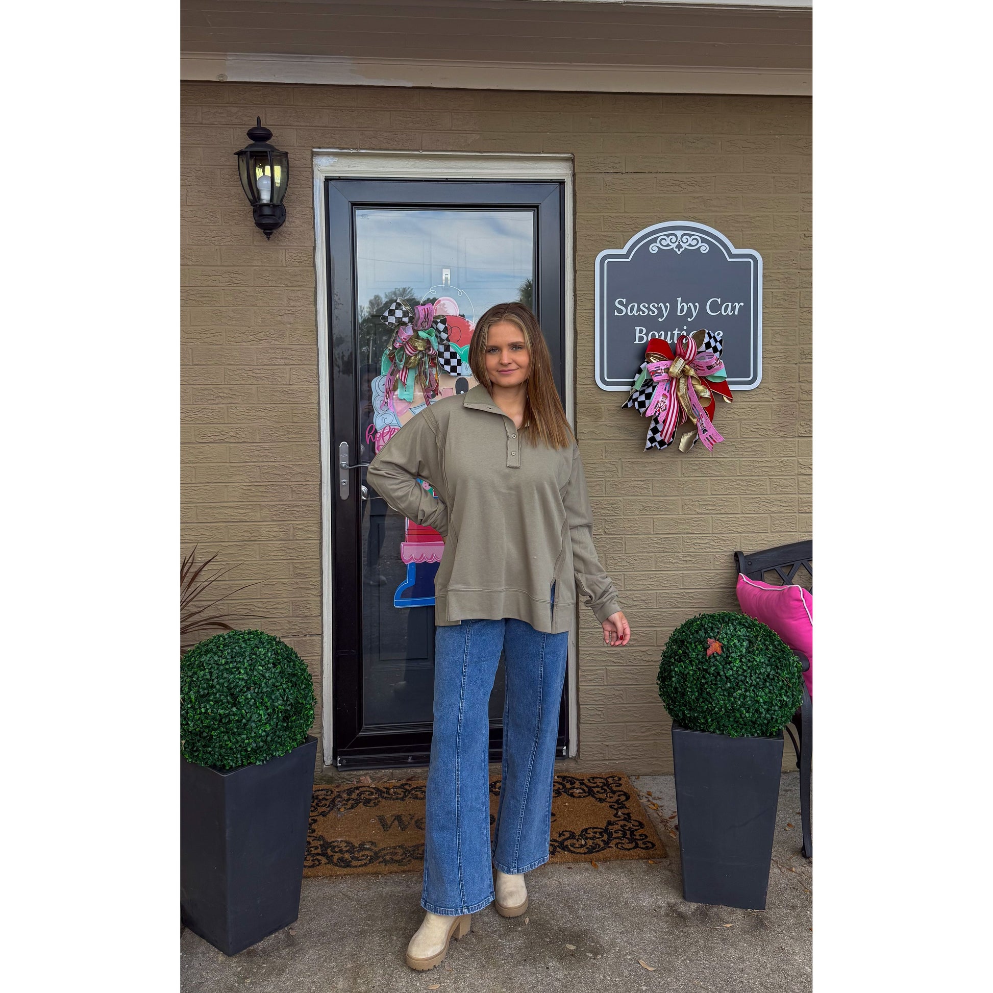 Olive green lounge top quarter button detail, slit on the sides of top, high/low hemline.