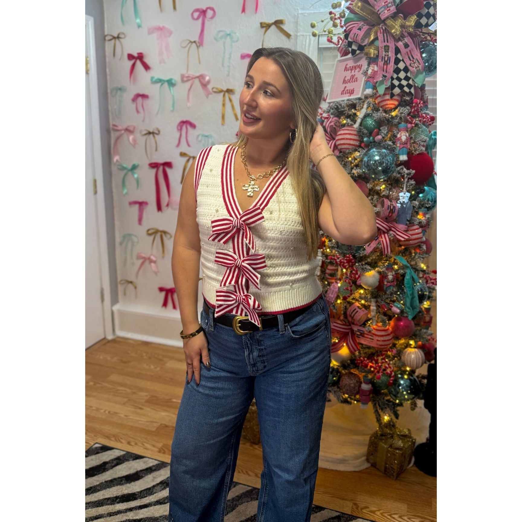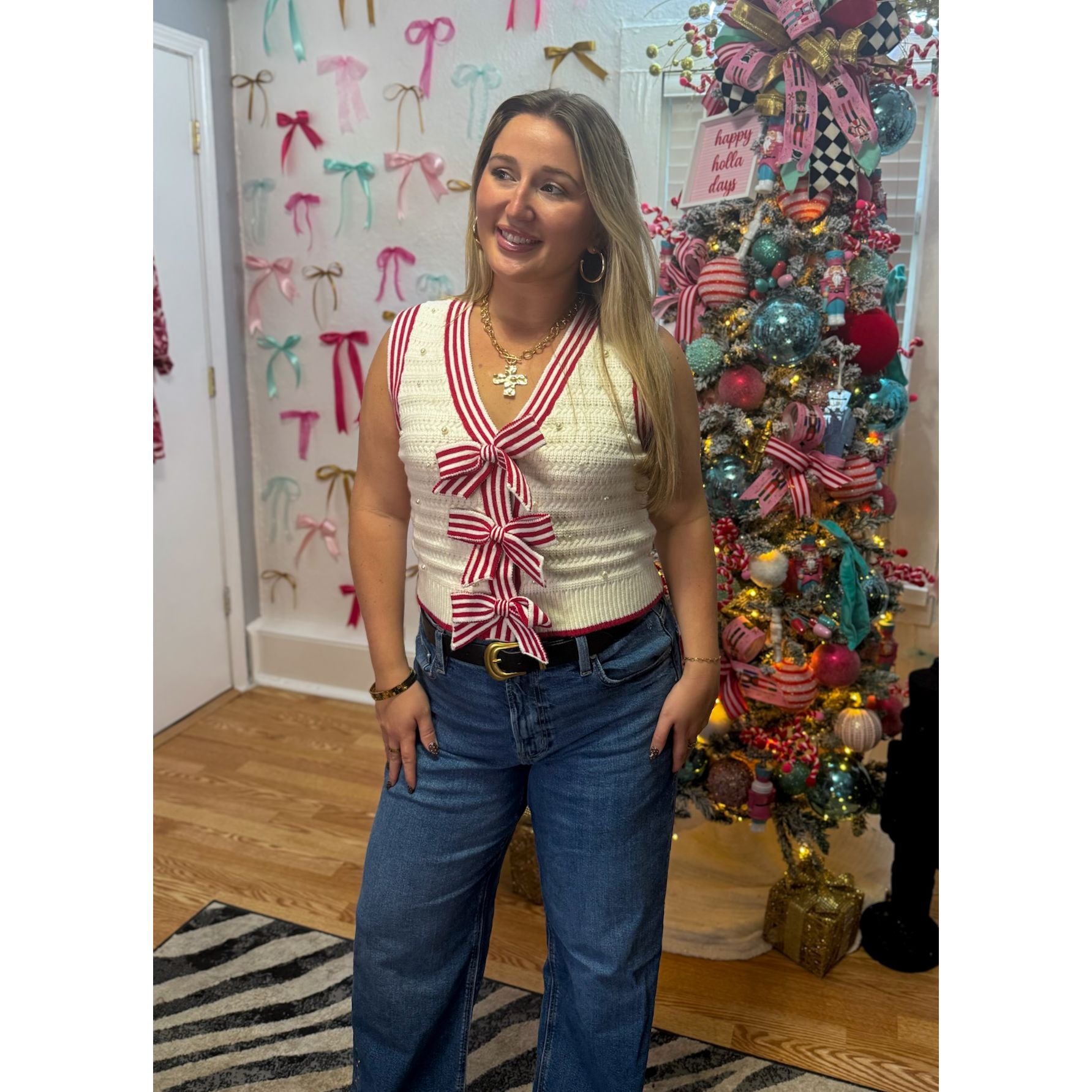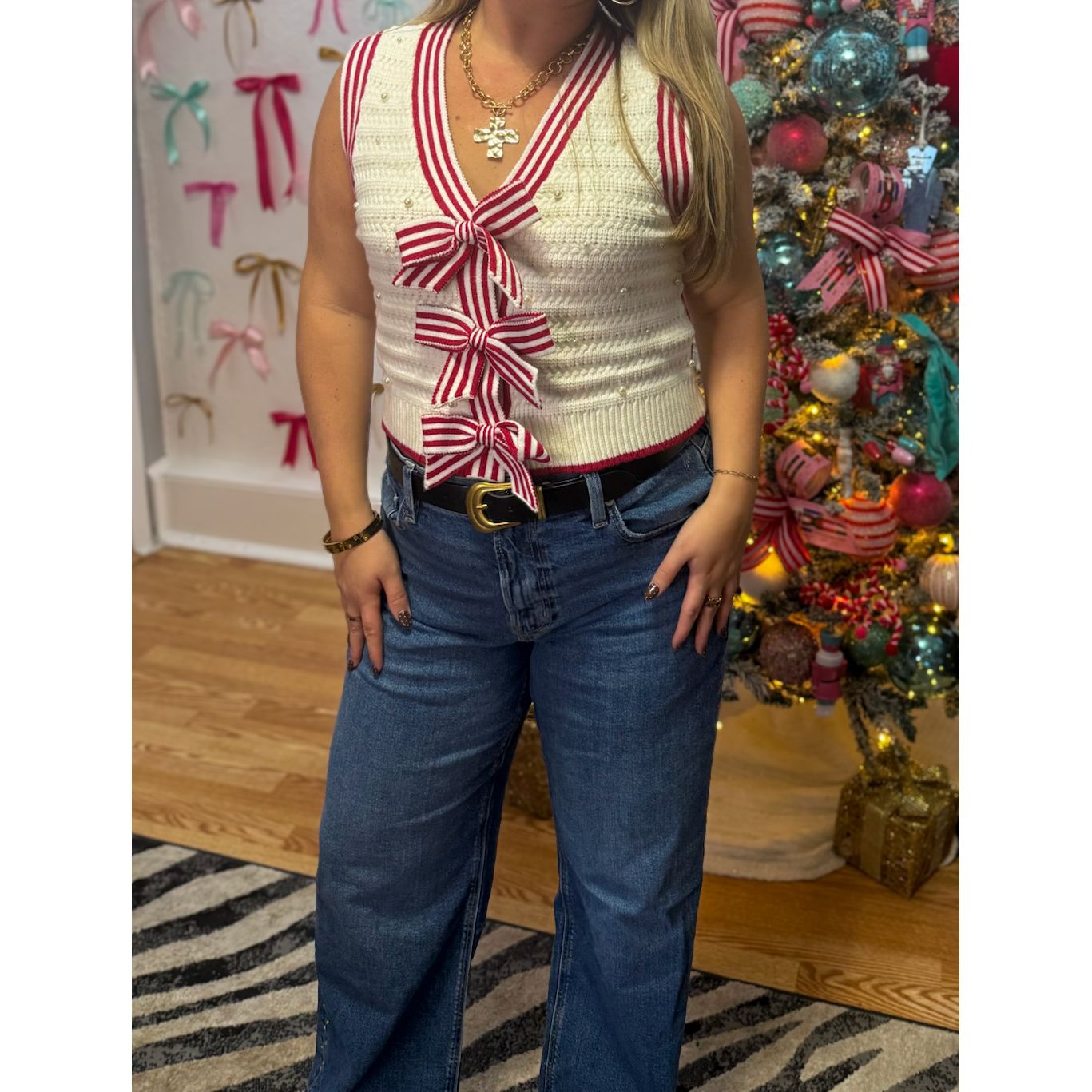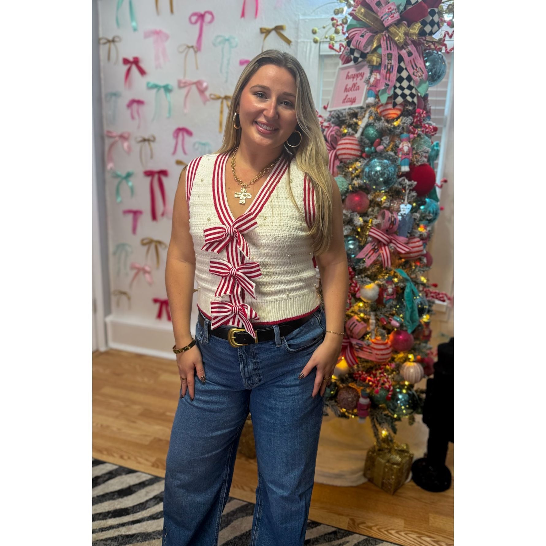Sleeveless sweater vest with v-neckline. Cream vest with red stripe outline and three bow on the front. Pearl detail pattern.
