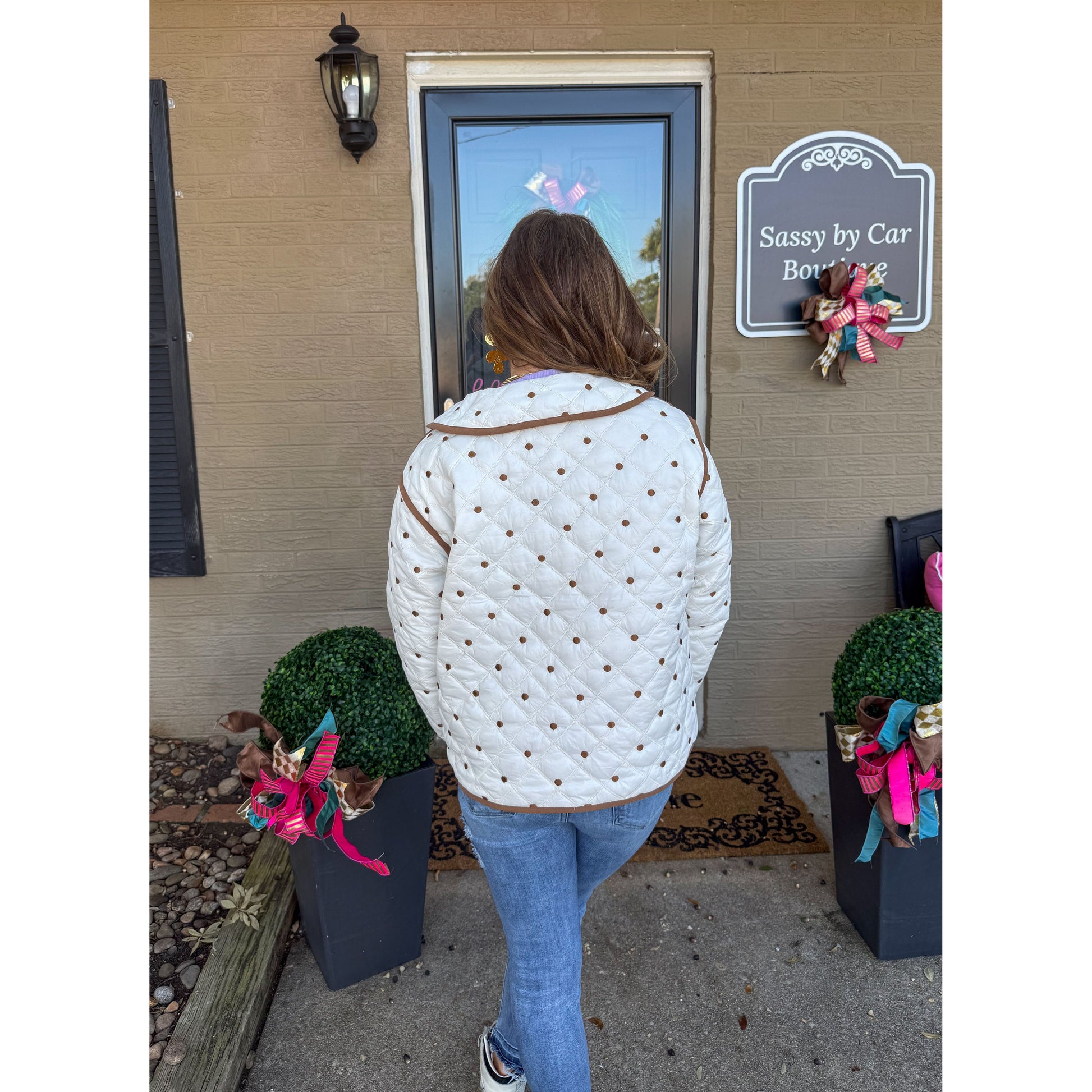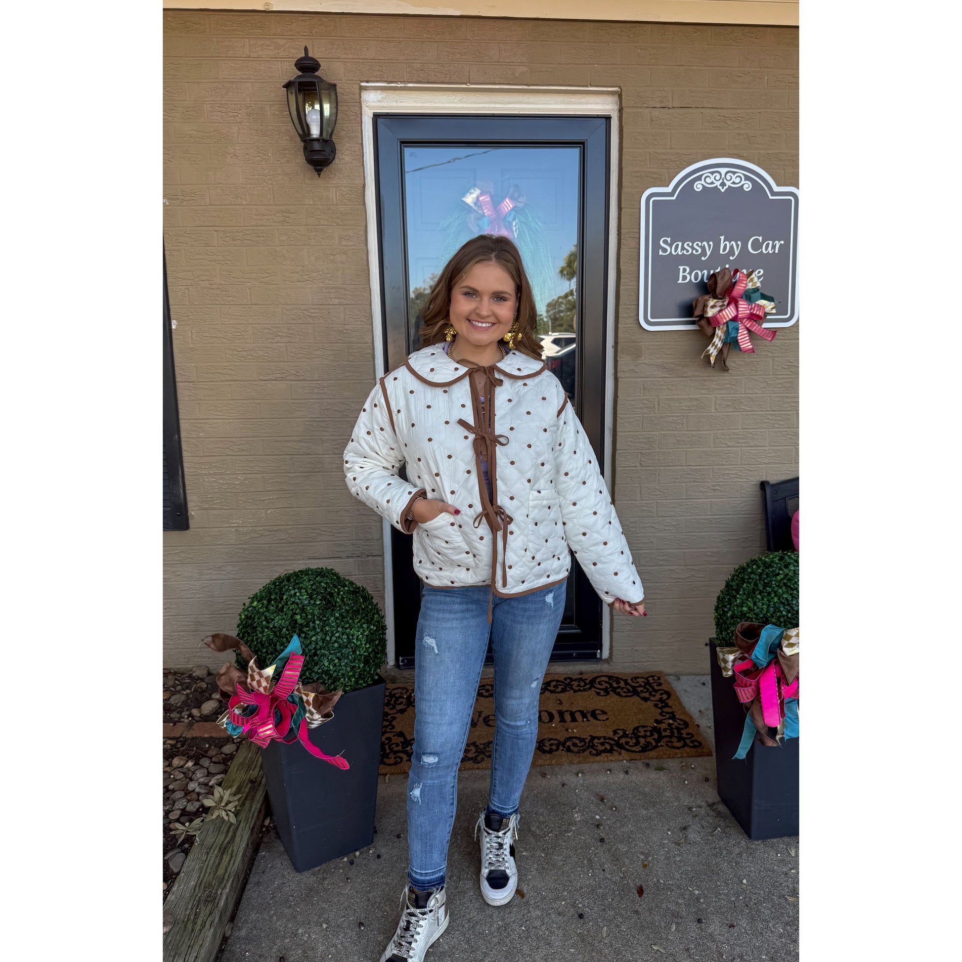 Polka dot in mocha/ivory quilt jacket with three bow closure along the front. Outline of jacket is trimmed in faux suede.
