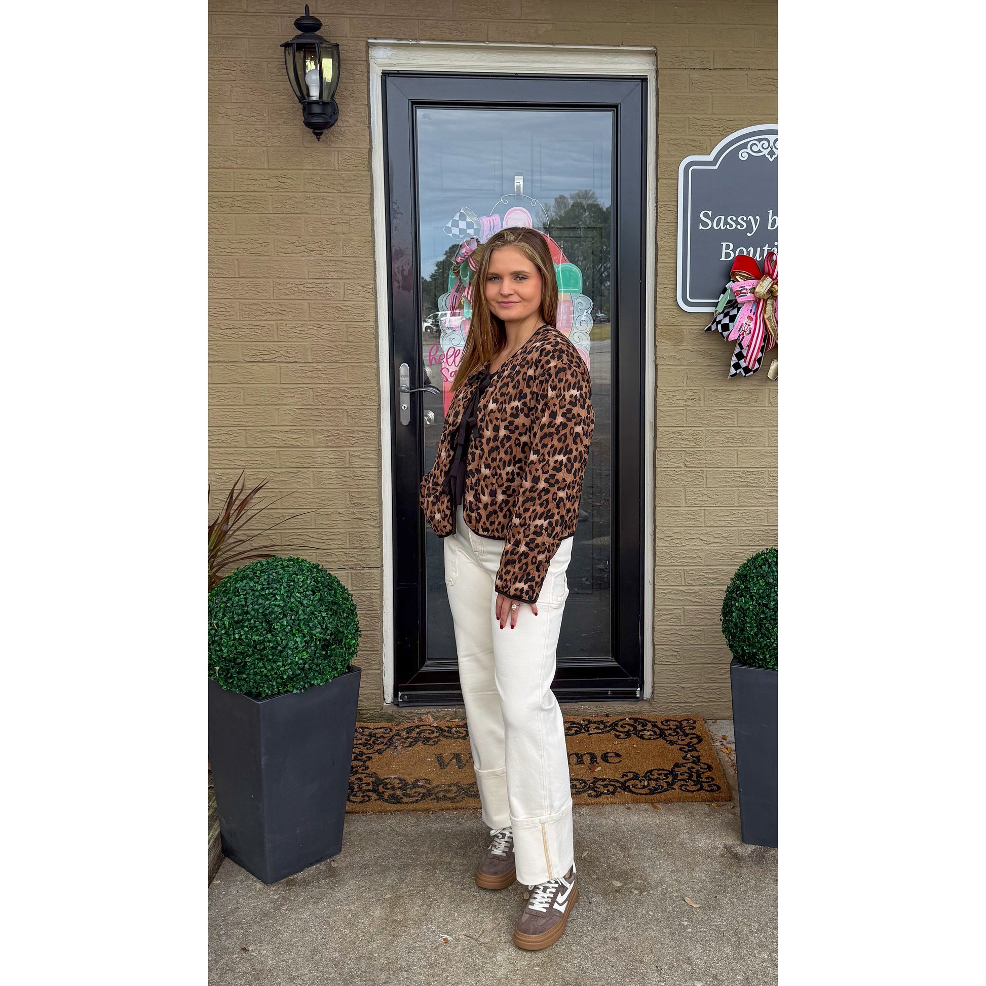 Quilted cheetah pattern puffer jacket with tie closure in the front to make tighter/looser and has pockets.