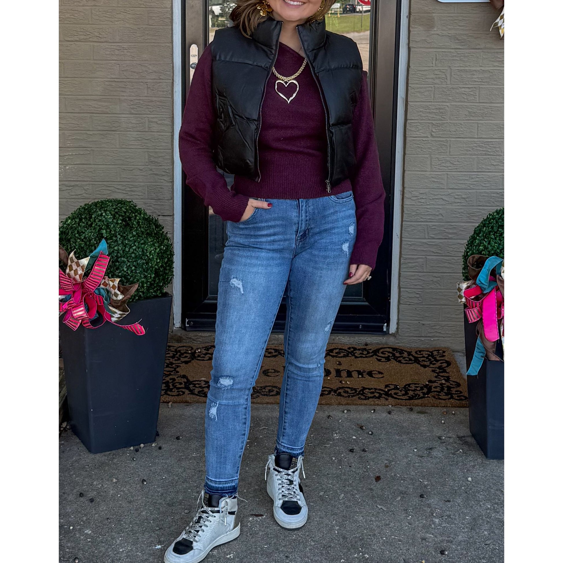 Faux leather black puffer vest. Zipper closure along the front and has pockets.