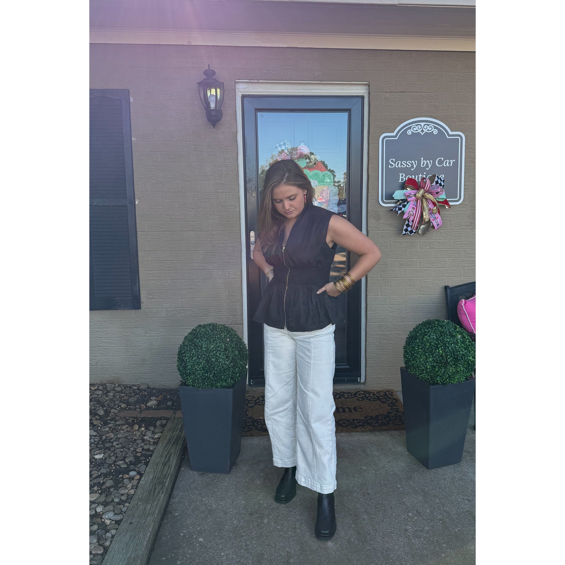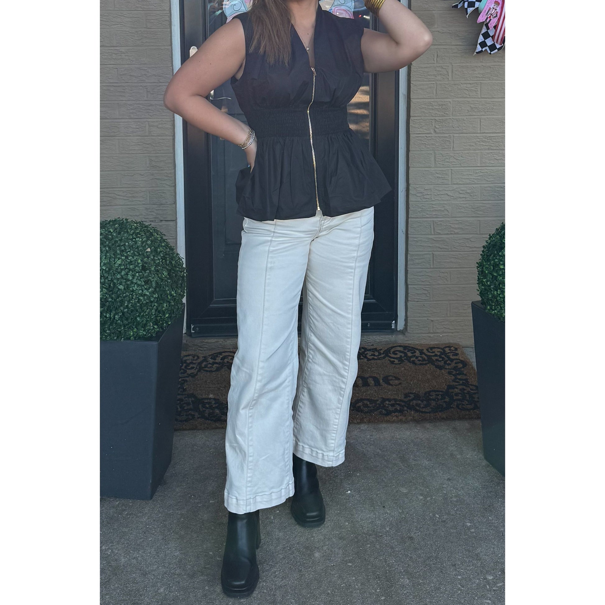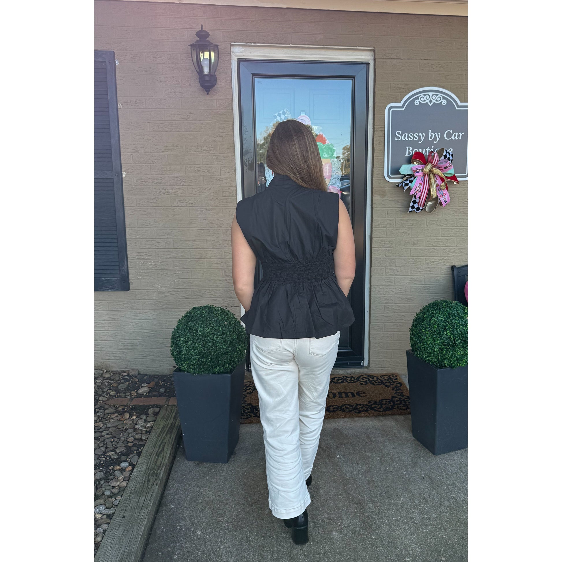 Sleeveless top in black with v-neckline and gold zipper down the front of top with smocked detail under the chest.
