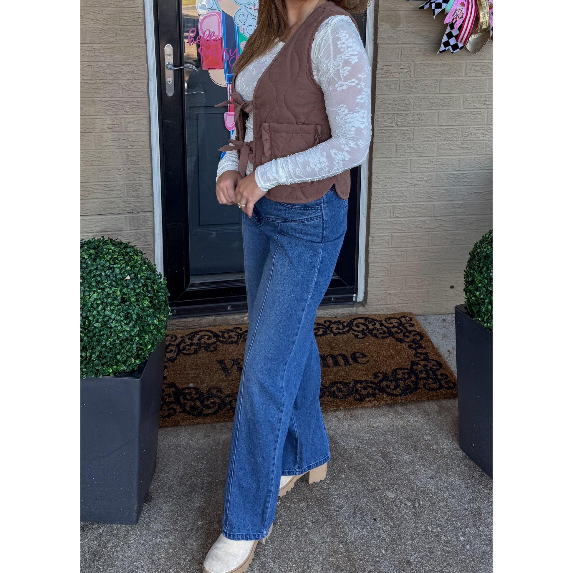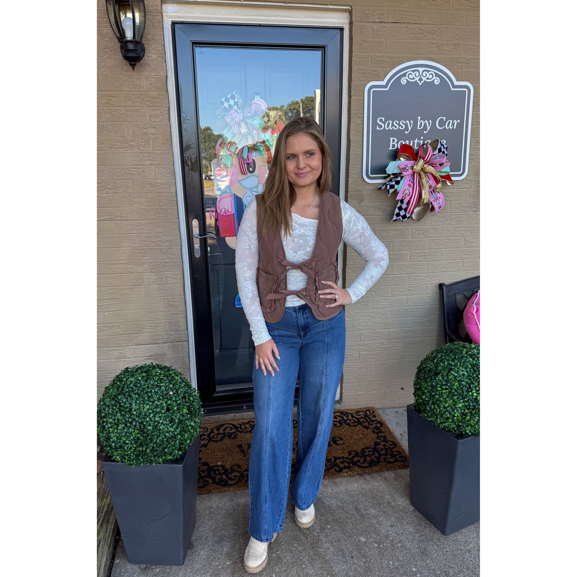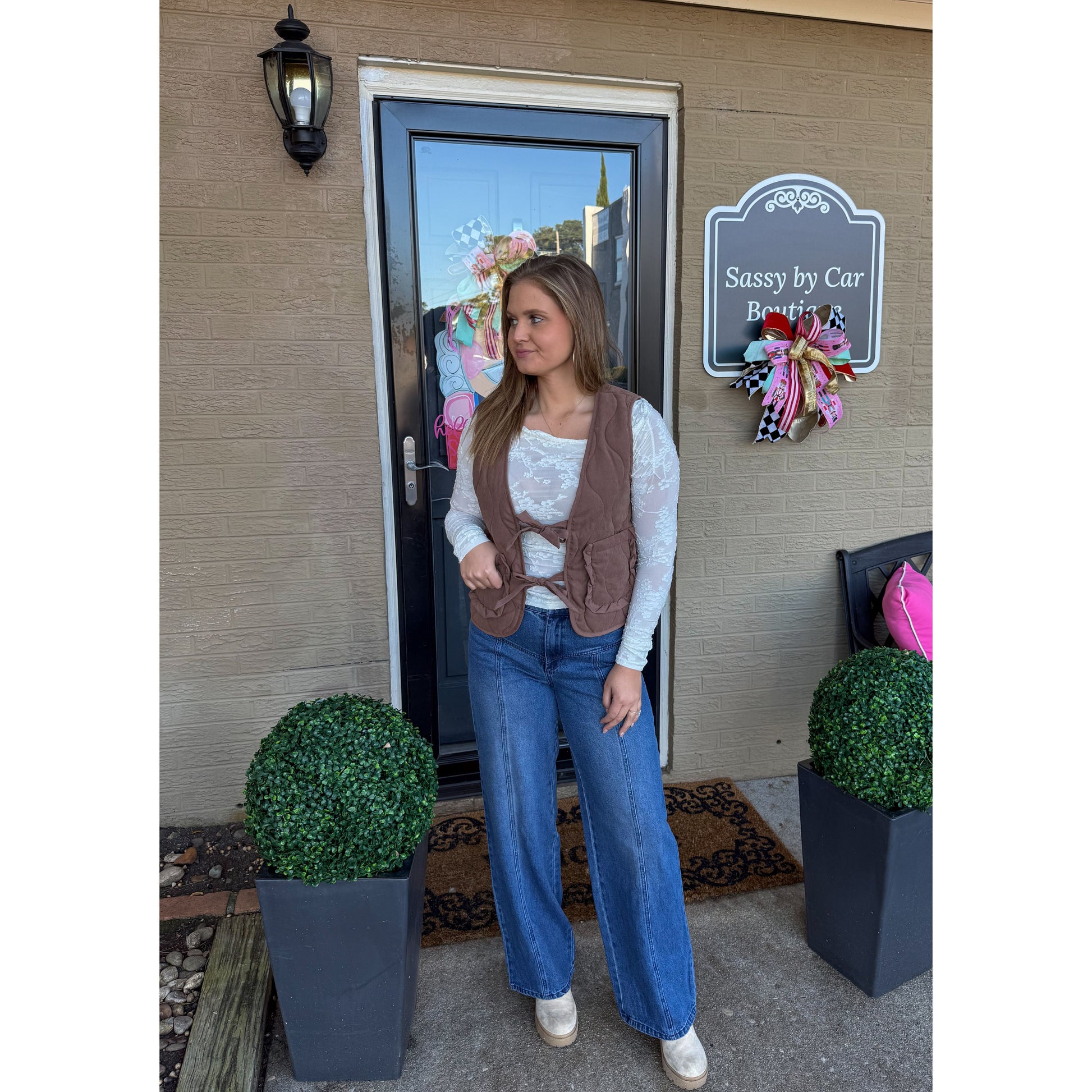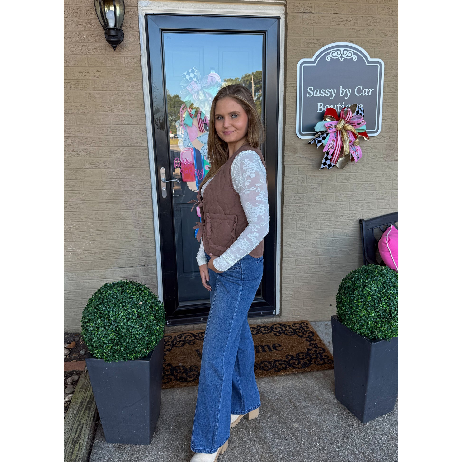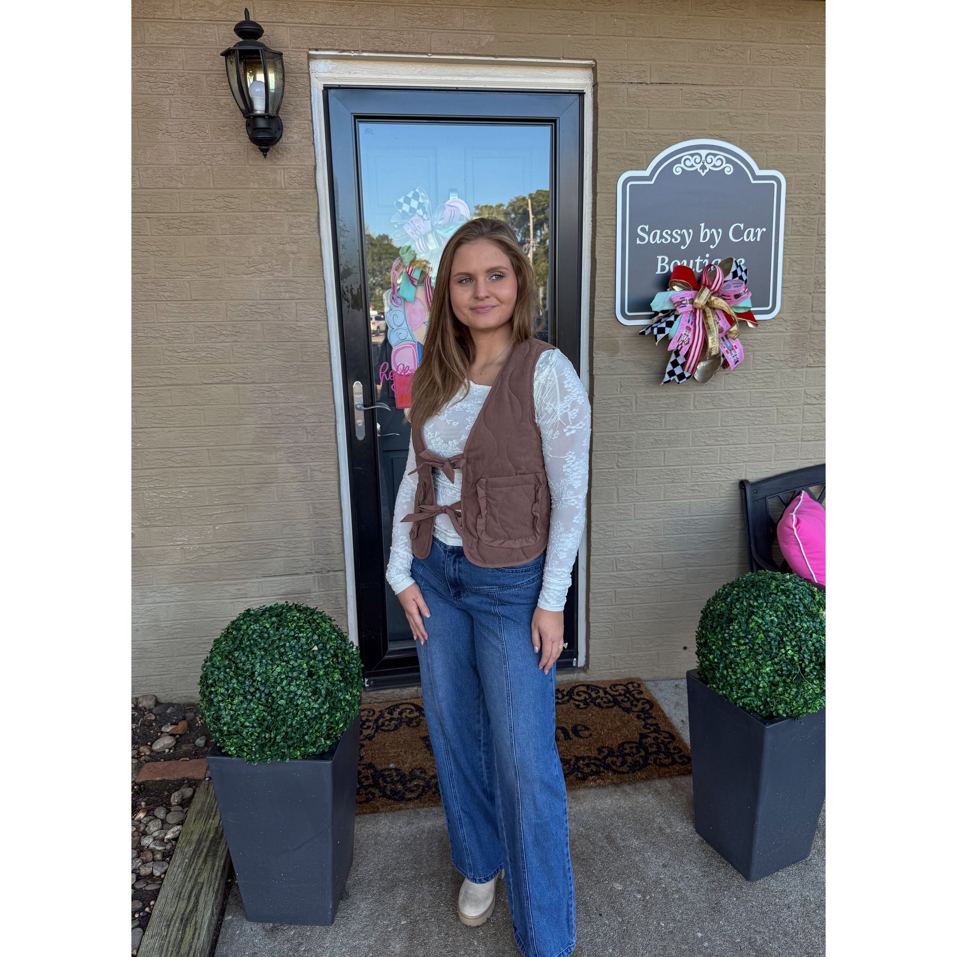 Espresso brown quilted vest with two bow closure along the front. Has pockets.
