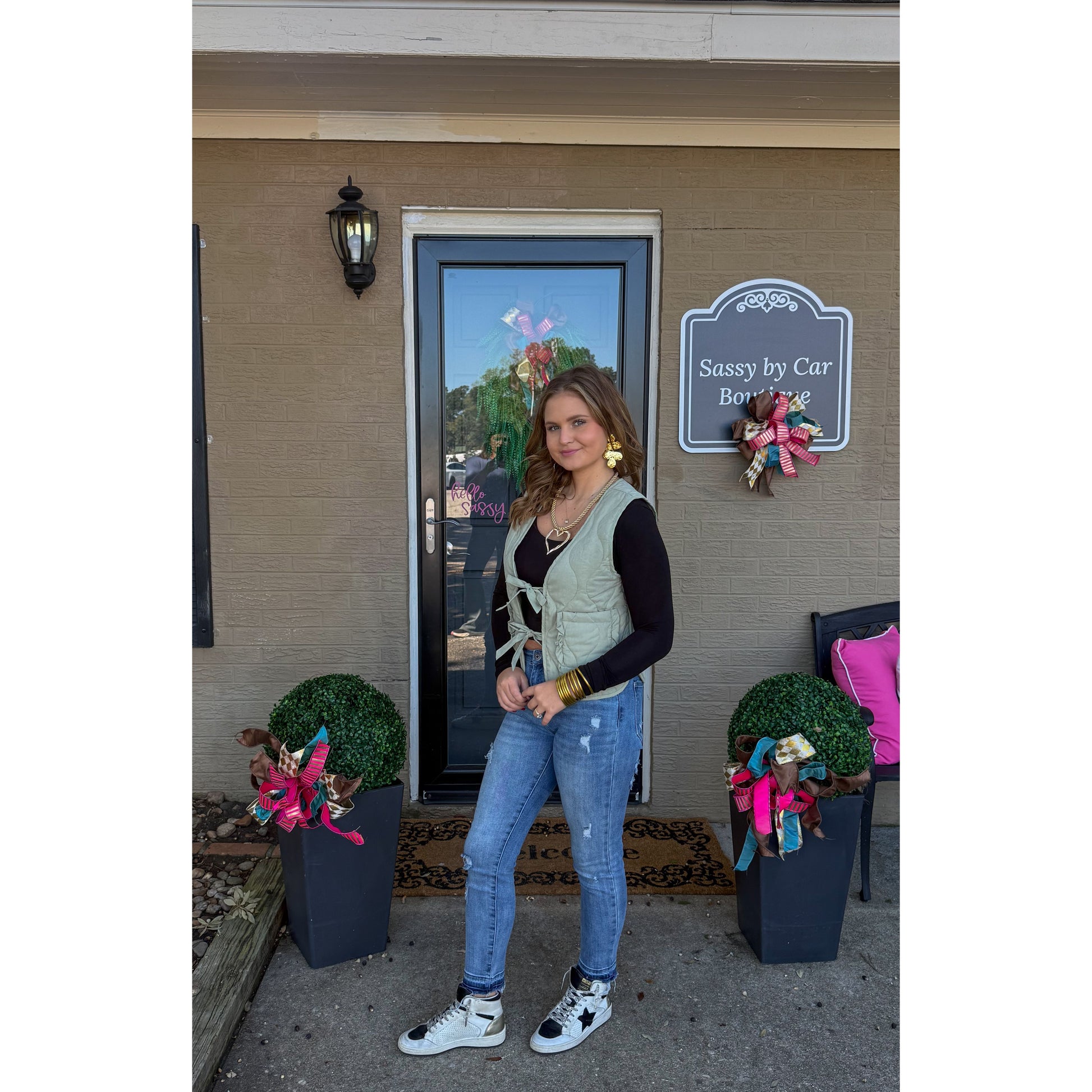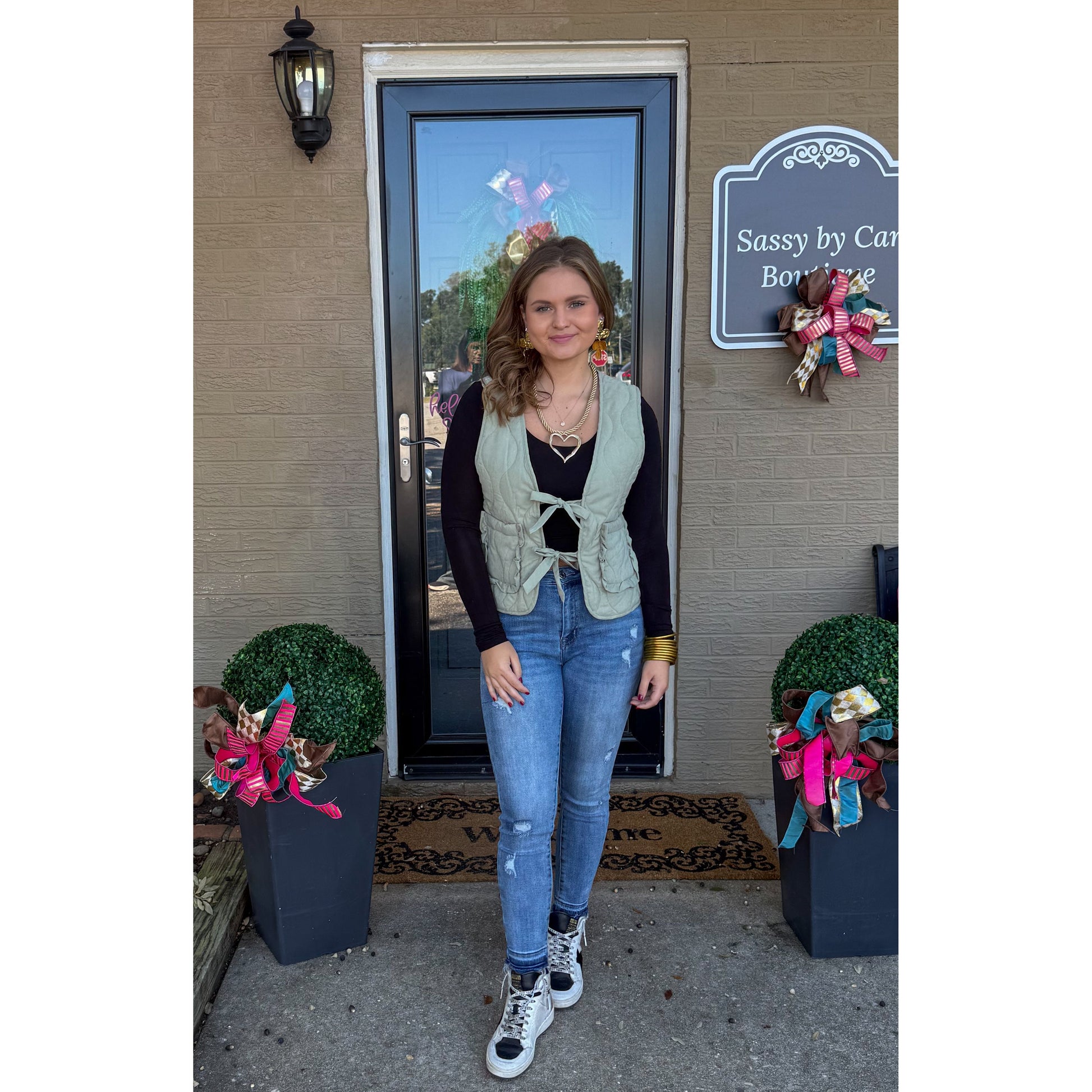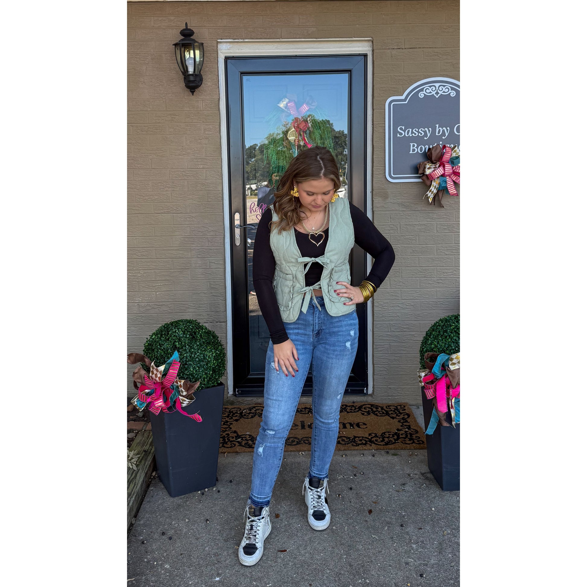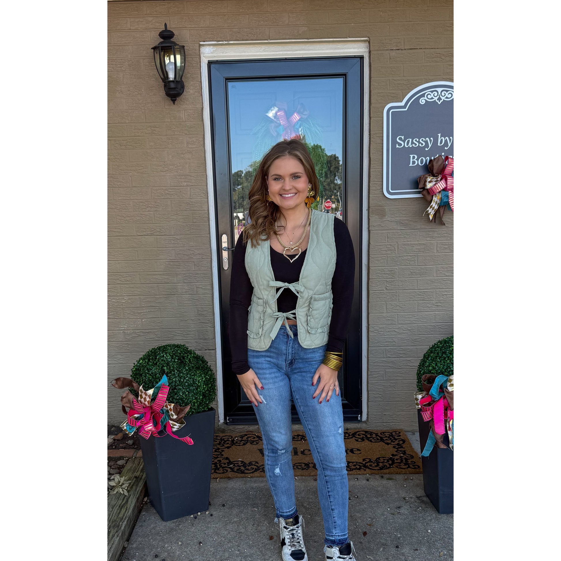 Sage green quilted vest with two bow closure along with pockets along the front chest.