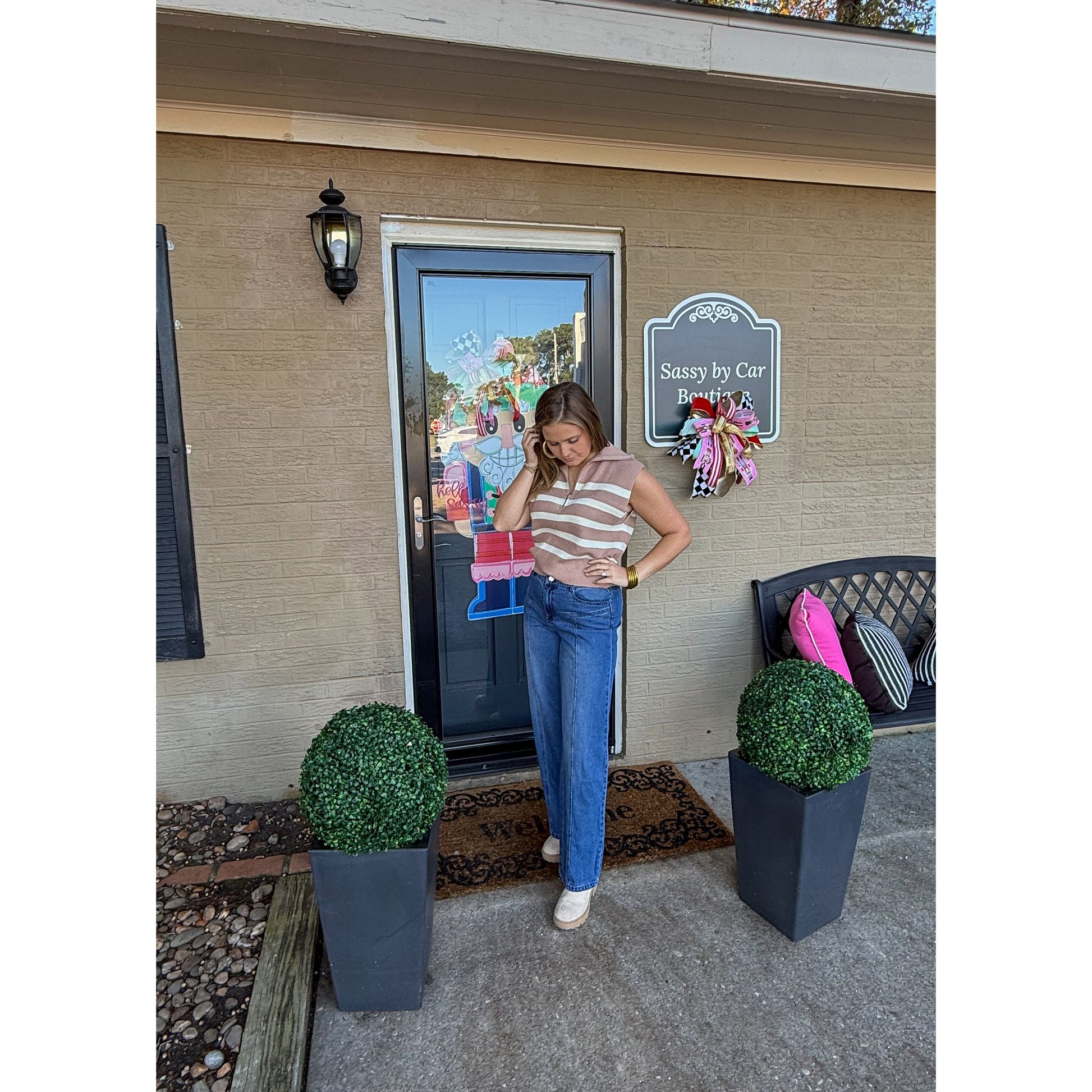 Short sleeve knit top. Stripe detail in taupe/cream. Quarter zip.