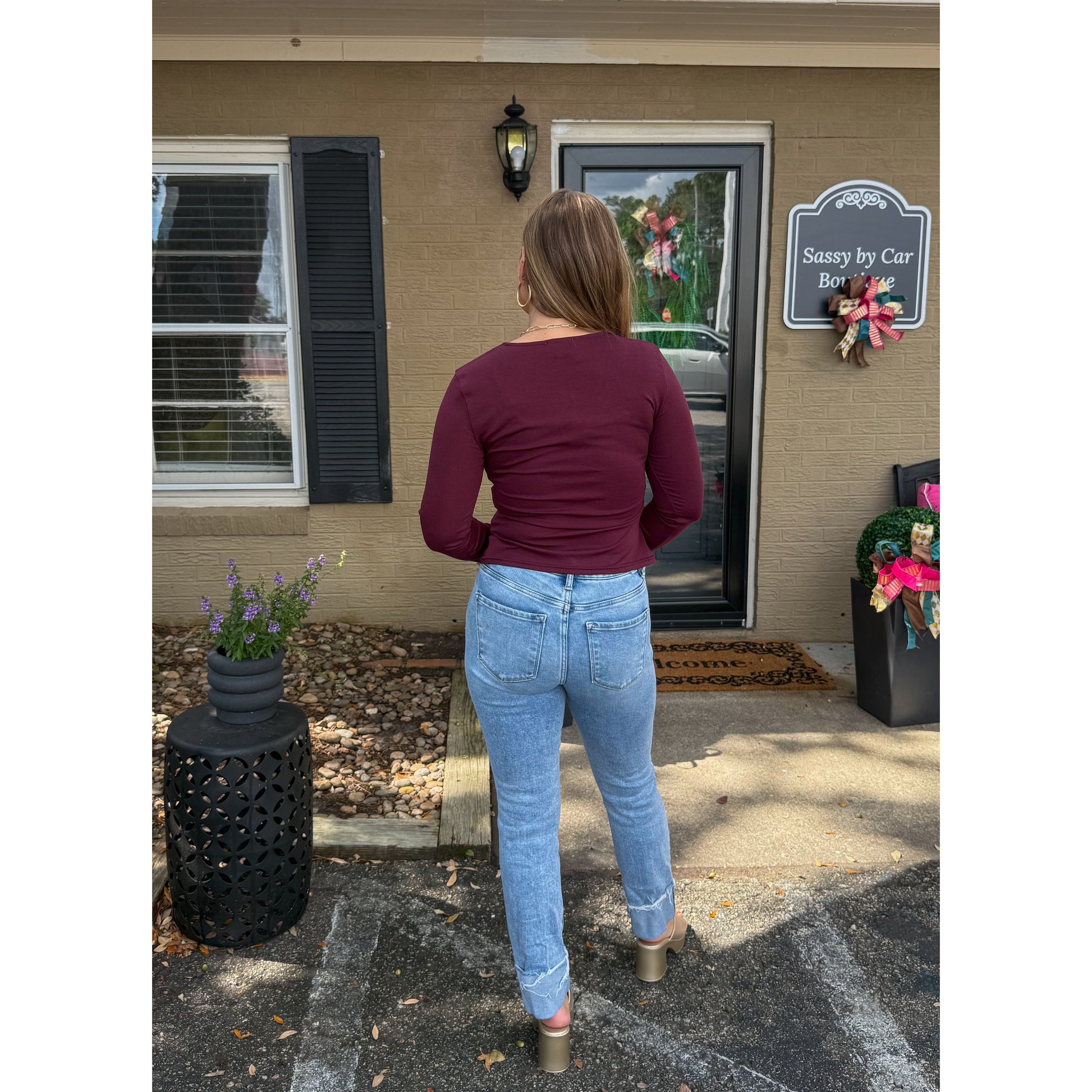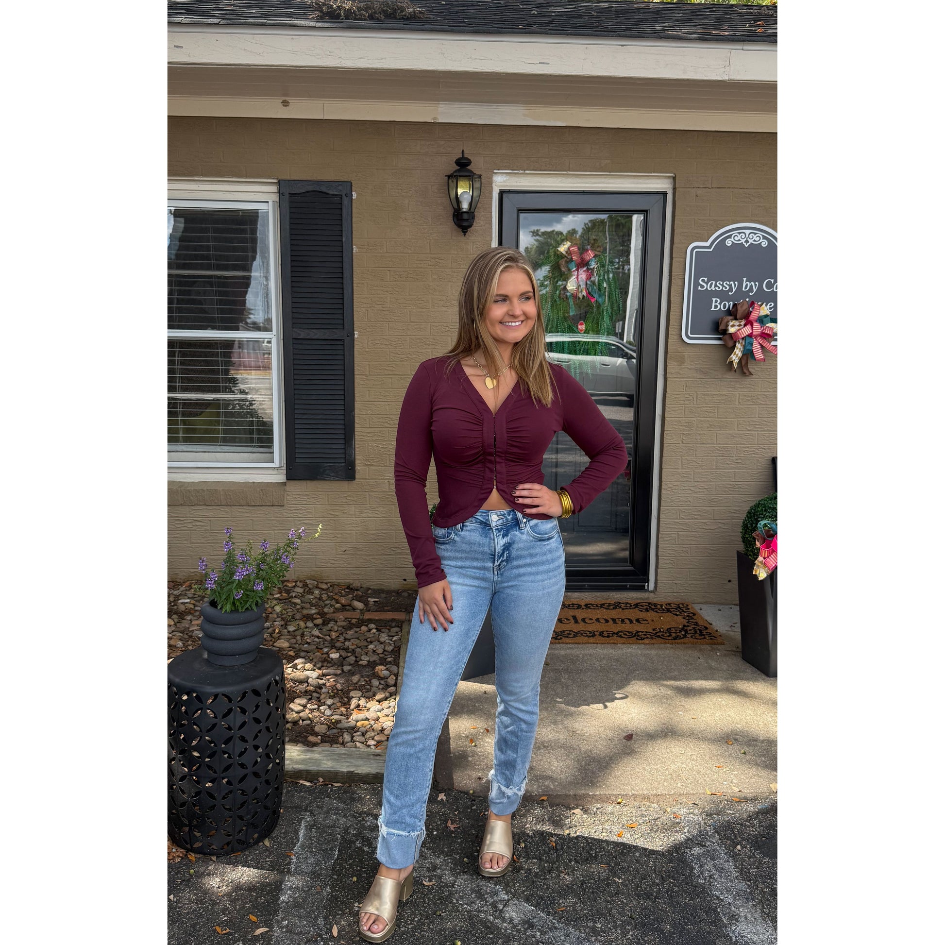 Y'all this top is a must. Long sleeve fitted top in maroon. Multi keyhole closure along the front of top with v-neckline.