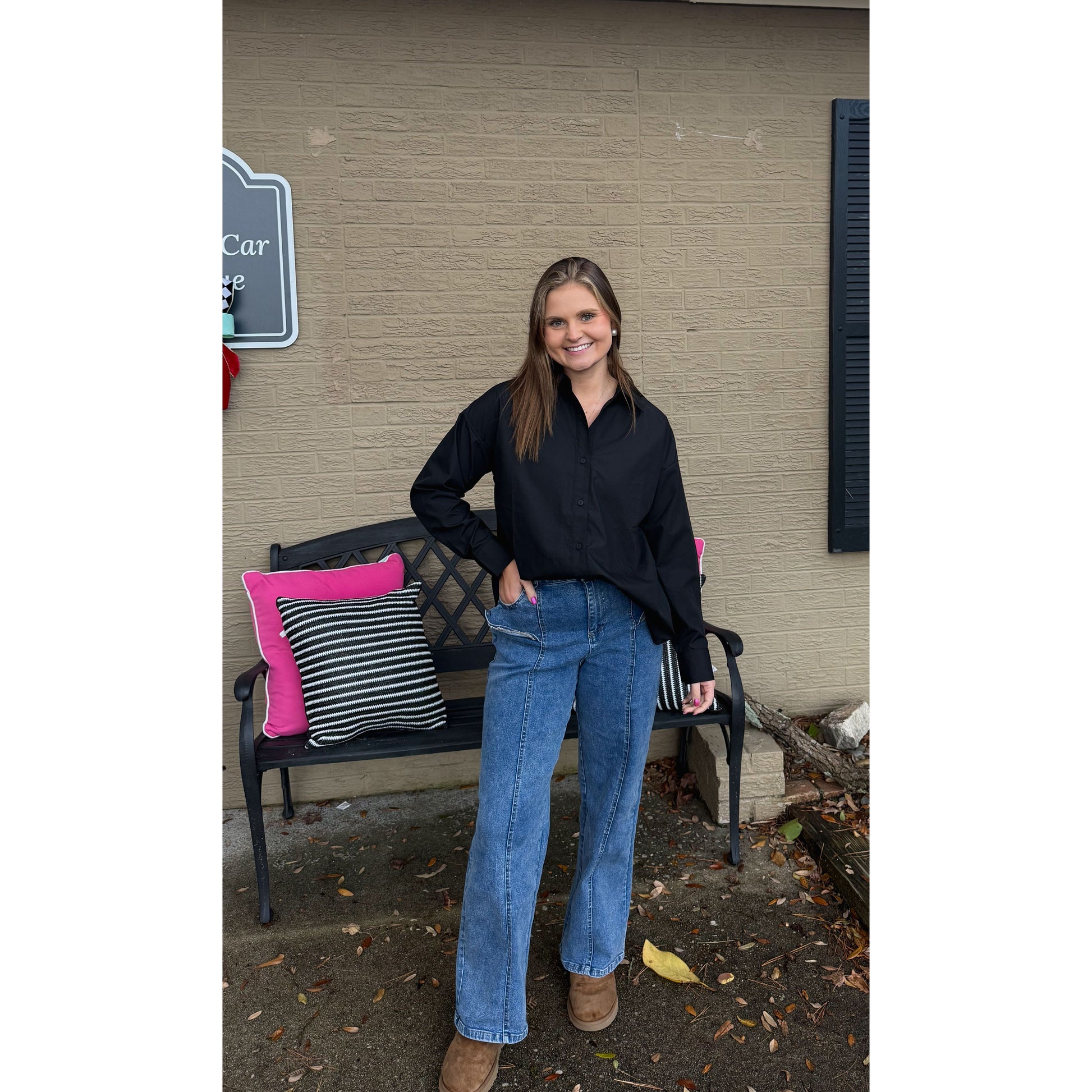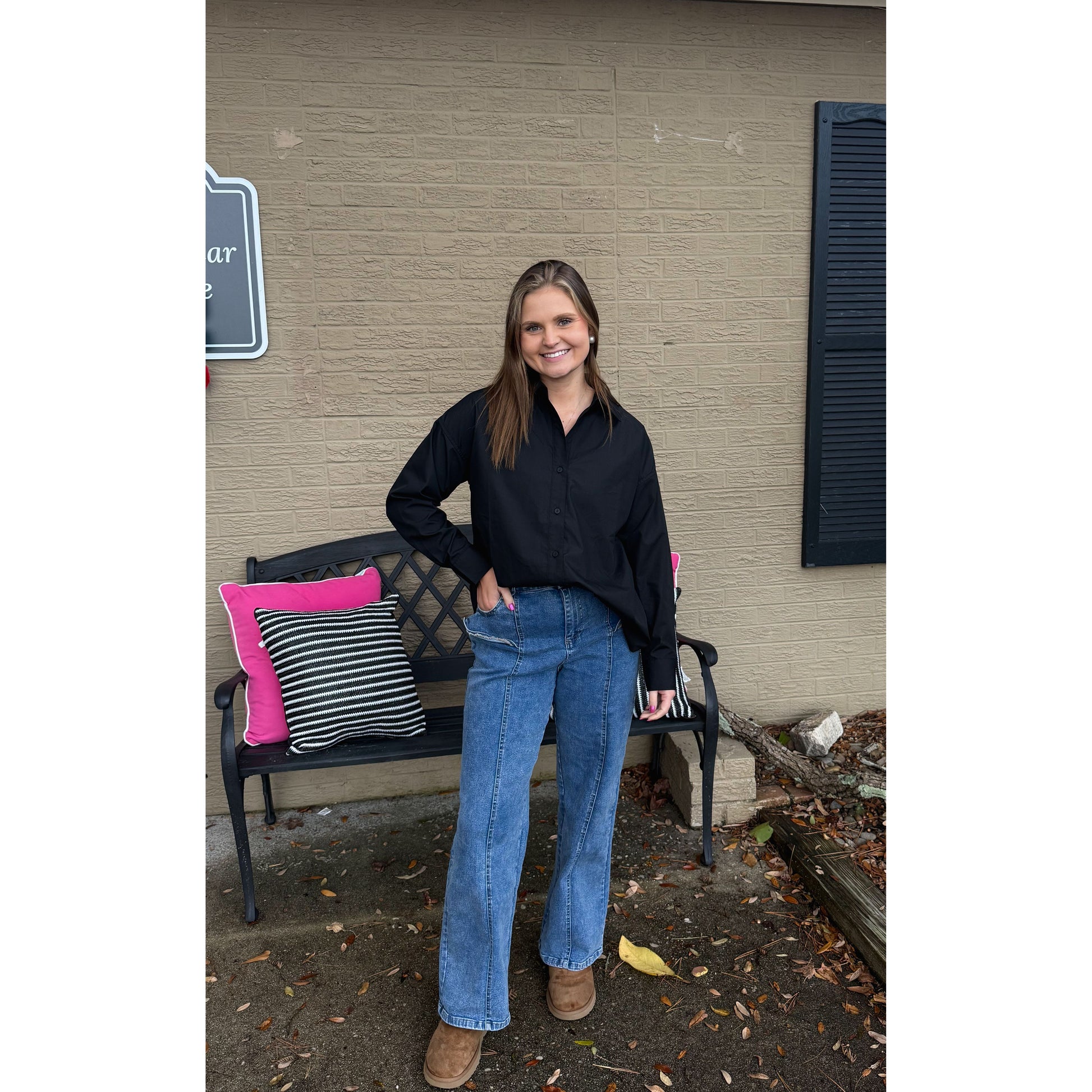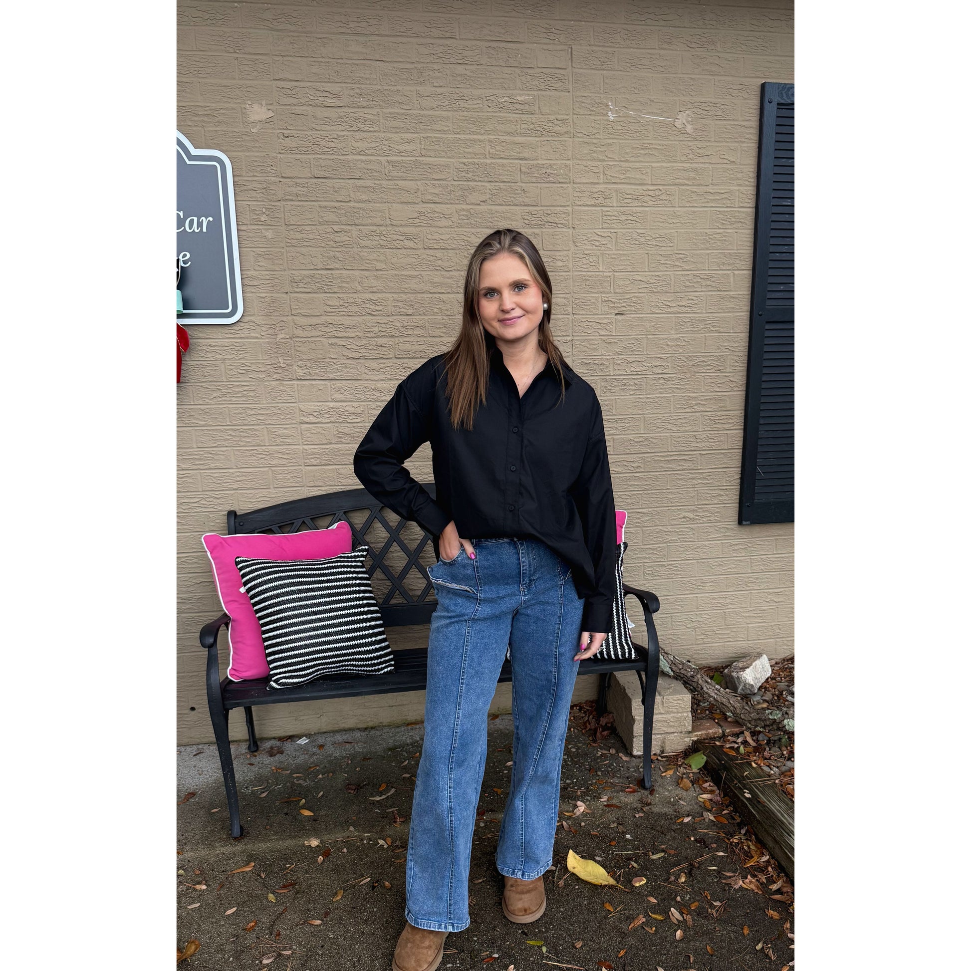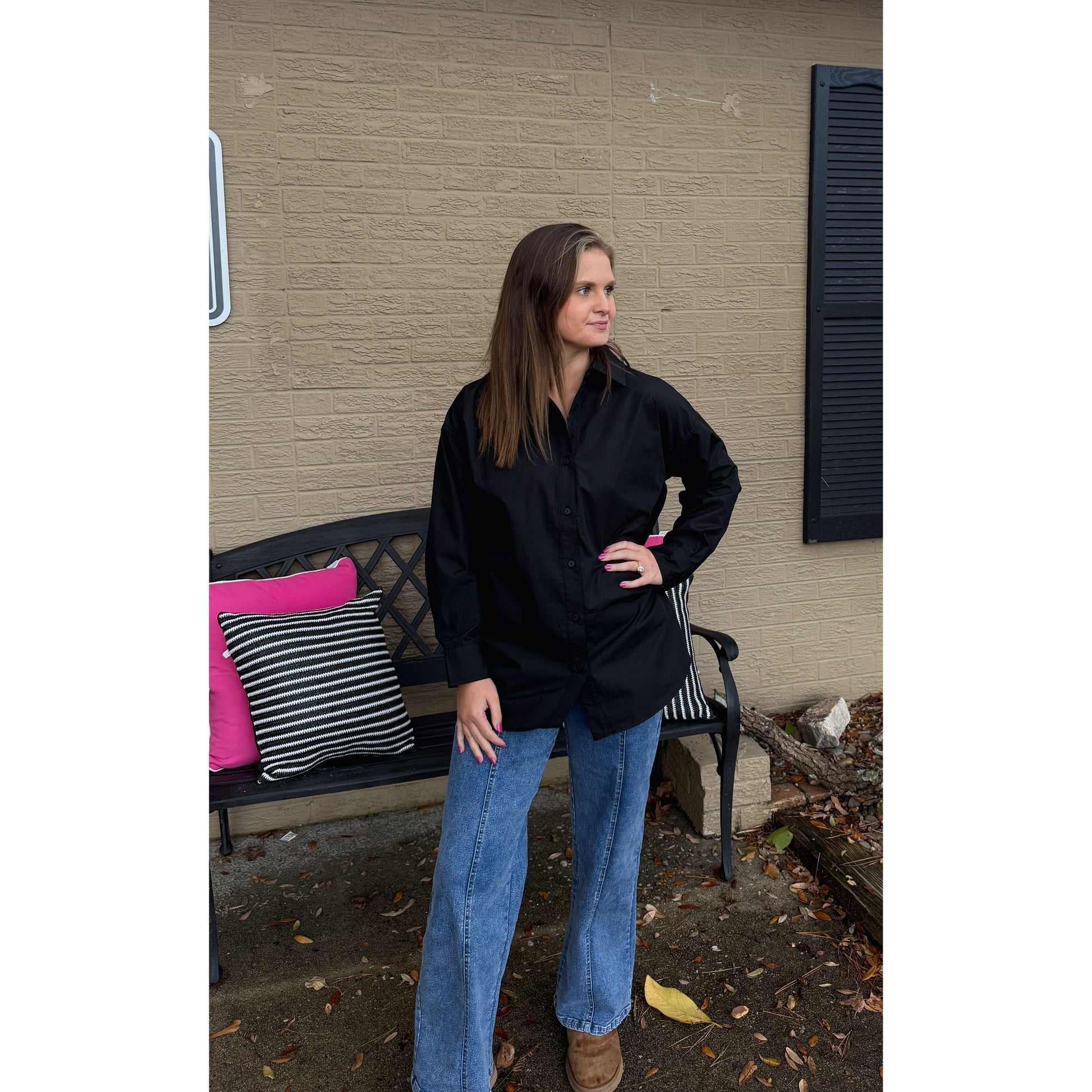 Black button down blouse. Great to layer or wear by itself. It is an oversized fit.