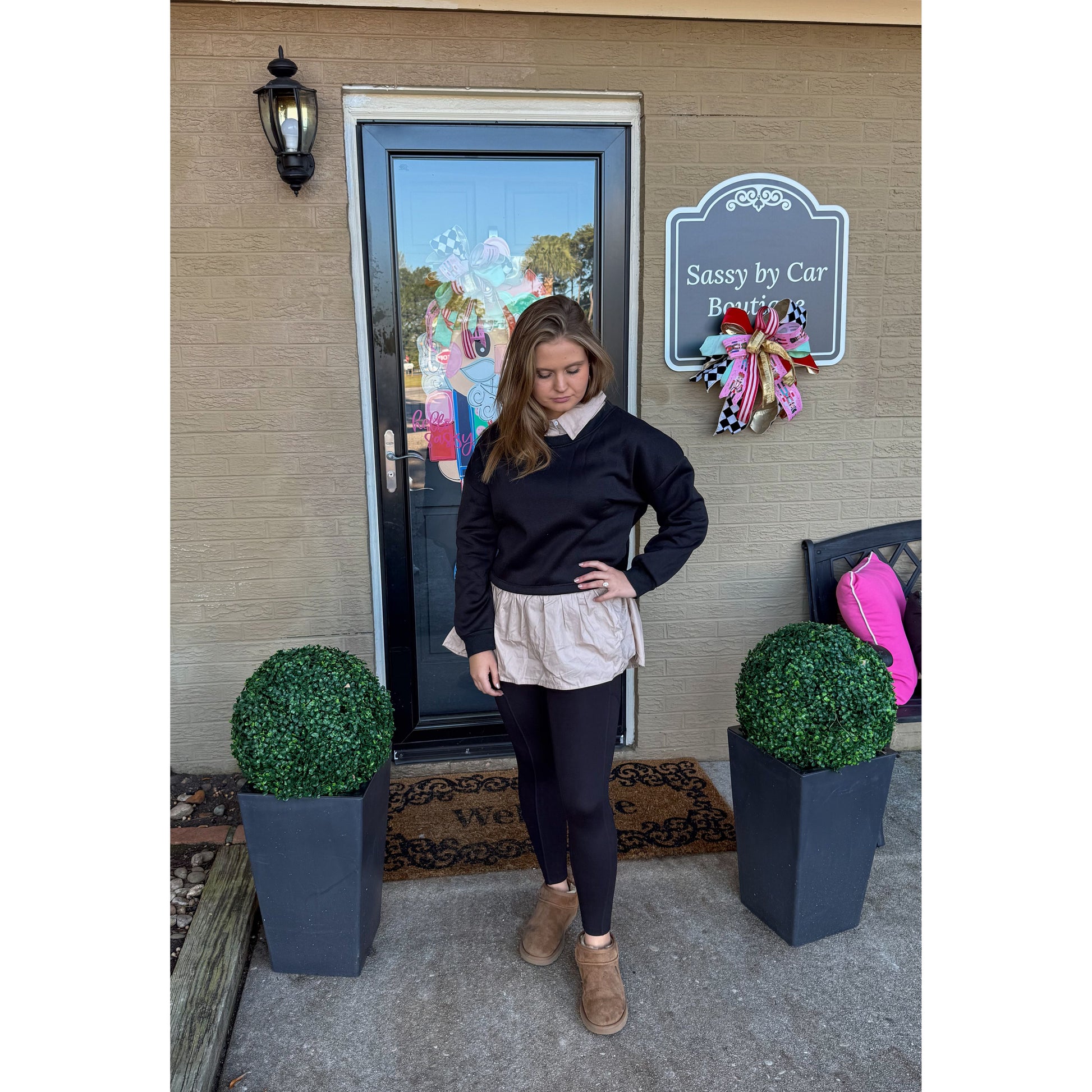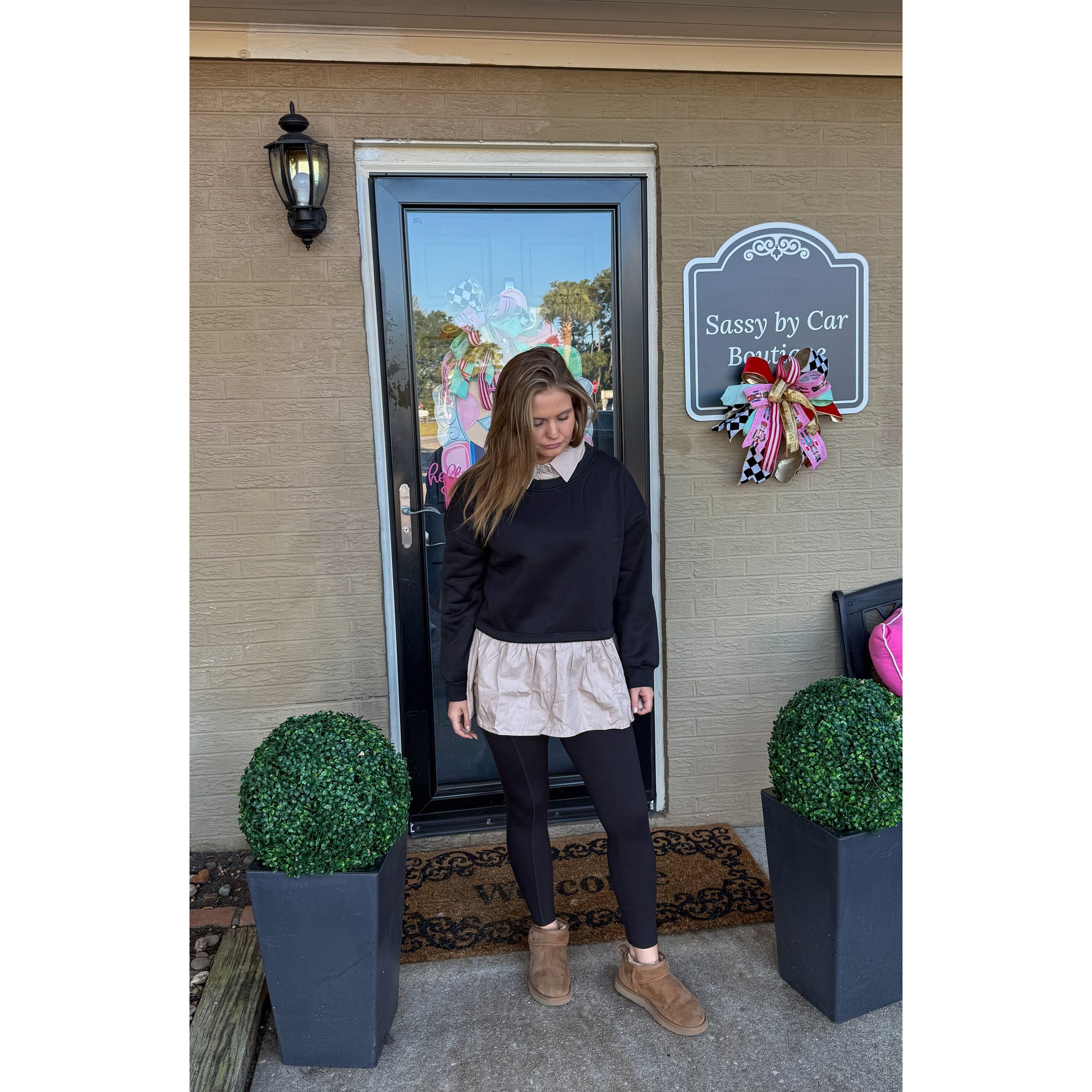 How cute is this top?! Great lounge top that can be dressed up or dressed down. Sweatshirt material then change of fabric along the hem and collar of top with taupe. Keyhole closure along the back of top. Sides of top have a string that you can make tighter along the waist. If you usually wear an XL, you can wear the L in this top.