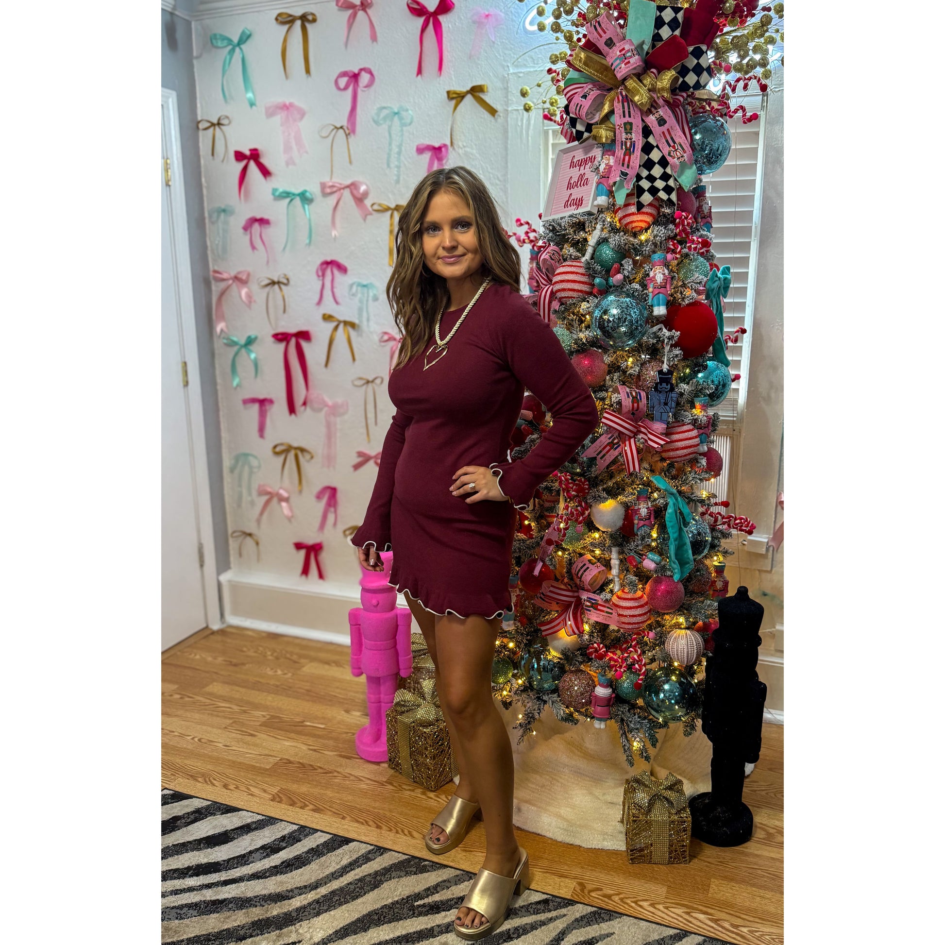 My personal fav! Burgundy sweater knit dress with ivory trim along the sleeves and hem of dress. Beautiful detail!