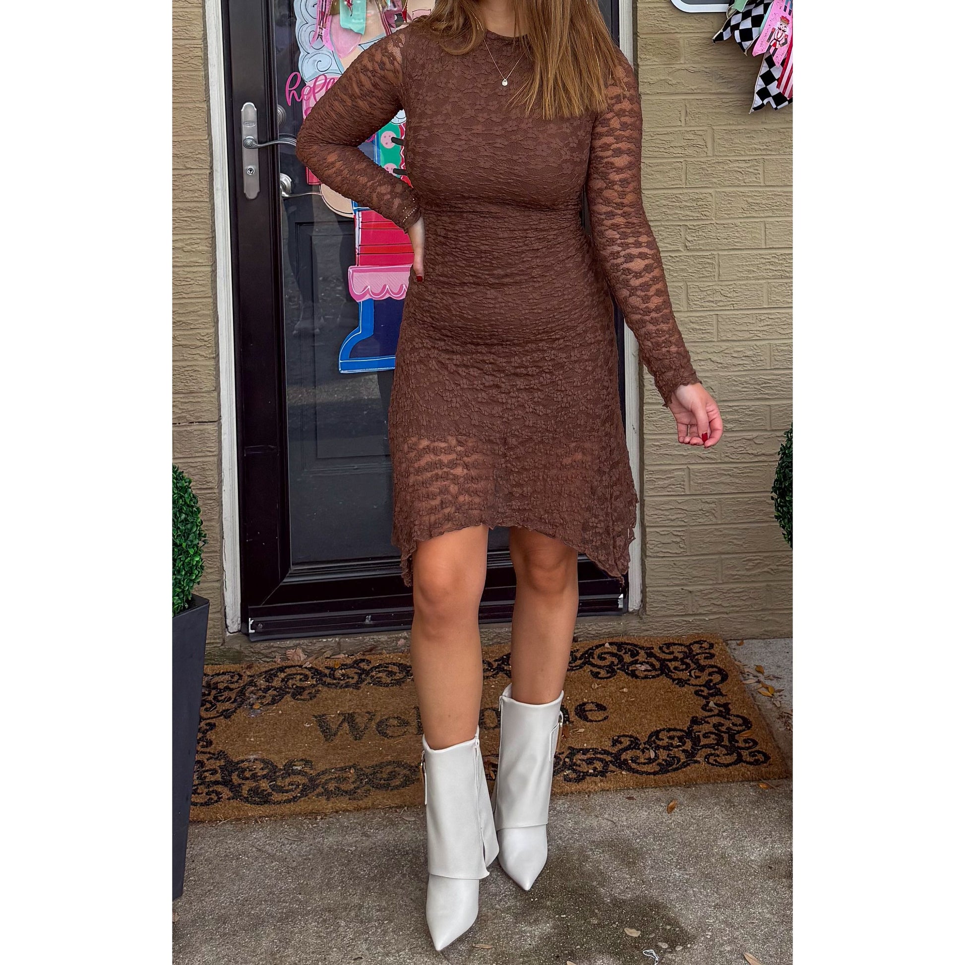 Stella Mesh Detail Mini Dress, Chocolate Brown