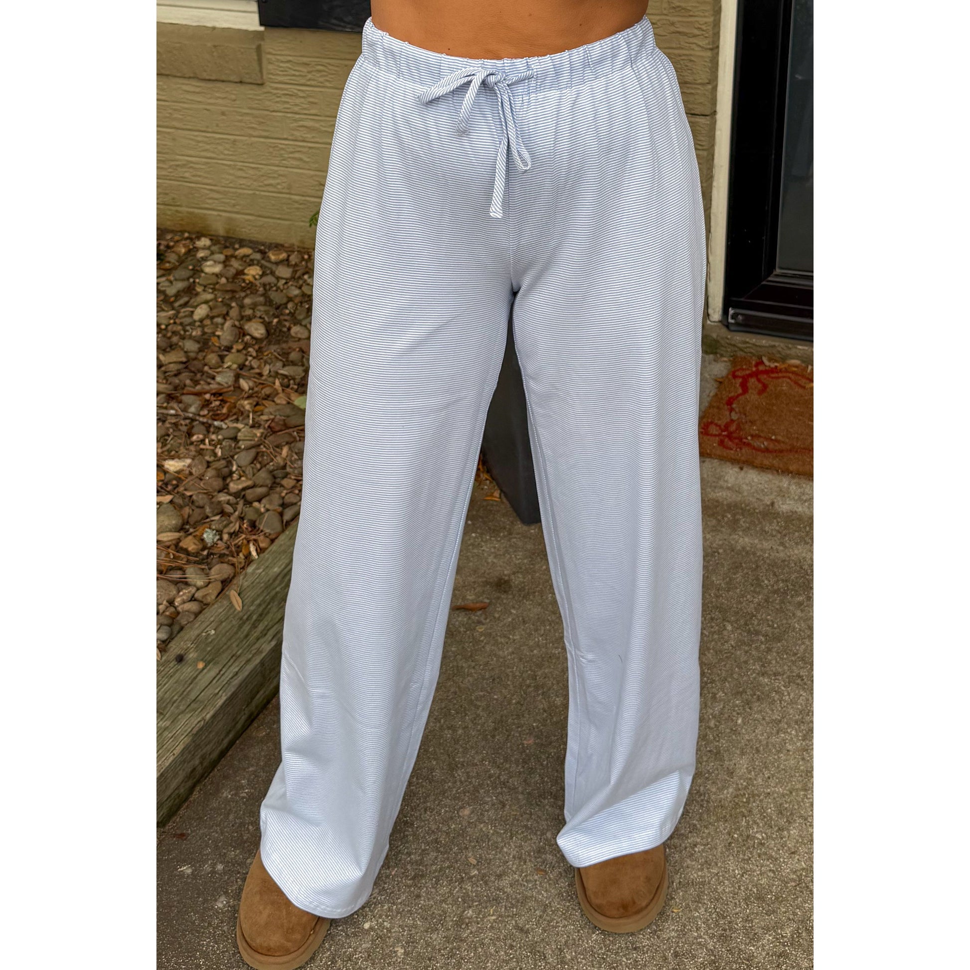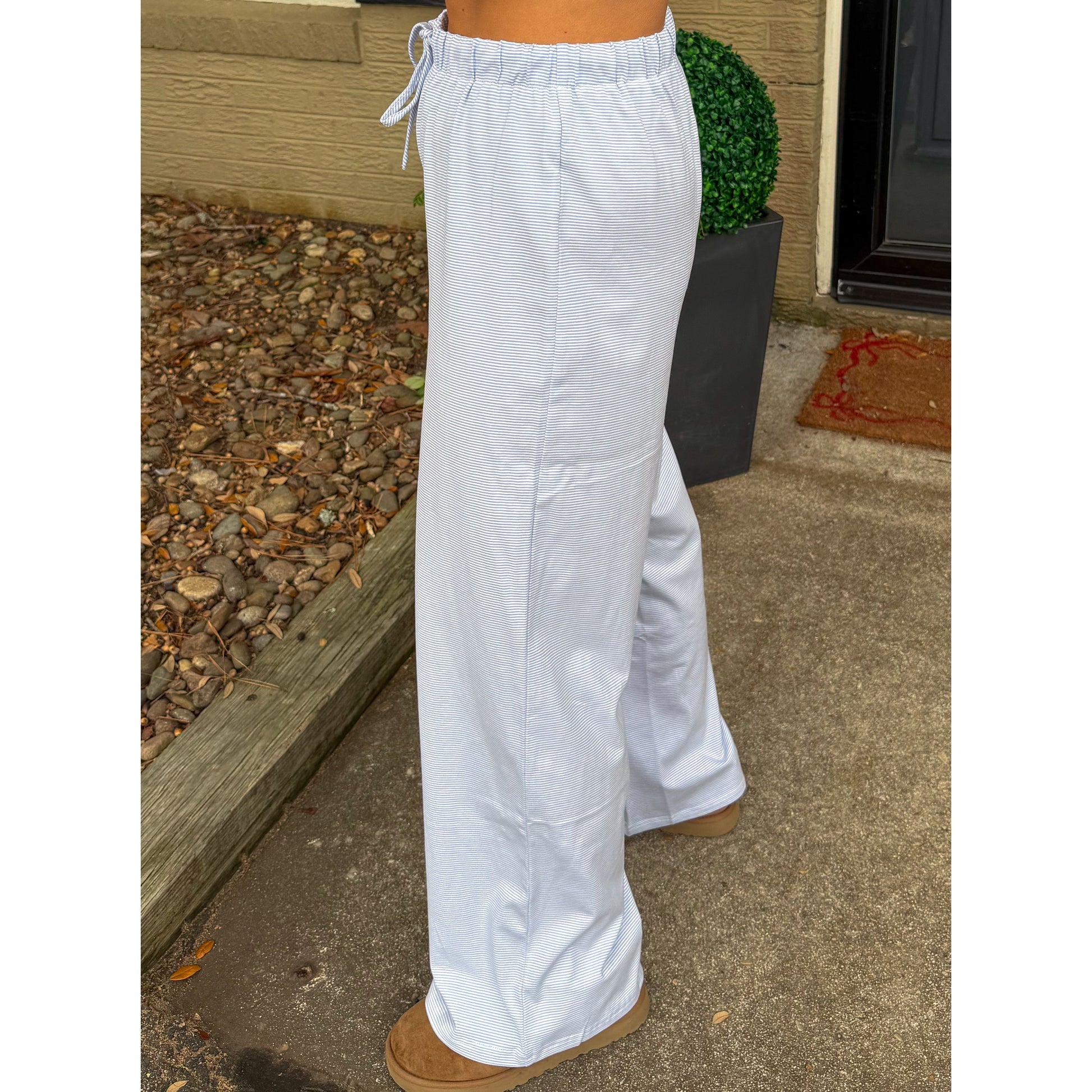 Light blue/white stripe detail yoga pants with an elastic waistband to make tighter or looser.