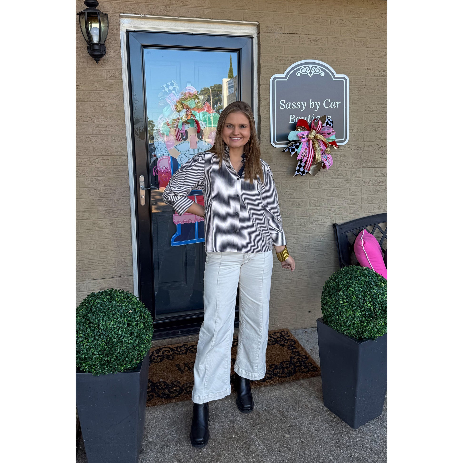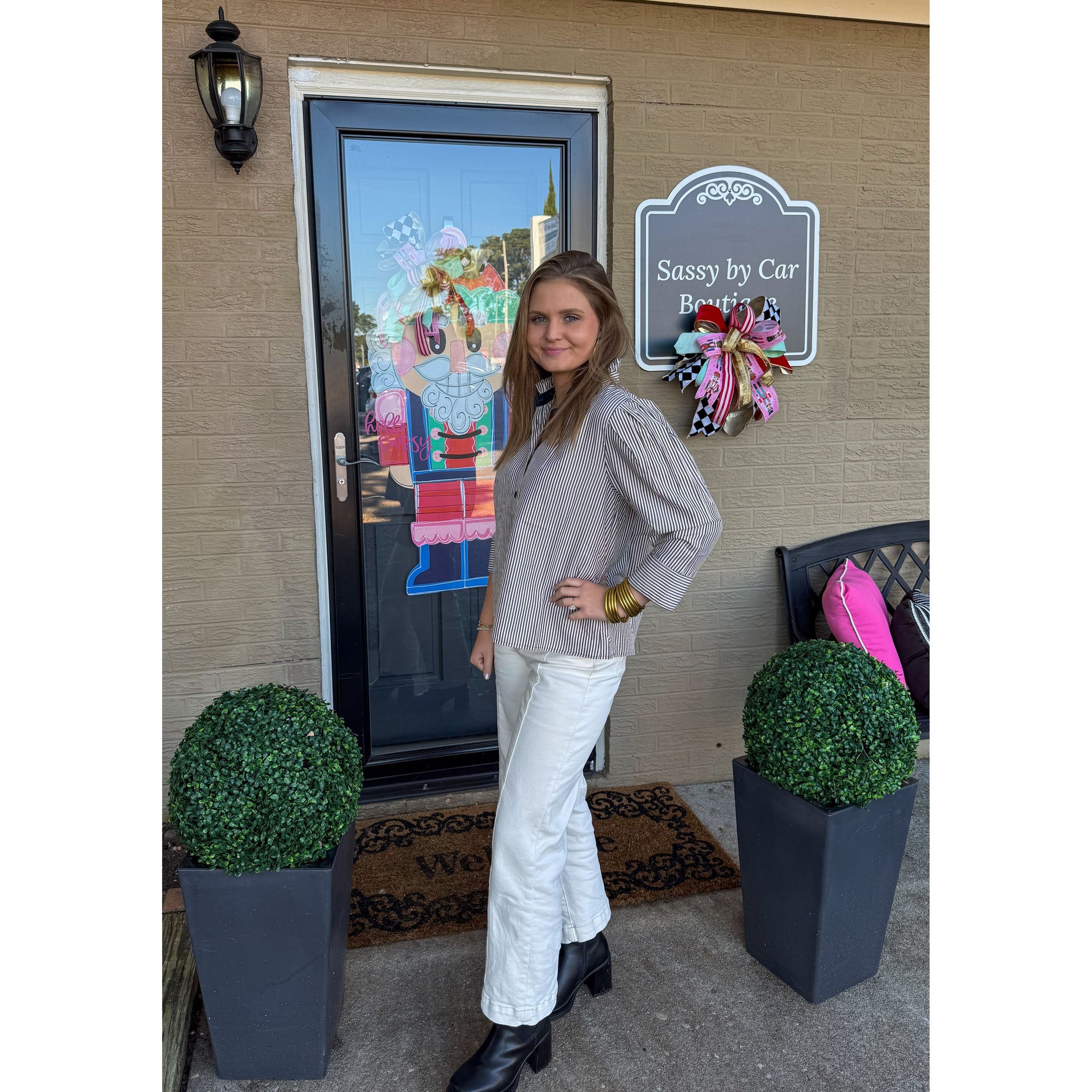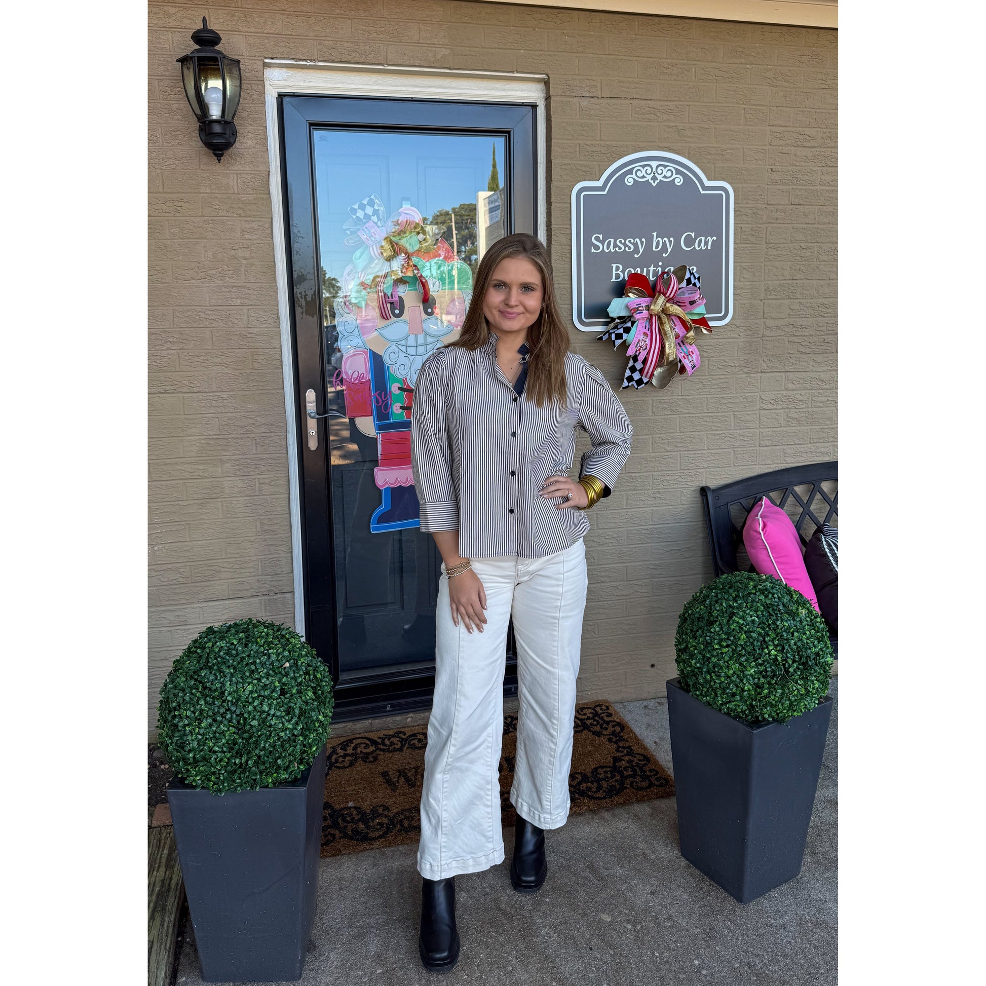 Navy/cream stripe blouse with ruffle collar detail. Button down detail.