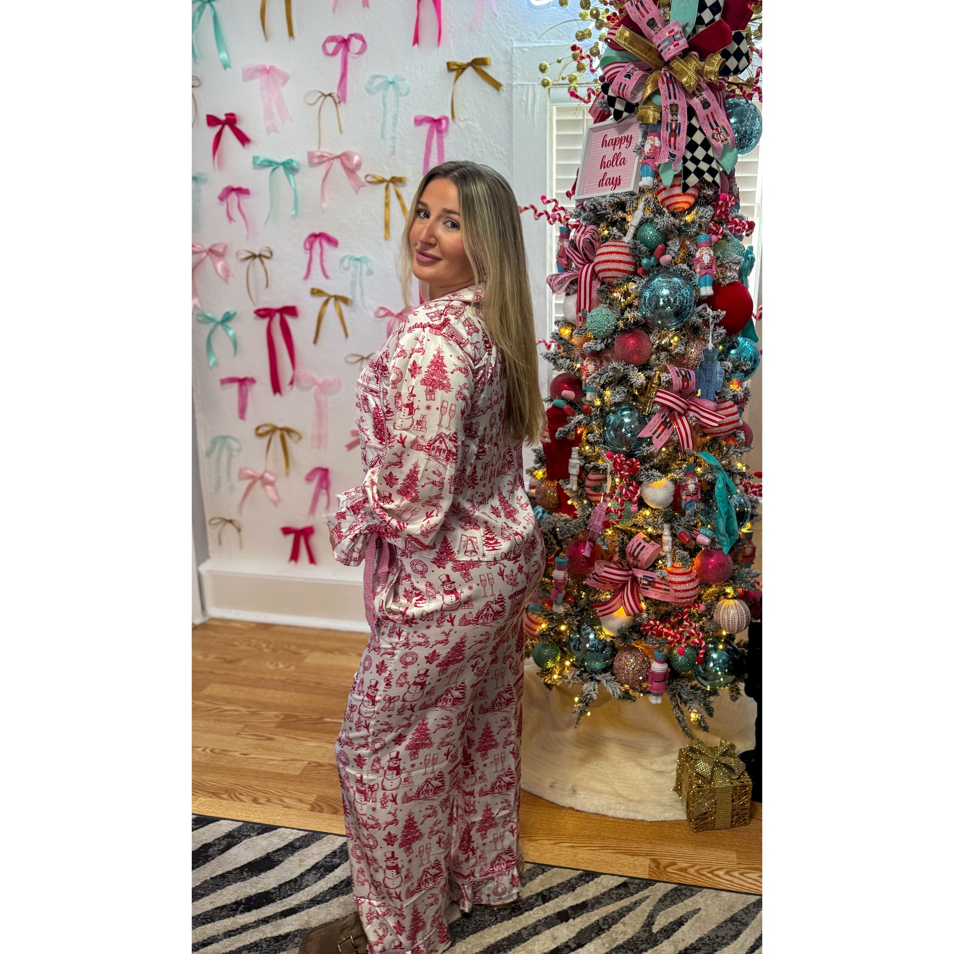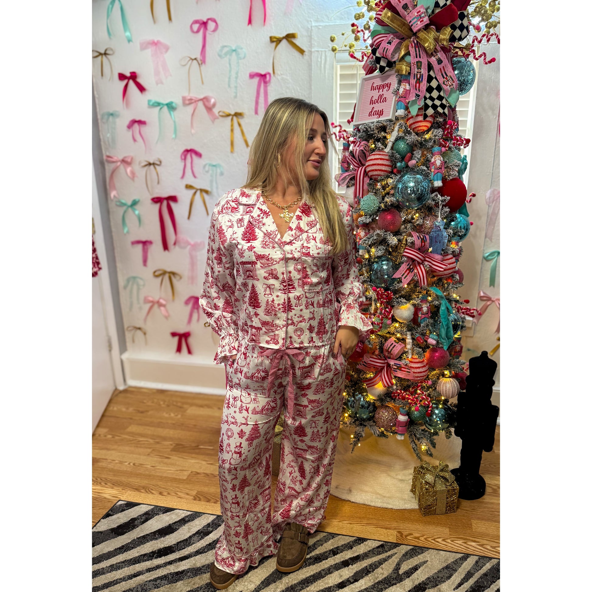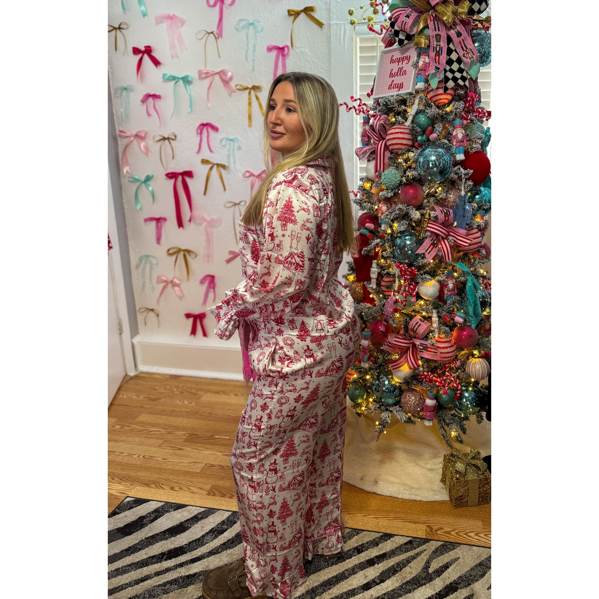 Red/ivory winter wonderland pj set. Long sleeve top with collar/button down detail. Pants have elastic waist and pockets.