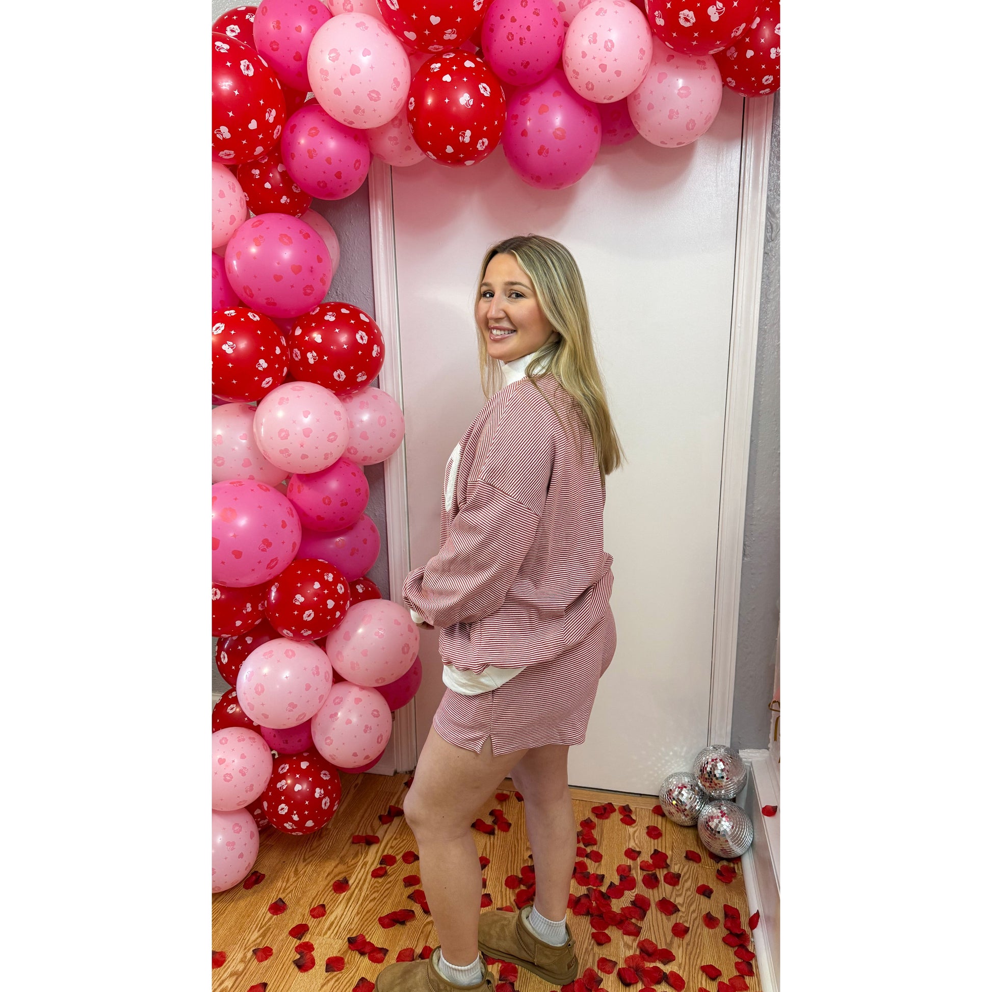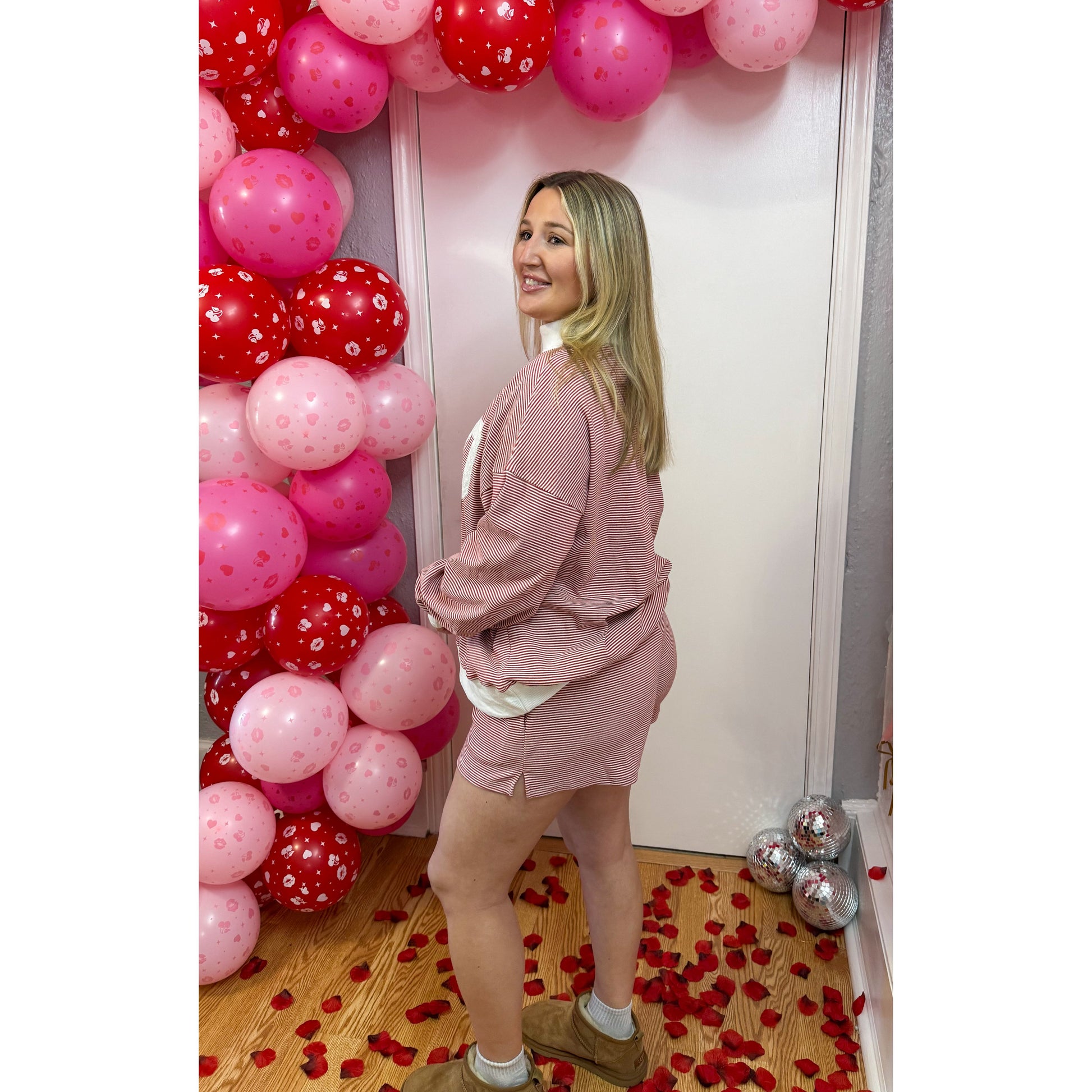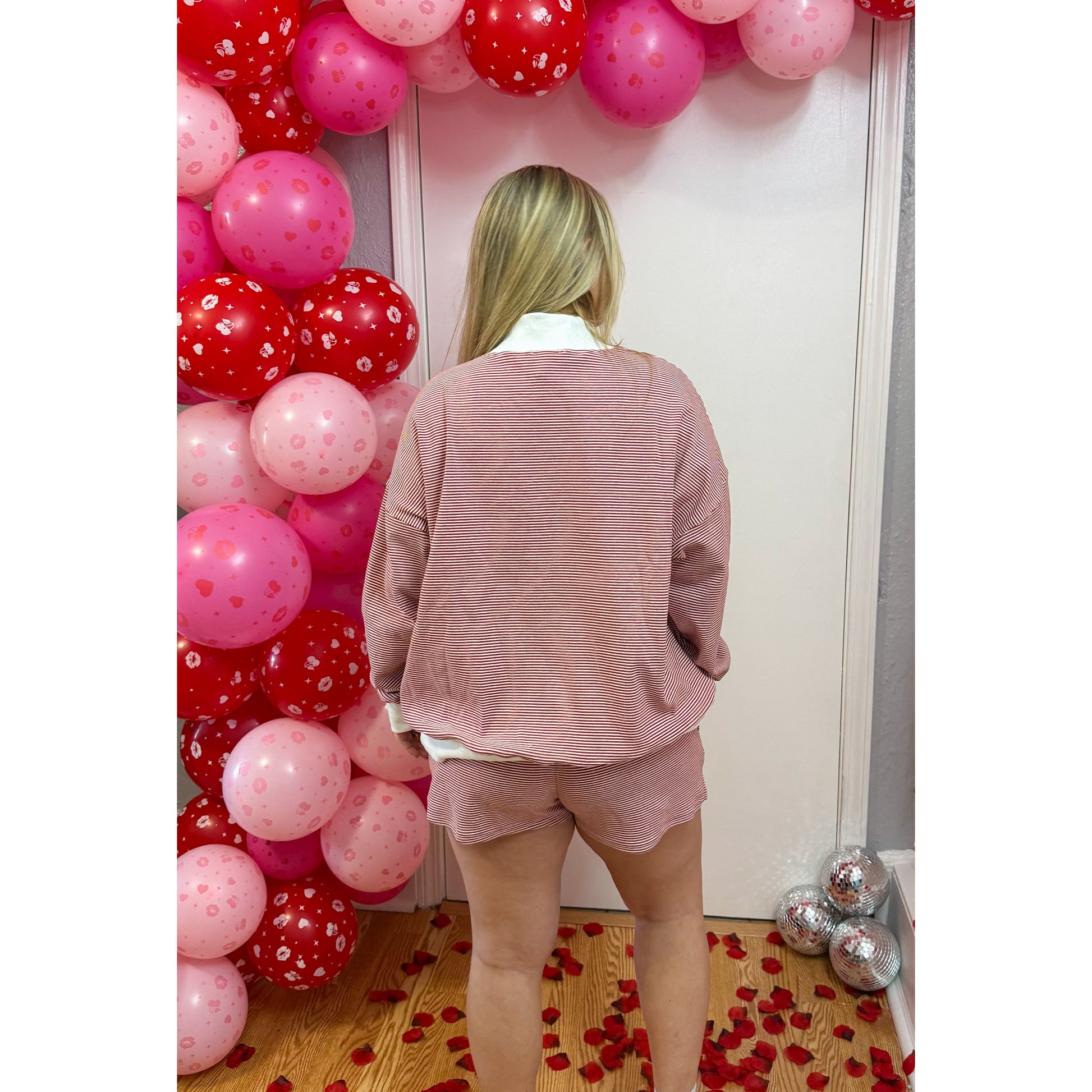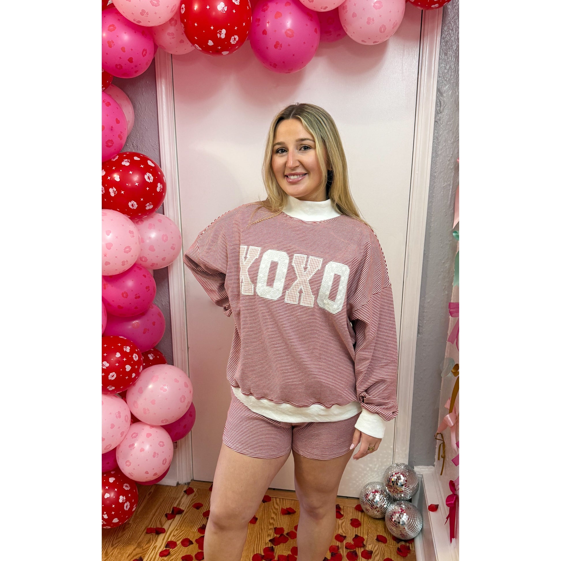 Red/white stripe lounge set - sold as a set. Top is long sleeve, looser fitting, red/white stripe pattern, faux turtleneck, white detail on the neck, sleeves, and hem of top, & the front of graphic has 'XOXO' in different fabrics. Matching shorts are fitted, elastic waistband, & pockets.