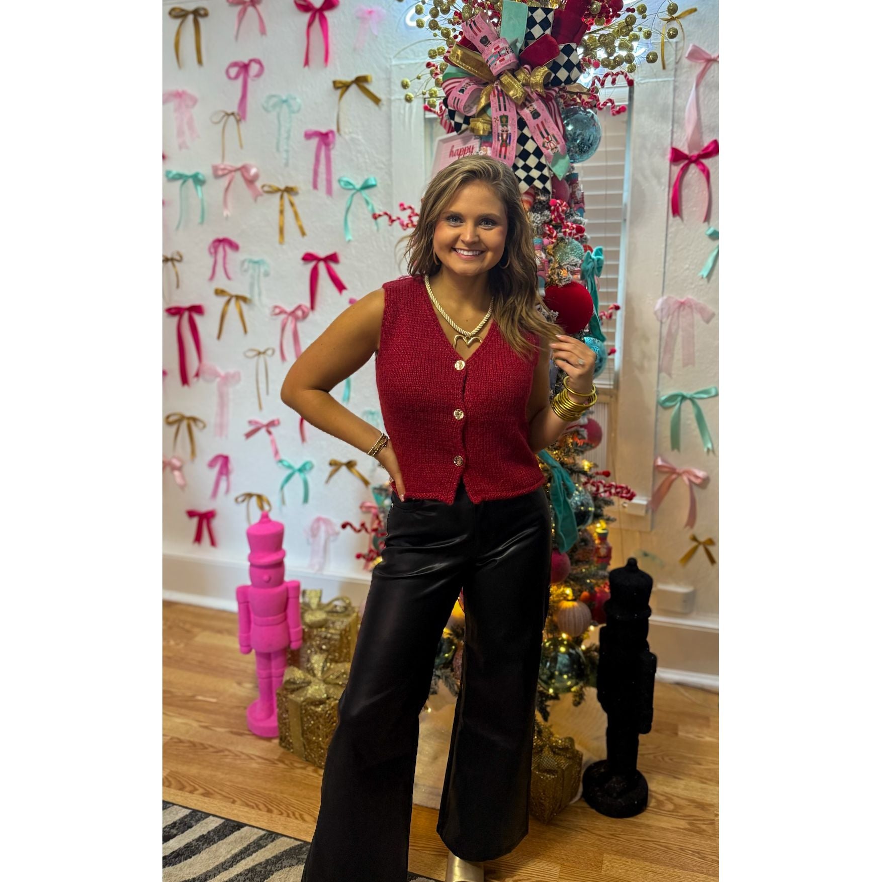 Sleeveless sweater knit metallic red top with 3 gold buttons.