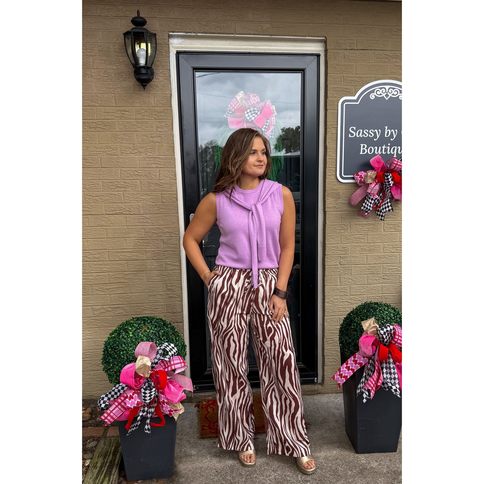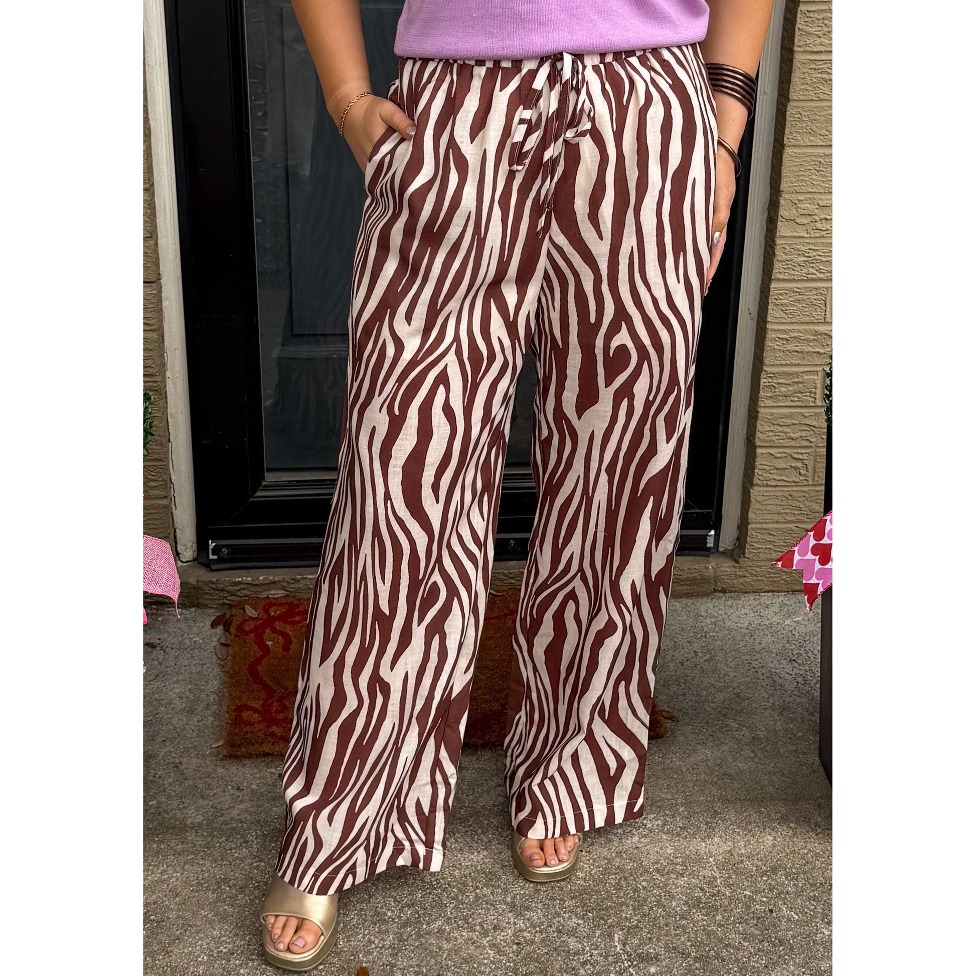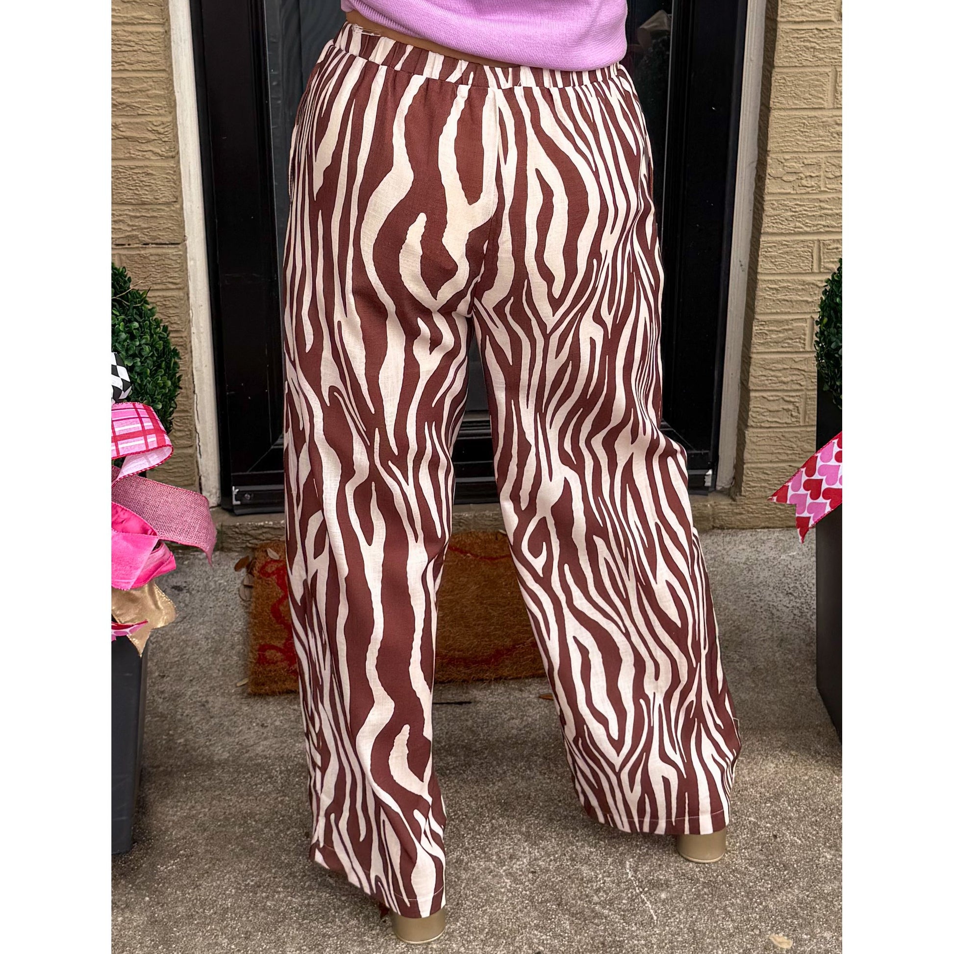 Brown/cream zebra print pattern pants. Loose fitting with wide leg detail. Pants have pockets, elastic waistband to make tighter/looser.